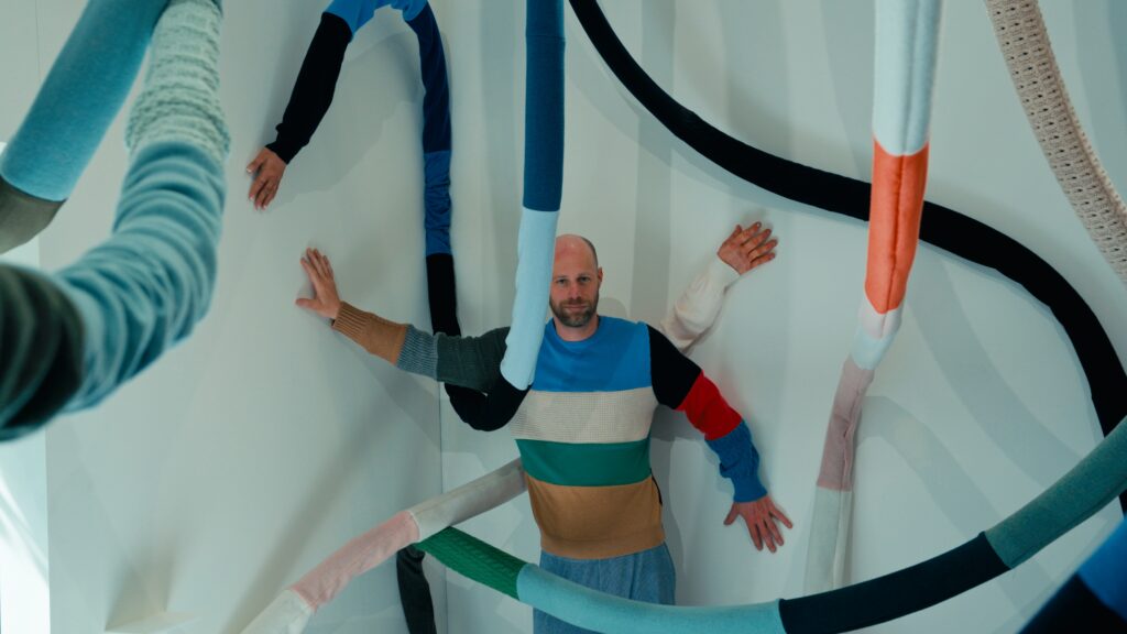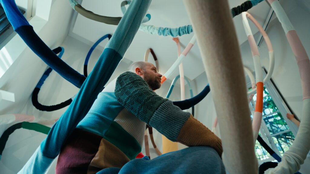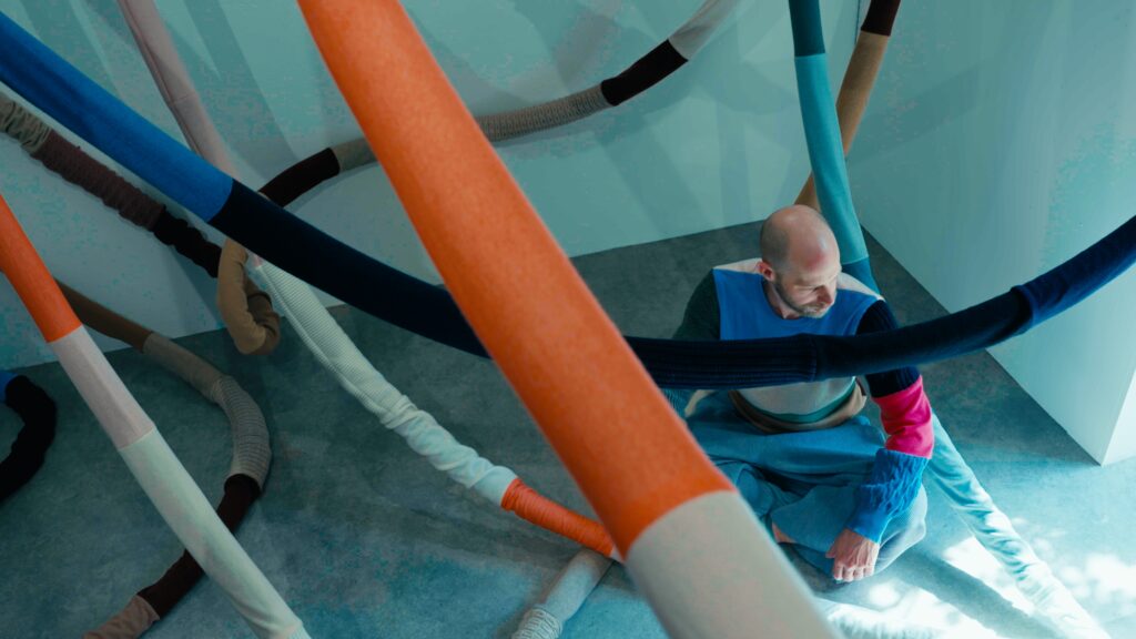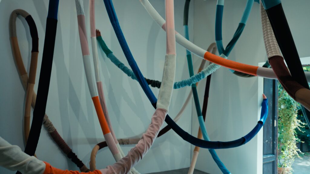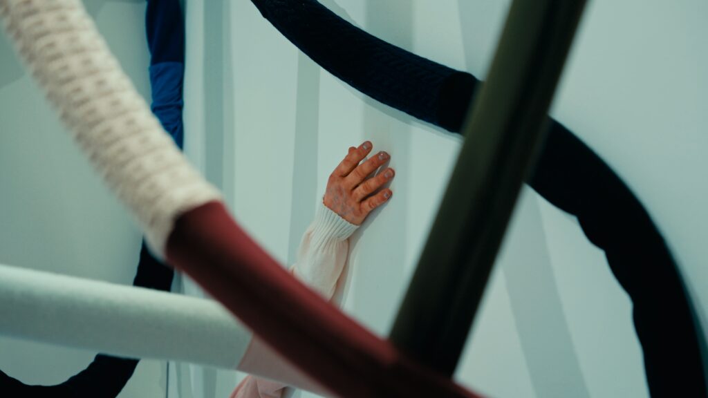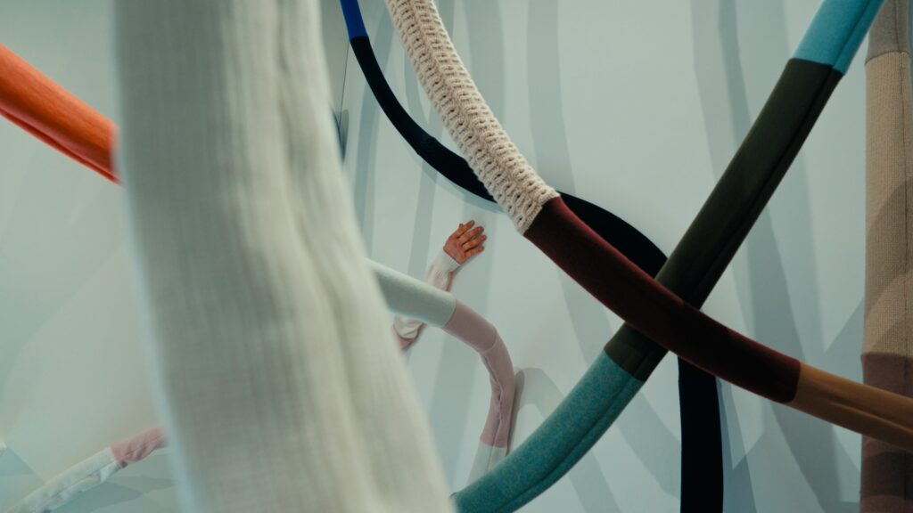 Le titre, Act of Embrace, ne relève pas d’une métaphore. Il décrit une condition. Le tricot, par nature, accompagne le corps : il s’adapte, protège, maintient une proximité constante. En élargissant cette propriété à l’échelle d’un espace, l’installation transforme une relation individuelle en expérience collective. L’étreinte devient environnement.