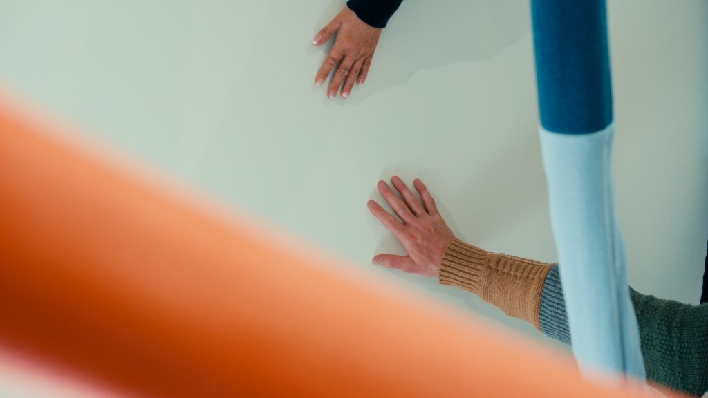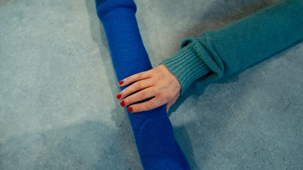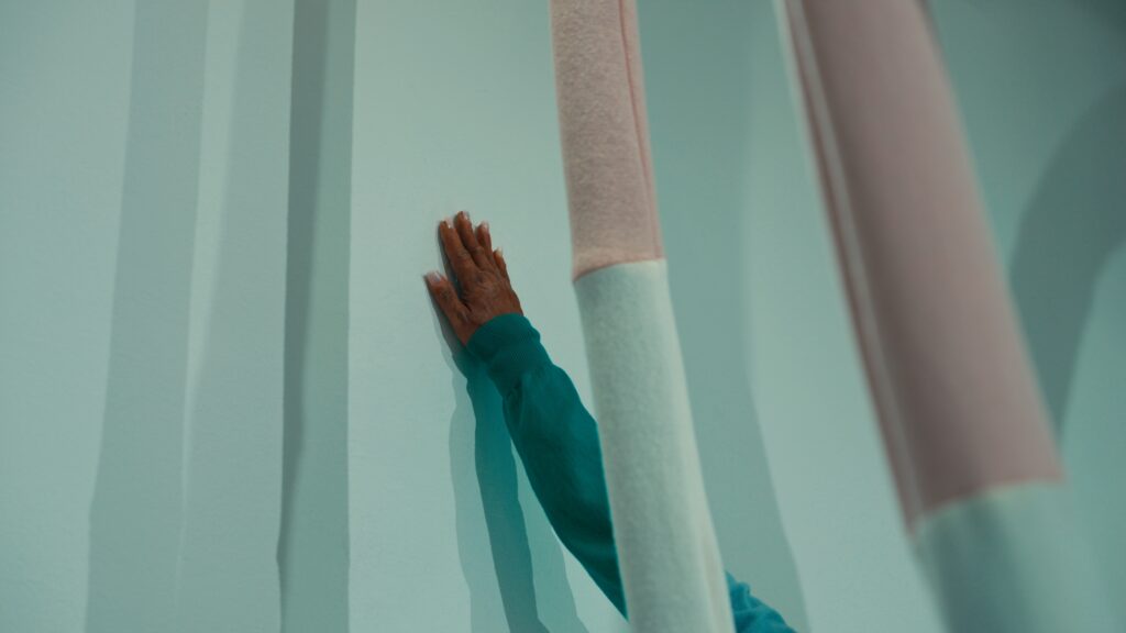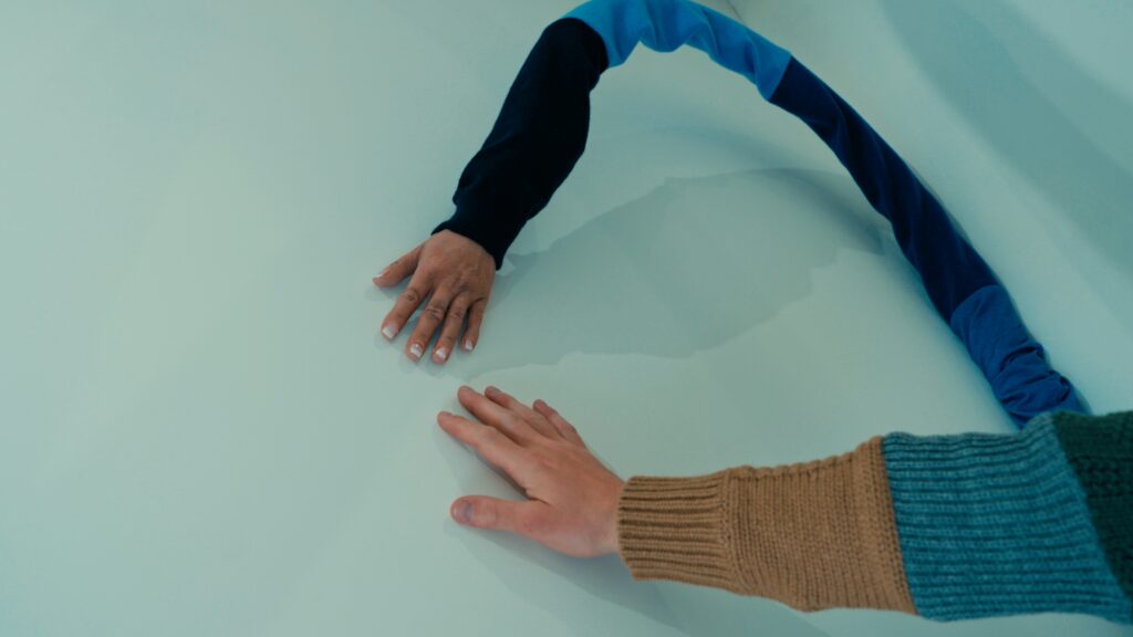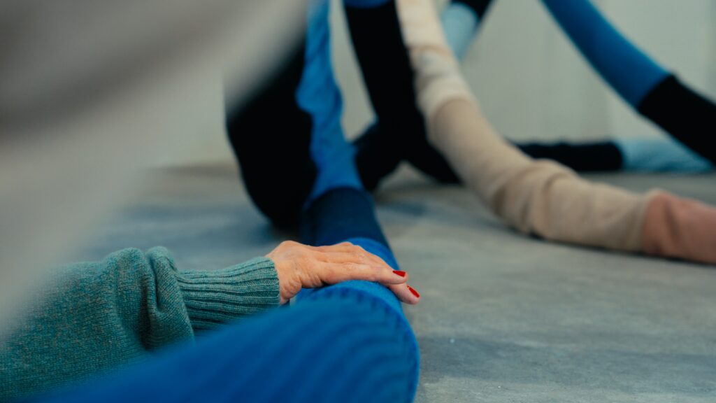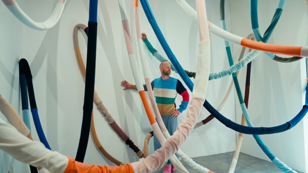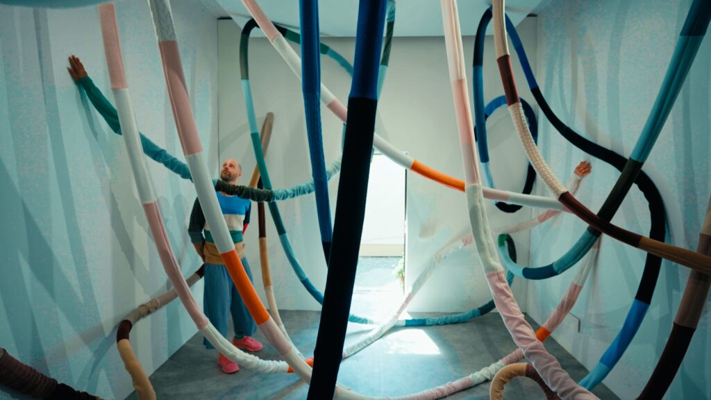 Le titre, Act of Embrace, ne relève pas d’une métaphore. Il décrit une condition. Le tricot, par nature, accompagne le corps : il s’adapte, protège, maintient une proximité constante. En élargissant cette propriété à l’échelle d’un espace, l’installation transforme une relation individuelle en expérience collective. L’étreinte devient environnement.