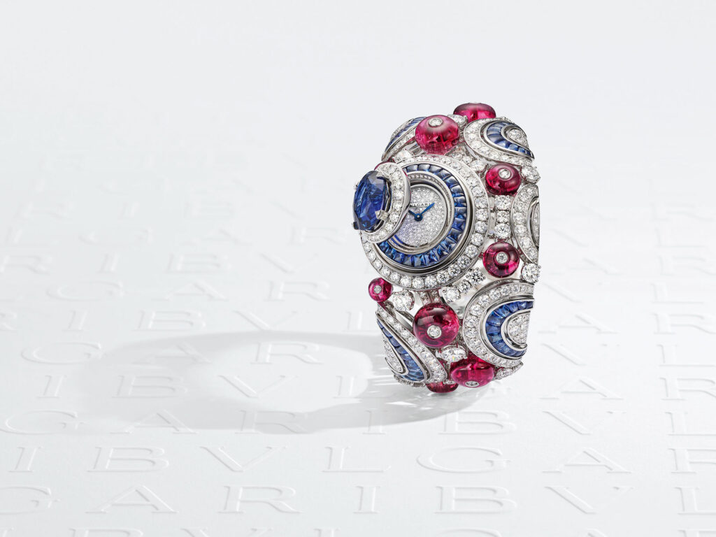 La montre Celestial Sky célèbre Rome, est une source d’inspiration éternelle pour Bvlgari. La nuance bleue vibrante du saphir ovale sri-lankais de 6 carats, qui éblouit sur cette extraordinaire montre à secret en platine. Courbes et des volumes audacieux, évoquant les motifs baroques, définissent le bracelet, où saphirs de forme fantaisie, diamants ronds et tourmalines en cabochon sont associés à un raffinement dans un équilibre gracieux et harmonieux qui garantit un ajustement confortable.
