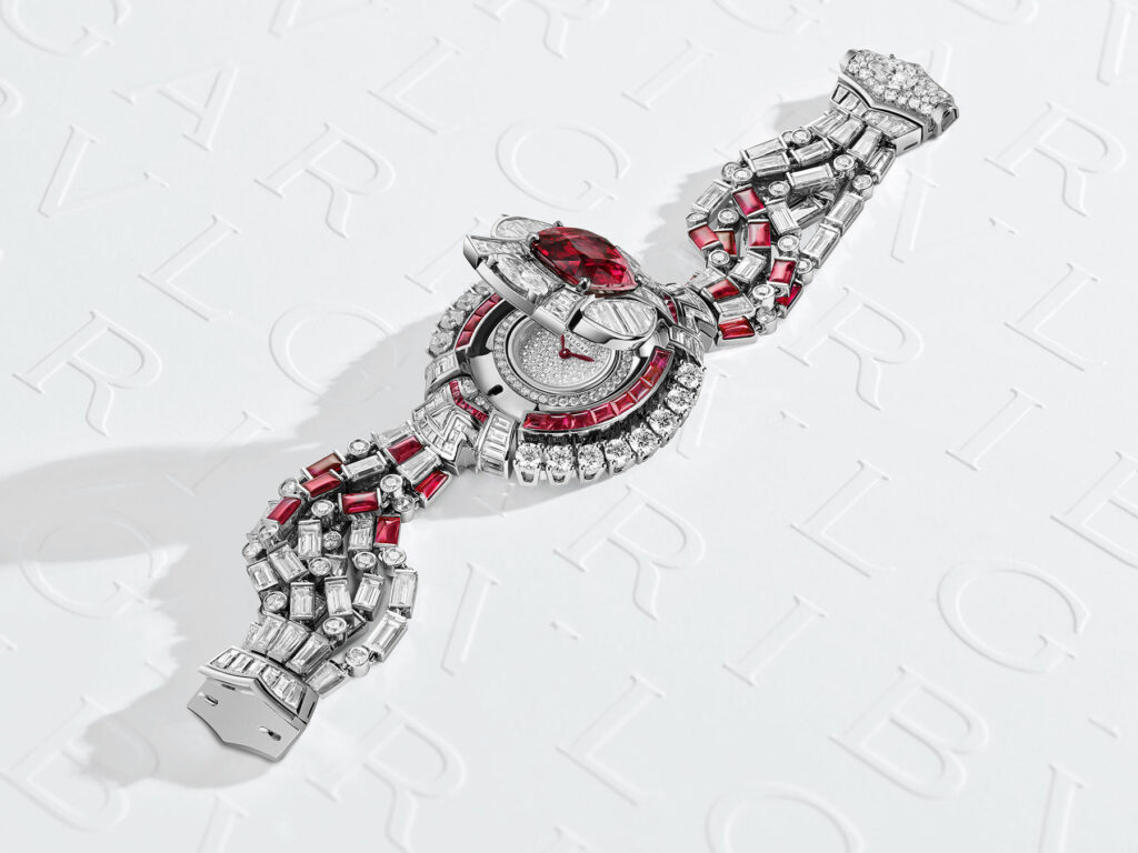La montre Ruby Metamorphosis a été conçue comme une parure avec son collier éponyme, pour incarner l’esprit audacieux, impertinent et sophistiqué du Joaillier de l’époque romaine. Fabriquée en platine, cette montre nécessite pas moins de 1 650 heures de travail. Elle possède un cadran dissimulé sous un couvercle coiffé d’un rubis du Mozambique de 6,3 carats , dont la couleur rouge intense évoque les nuances d’un coucher de soleil italien. Le bracelet entour le poignet grâce à une construction mêlant rubis et diamants taille baguette, sertis pour permettre une extrême souplesse. C’est la montre la plus chère que Bvlgari est créé.