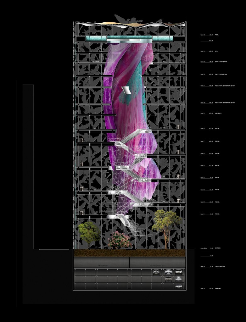 Lyricism and expressionism are the structural system of the tower. On the first floor, there was no commercial activity but only the staging of the four seasons. Winter frosts on the ground, in Spring a floral parterre, in Summer a lush vegetation and in Autumn a dry tree composition. Each year would have been interpreted with an urban voyeurism because totally visible from the street by the huge glass panels.
