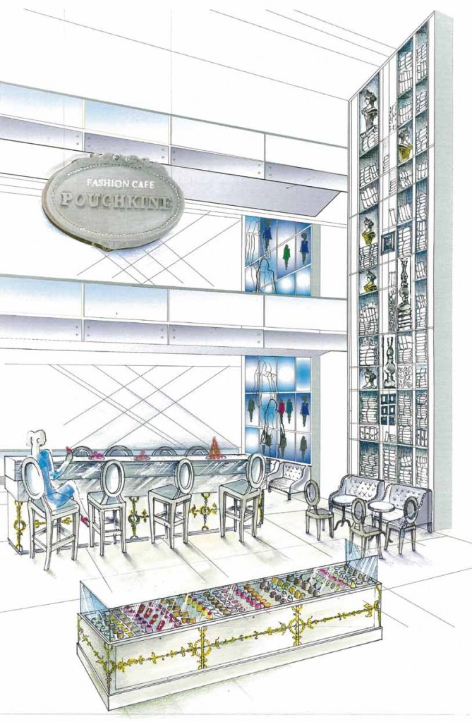 Serge Bramly’s film narrating the fiction is shown at Fashion Café Pouchkine in the store’s basement, a unique ephemeral restaurant celebrating Fashion Week. Until March 26, Fashion Café Pouchkine offers succulent pastries developed for top designers (Chloe, Marni and Dries Van Noten), as well as images of the Paris fashion shows on the big screen.