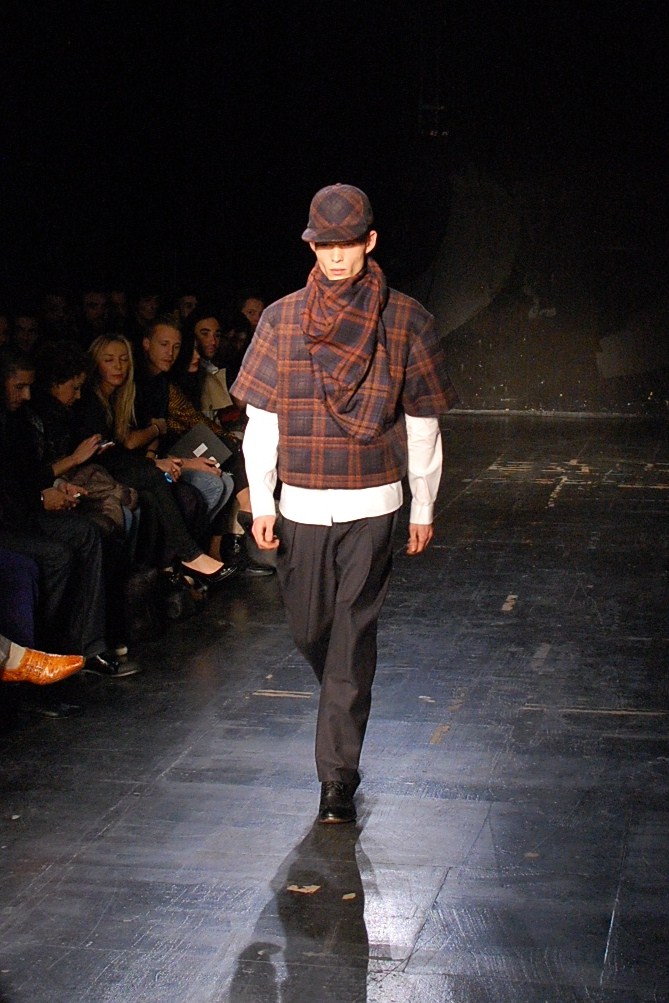 In a very dark setting, the men’s collection played with superimpositions. Long-sleeved tops in latex and black leather barely conceal white suit shirts. Tartan motifs are present on almost all pieces, molded into the leather or printed on the clip-on pants. Two ranges stand out, a darker one dominated by black, and a warmer orange-red one. Shirts are light, transparent, flowing sheers, again featuring tartan checks. Accessories include wide-visored caps and scarves draped lightly around the neck. Particular attention is paid to long skirts, reminiscent of Asian designers’ draping.