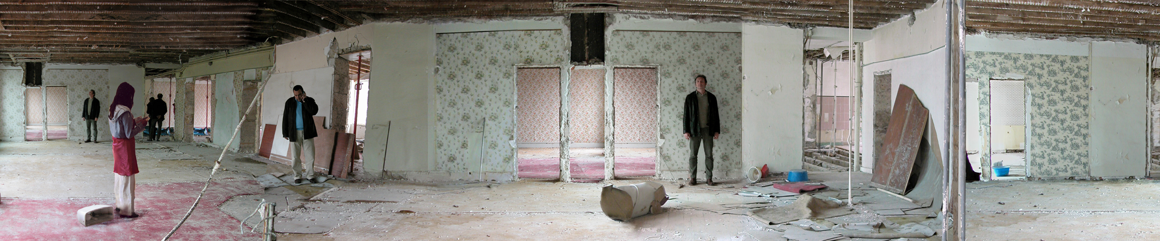 To stage this limit, the artist sought to create a tracking effect that prolongs this moment of “the end of a world”. In cinema, the image is integrated within a succession of images, she stresses, I wanted to create images that show this space-time within a single image. And to bring out the fiction in this recomposed reality, the artist has not hesitated to superimpose images, as here, in this old hotel in Bourboule, awaiting reconstruction, a former place of passage whose rooms with torn tapestries bear witness to a bygone era. By taking snippets from this reality, Lisa Sartorio succeeds in recomposing a space that incorporates circular movement.