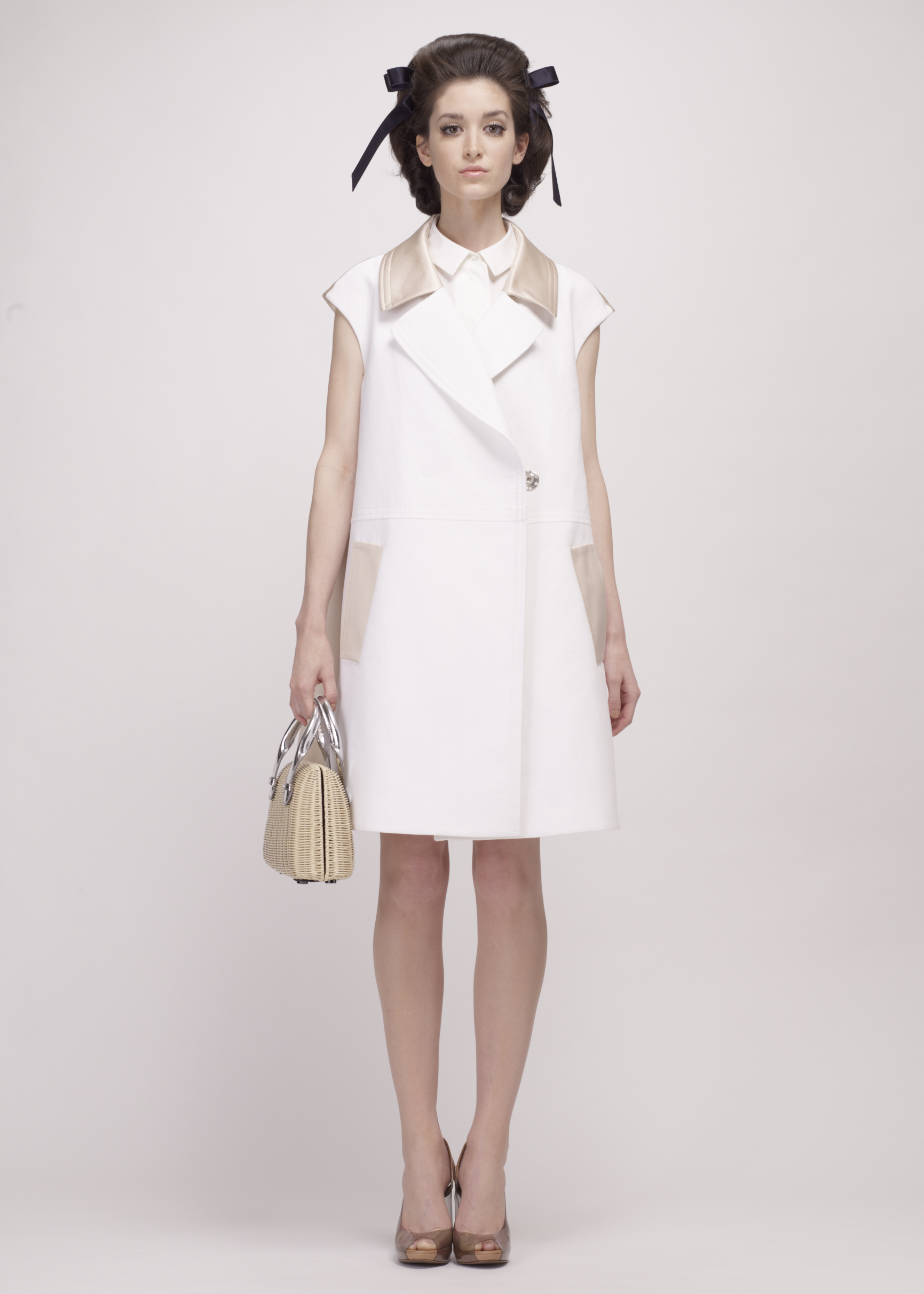 Color duality, first of all, as black and white set the tempo for this new fashion score, enlivened on certain pieces by the depth of garnet red. Then there’s the play of lines and materials, as the meticulously-crafted cuts revive the sixties DNA of a Jackie Onassis taking flight. The lightness of cotton piqué and the fall of duchesse satin merge, while blistered organza and the lacey spirit of guipure add an airy touch to the silhouette. Ostrich feathers also make an appearance in a collection where garments are transformed, playing equally well with daytime references and evening glamour, outdoor wear and lingerie details.