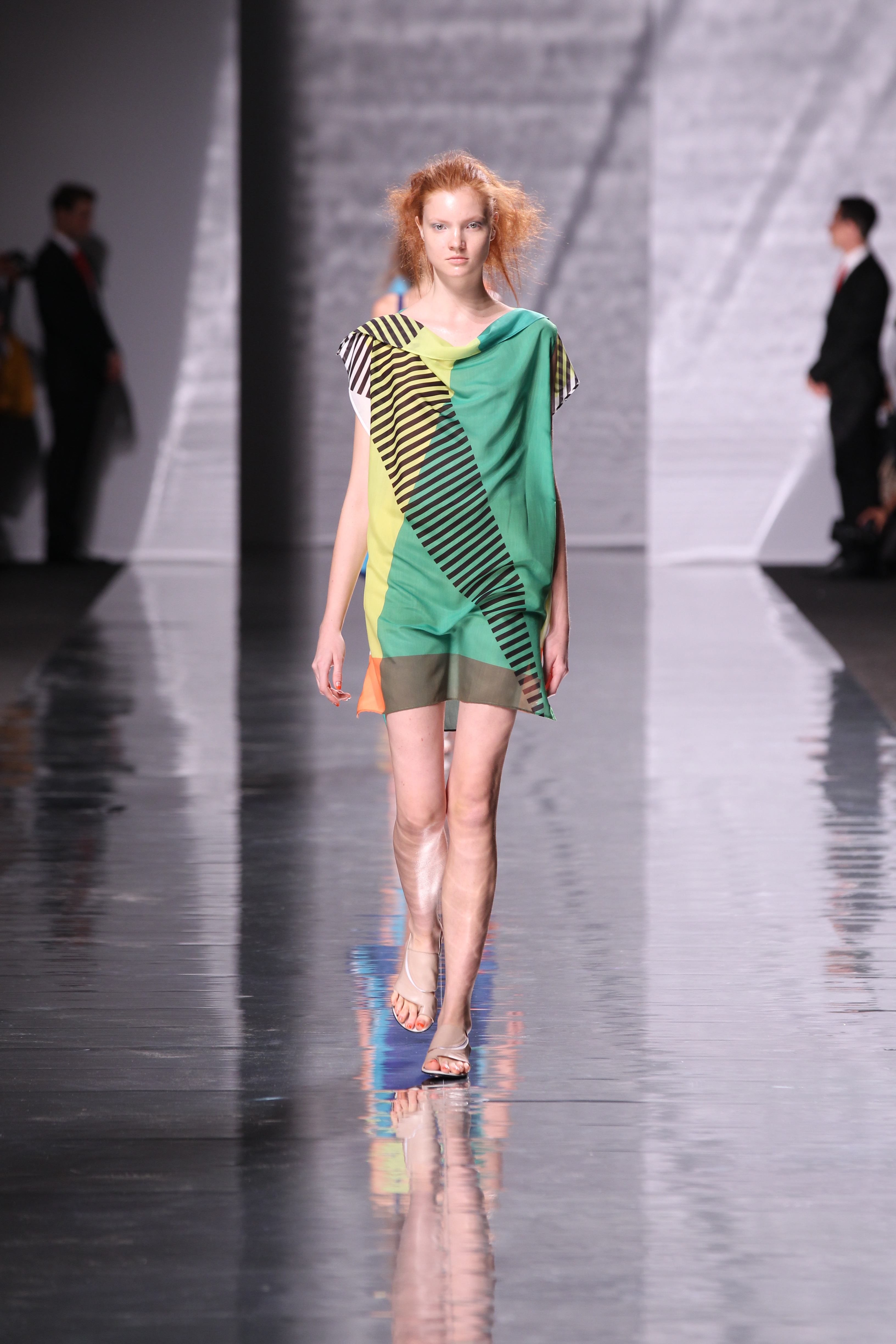 And what colors! With Issey Miyake, there’s no monochrome monotony or boring prints. We’re witnessing a veritable chromatic explosion. Clothes incorporate blues, greens, yellows, oranges and reds, all in a progression with the show’s music. By the time we reach the brightest, most intense color: red, the models are no longer marching upright, the rhythm of the music is frenzied and the scene is reminiscent of a profusion of tropical birds.
