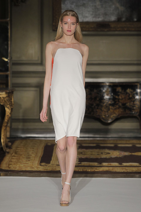 Beautiful symmetries on the dresses, with blends of color and transparent plastic where you least expect it, such as at the waist and shoulders, this is a collection full of finesse and good taste from the Spanish designer, who nevertheless breaks established codes with her intelligent use of materials that we don’t often see married together in such an empirical way.
