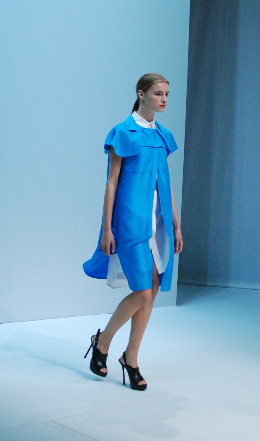 And he makes us understand this through his sublime finale where the model who leads the way appears as if magically under a blue neon umbrella to the sound of rain, followed by the rest dressed in transparent trenches adorned with butterflies. And it’s indeed with great nostalgia that we applaud this fashion show, which brings this surprising spring-summer 2013 season to a close. See you in January!