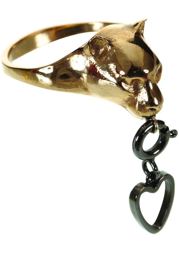 The cuffs and rings in the collection also feature a carved panther head with a removable charm at the mouth. The fine gold-plated chains can be both bracelets and