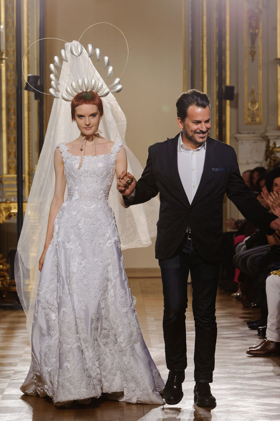 Dive into an ocean of materials, let yourself be carried away by the currents of an insane, surrealist, organic ideal; be entranced by the hypnotic ballet of silk fins; resurface for a moment, be pierced by a pink, metallic light; dive again, ignoring the danger of leather scales, brush against a coral of tulle and finally surrender to the extravagant, mysterious sensuality of the fish woman.