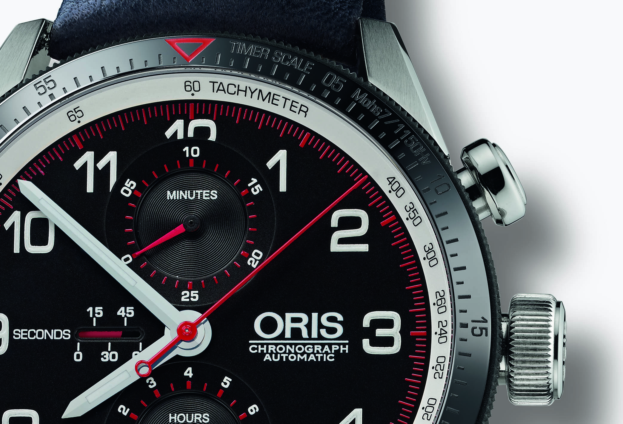 Superluminova inserts. Dedicated to the chronograph function, the red and black hands are inspired by motorsport.