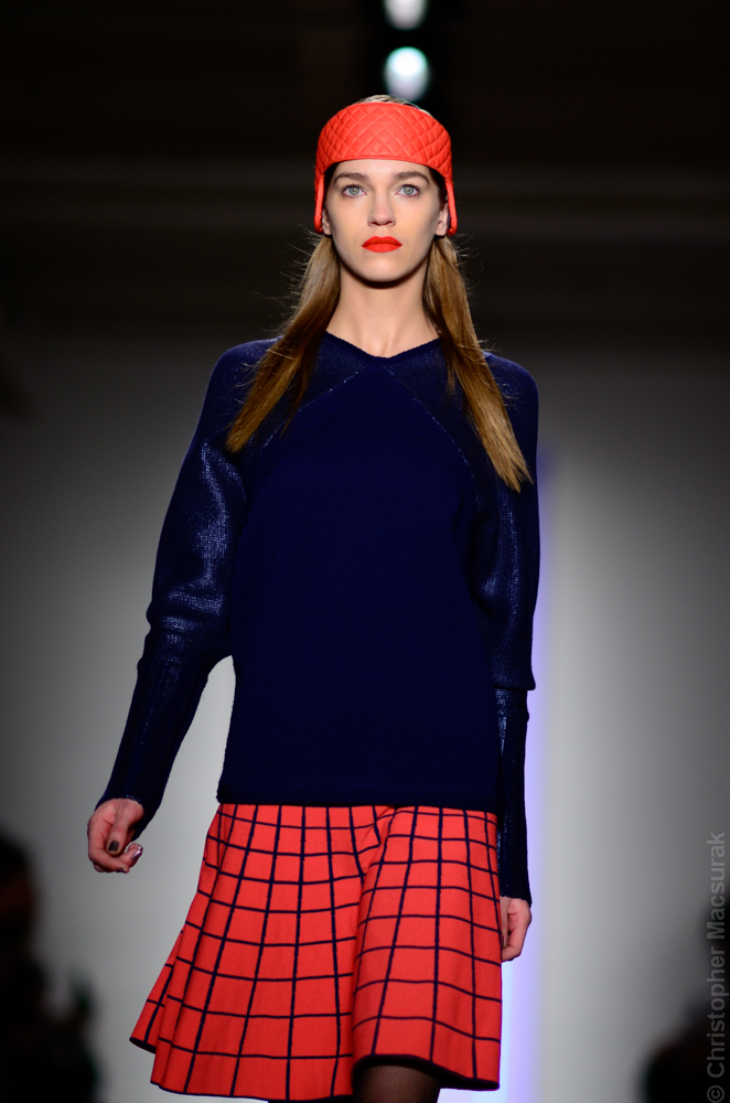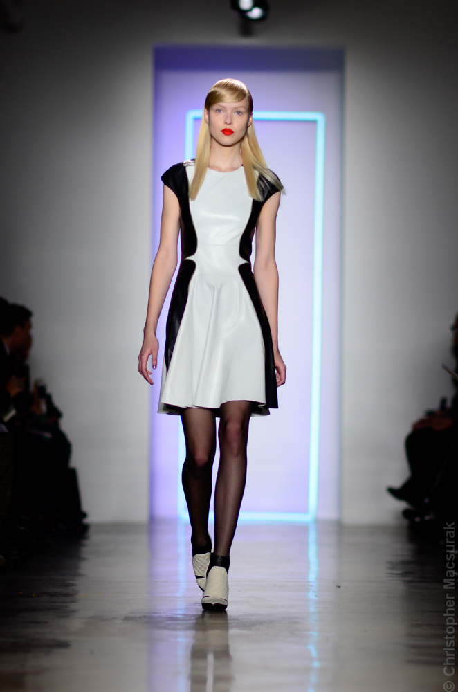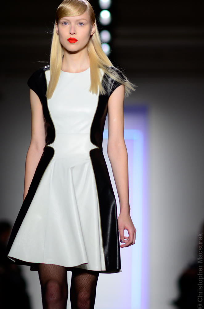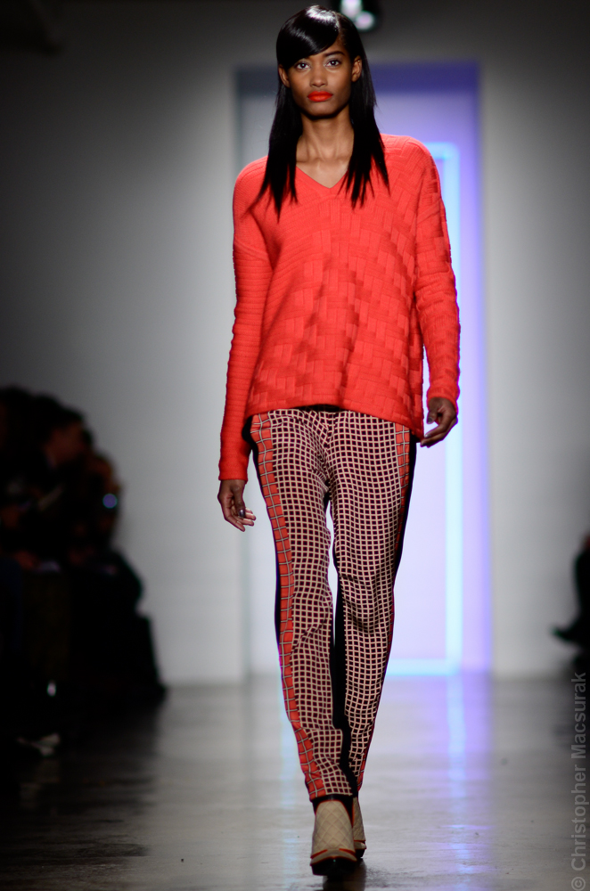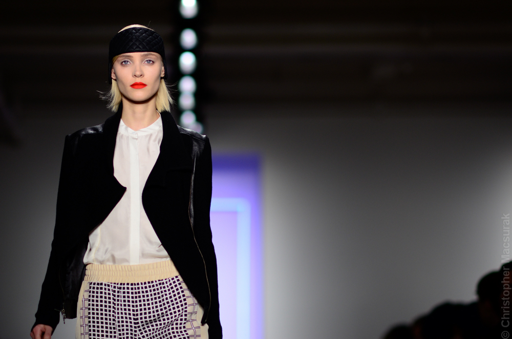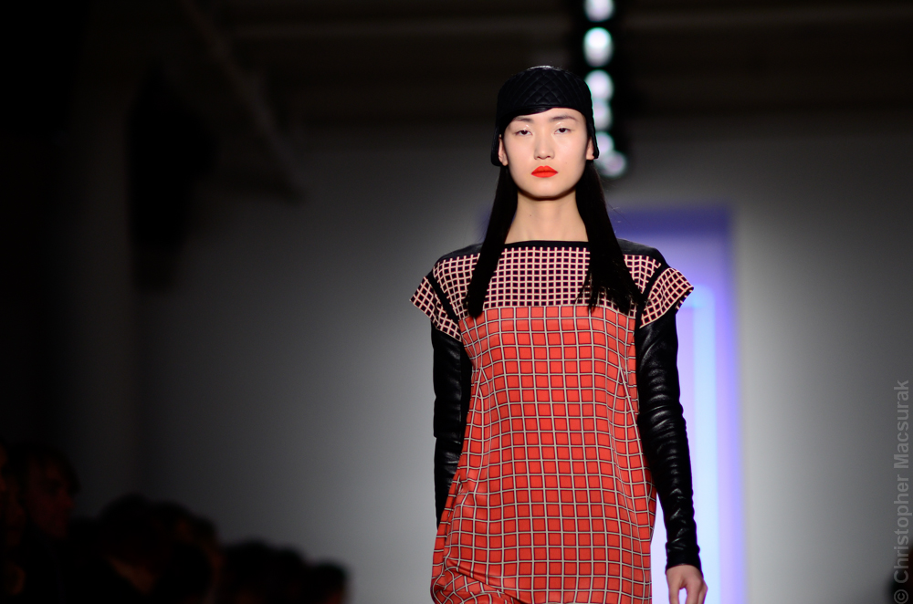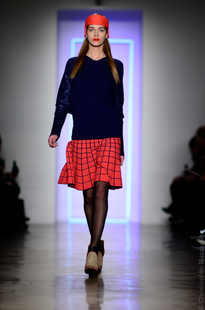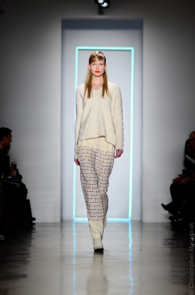 Ohne Titel designers Flora Gill and Alexa Adams presented a graphic, stylized collection at New York Fashion Week. The geometry of the silhouettes is reinforced by the use of contrasting red, white and black.