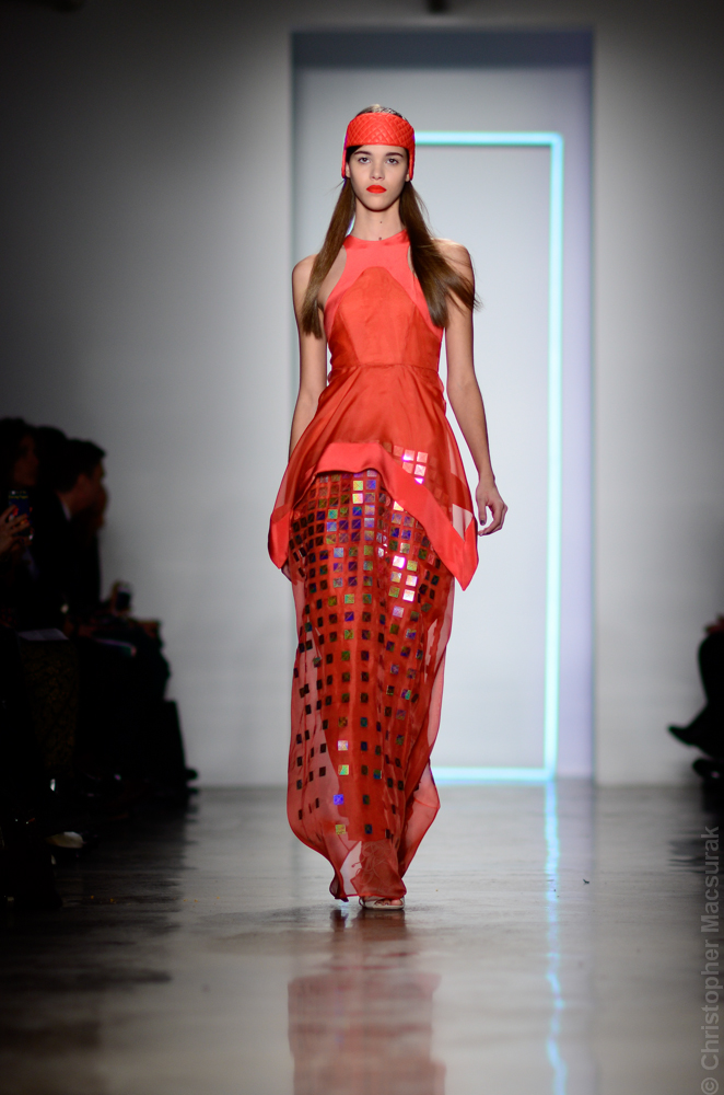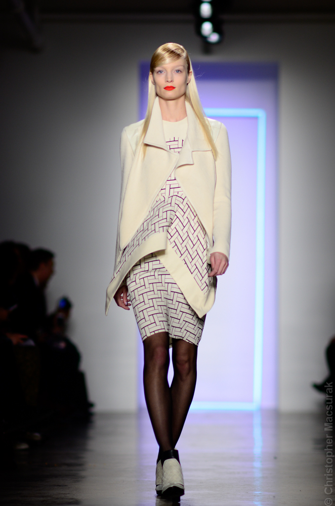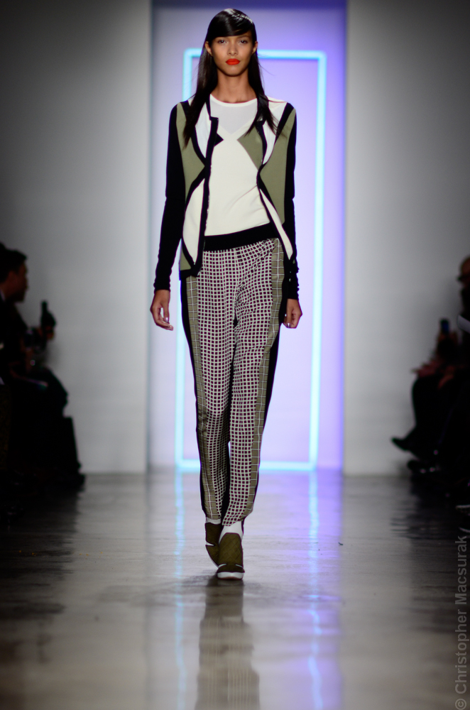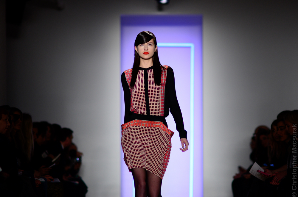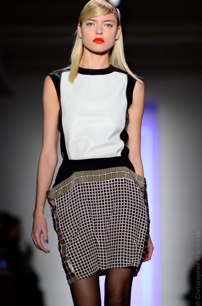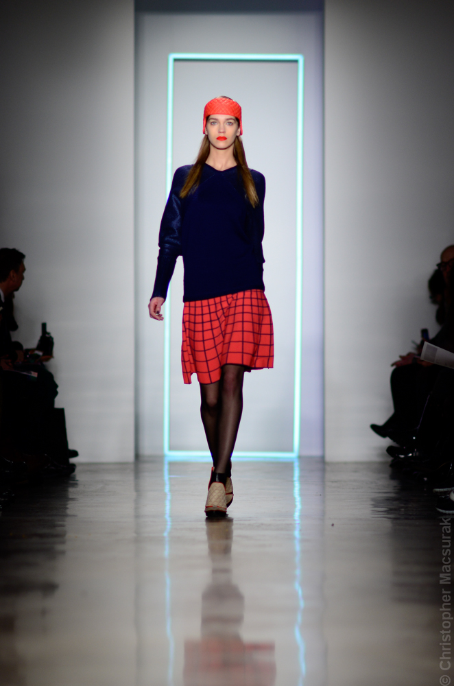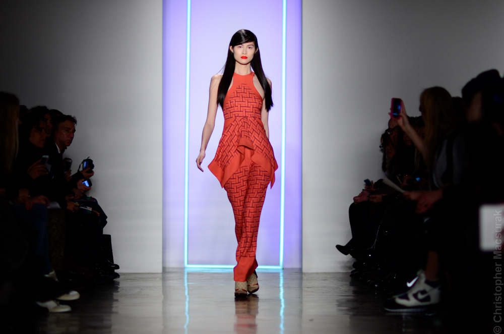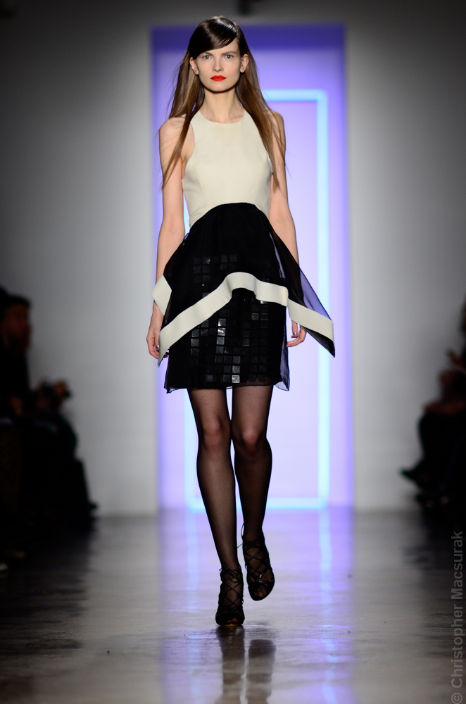 Ohne Titel designers Flora Gill and Alexa Adams presented a graphic, stylized collection at New York Fashion Week. The geometry of the silhouettes is reinforced by the use of contrasting red, white and black.