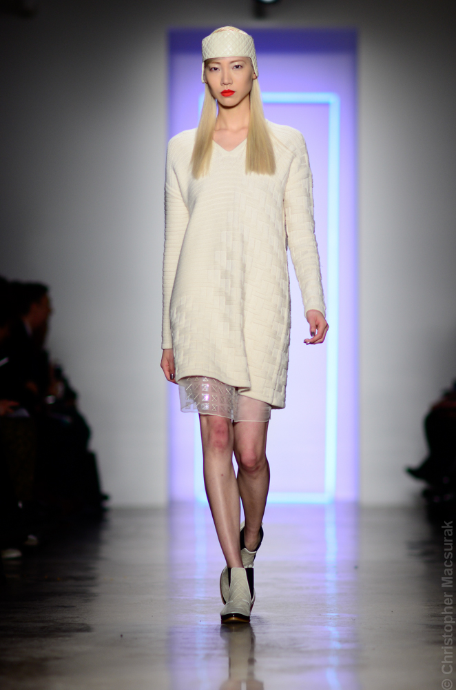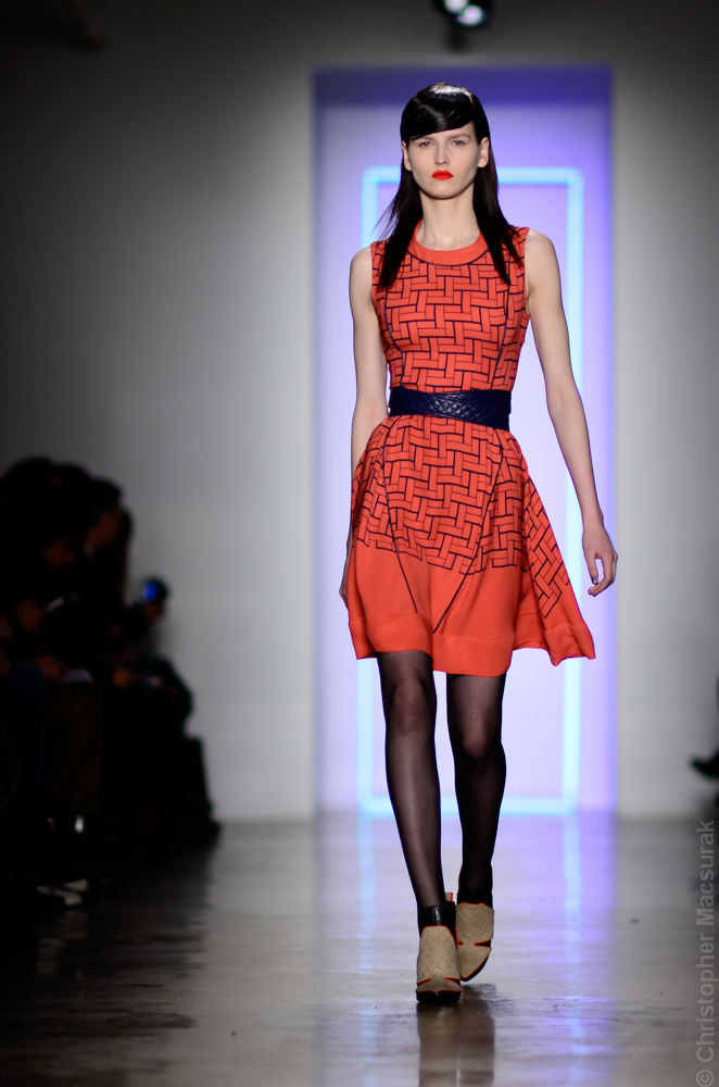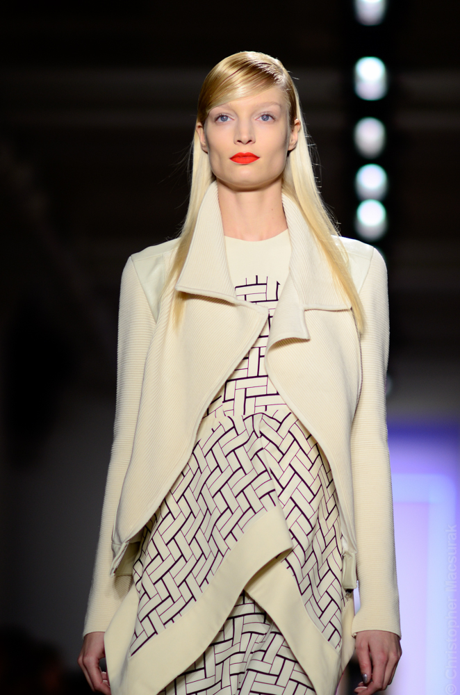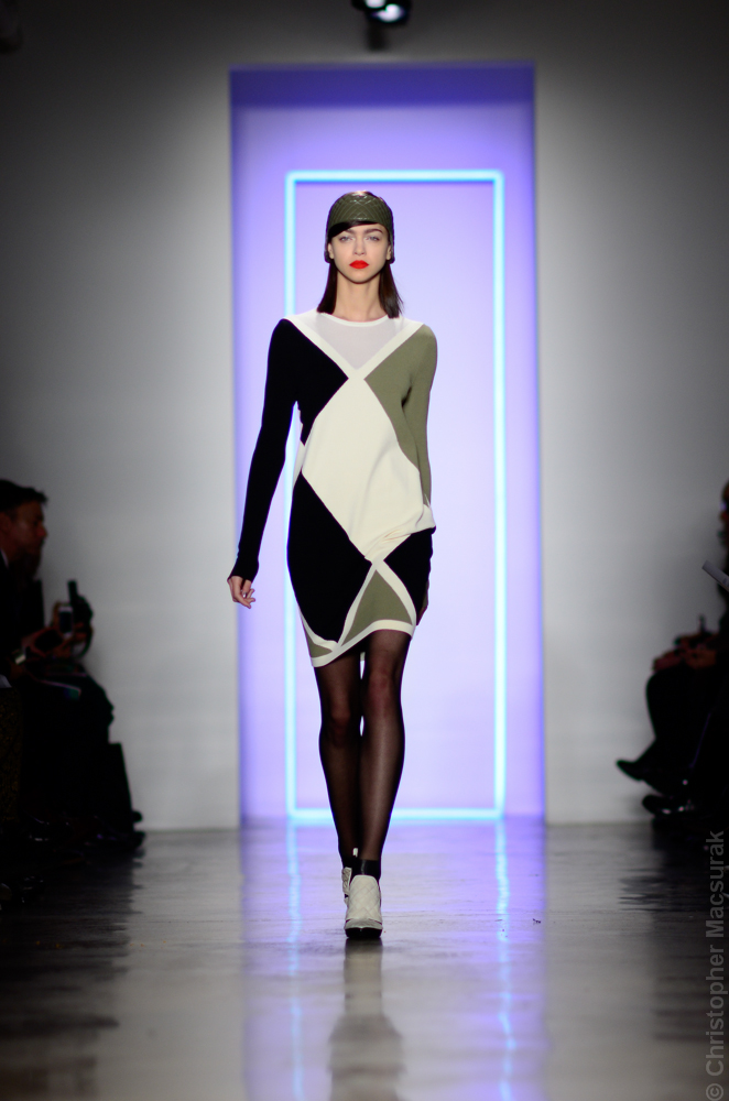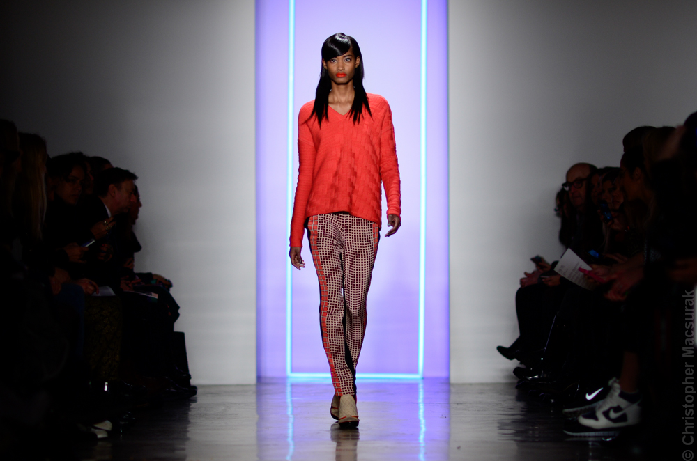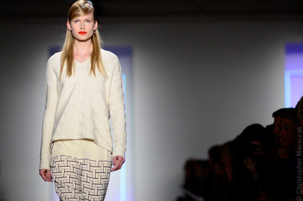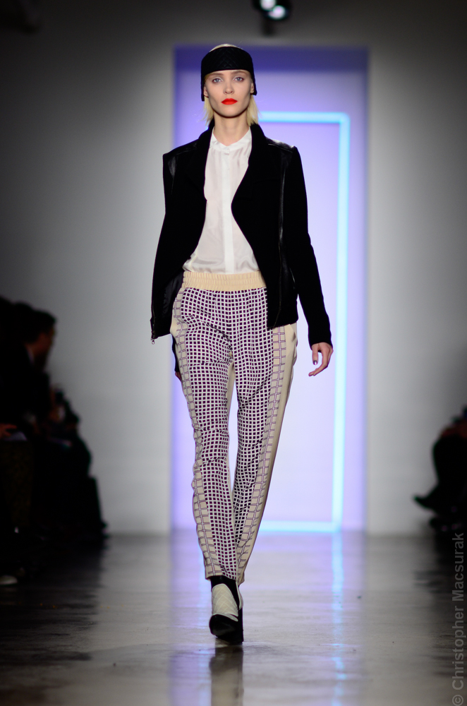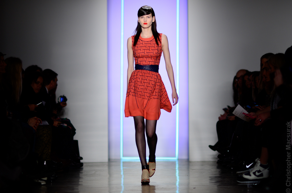 Ohne Titel designers Flora Gill and Alexa Adams presented a graphic, stylized collection at New York Fashion Week. The geometry of the silhouettes is reinforced by the use of contrasting red, white and black.