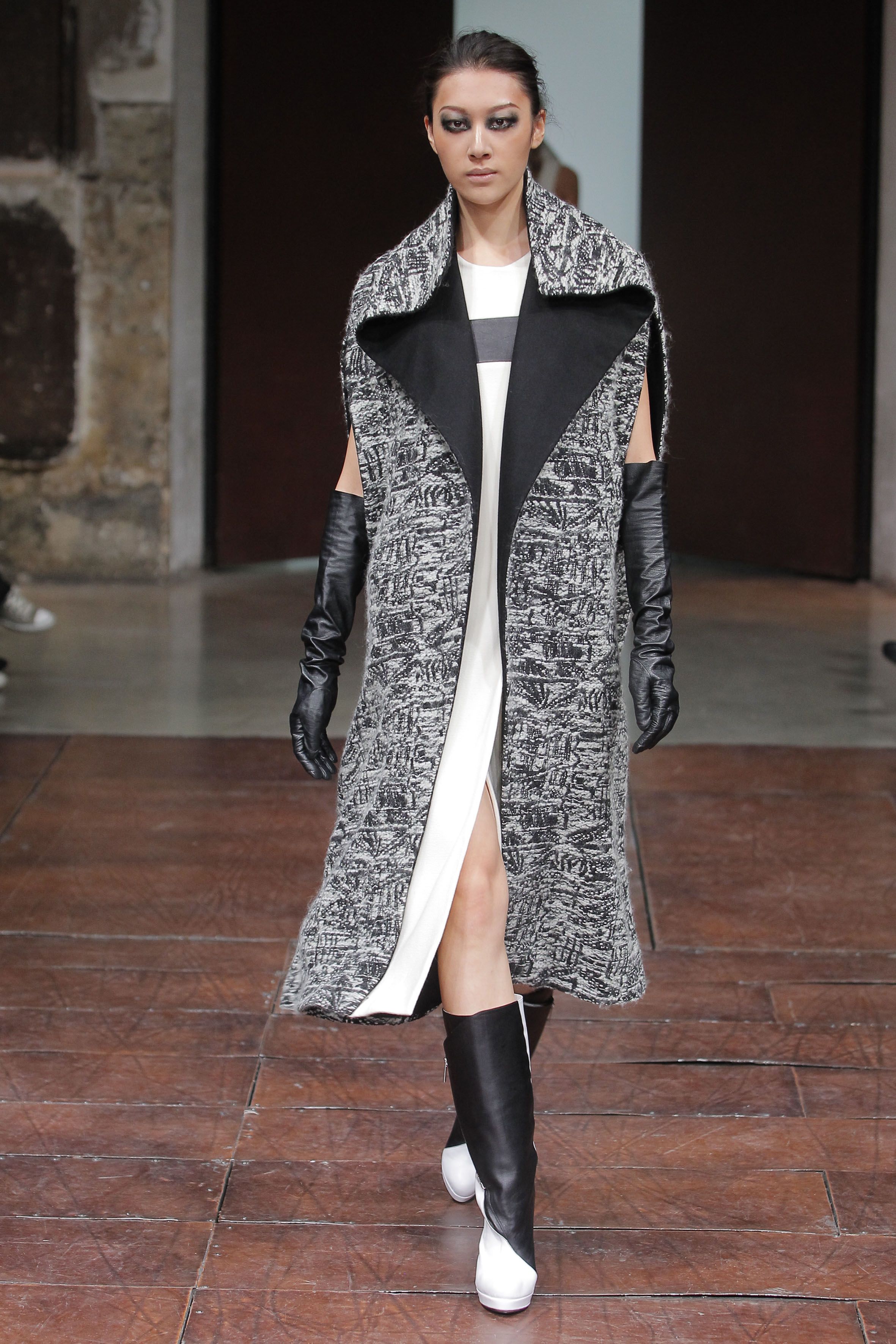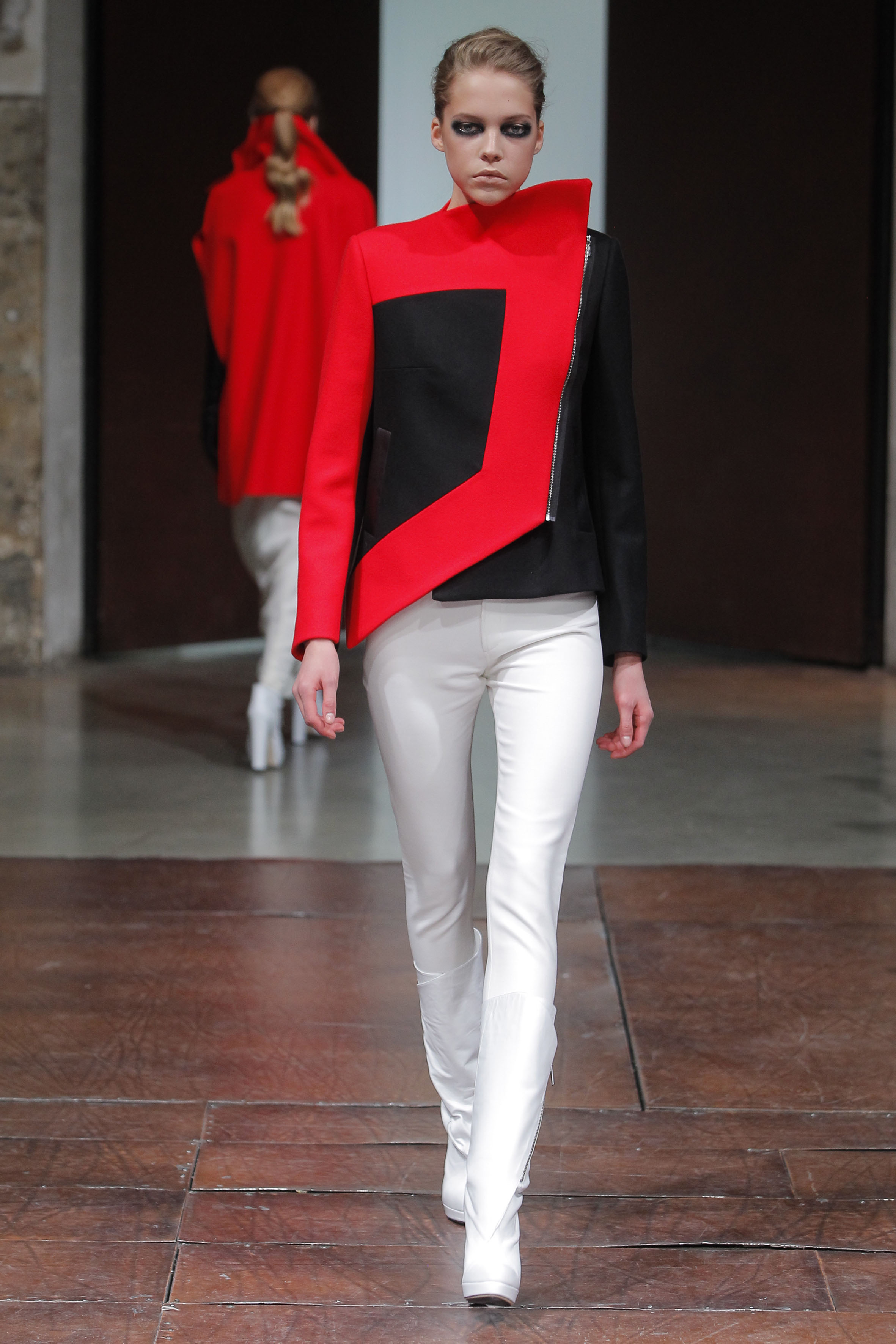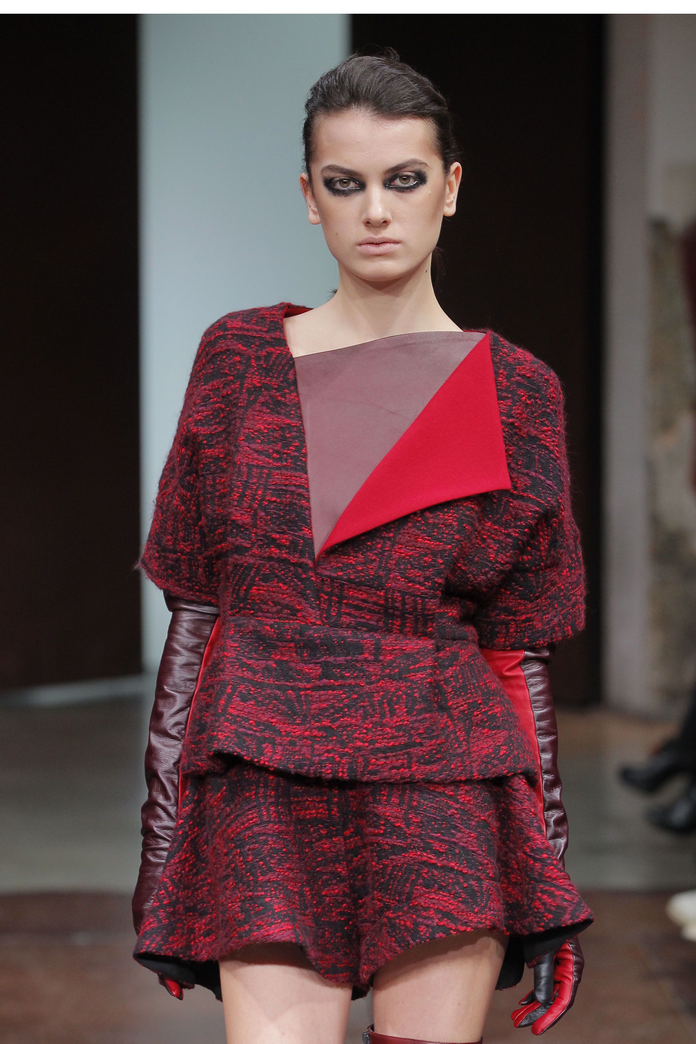 For this winter 13/14, Luis Buchinho proposes a collection on the theme of identity, and in particular the strong identity of the Portuguese revolution. With red and black as a reminder of violence, this collection is provocative and modern, with its use of asymmetrical details and the geometric constructions so dear to Luis Buchinho. Marked shoulders give a retro/modern look. The materials used are varied, including skin, tweed and felted wool.