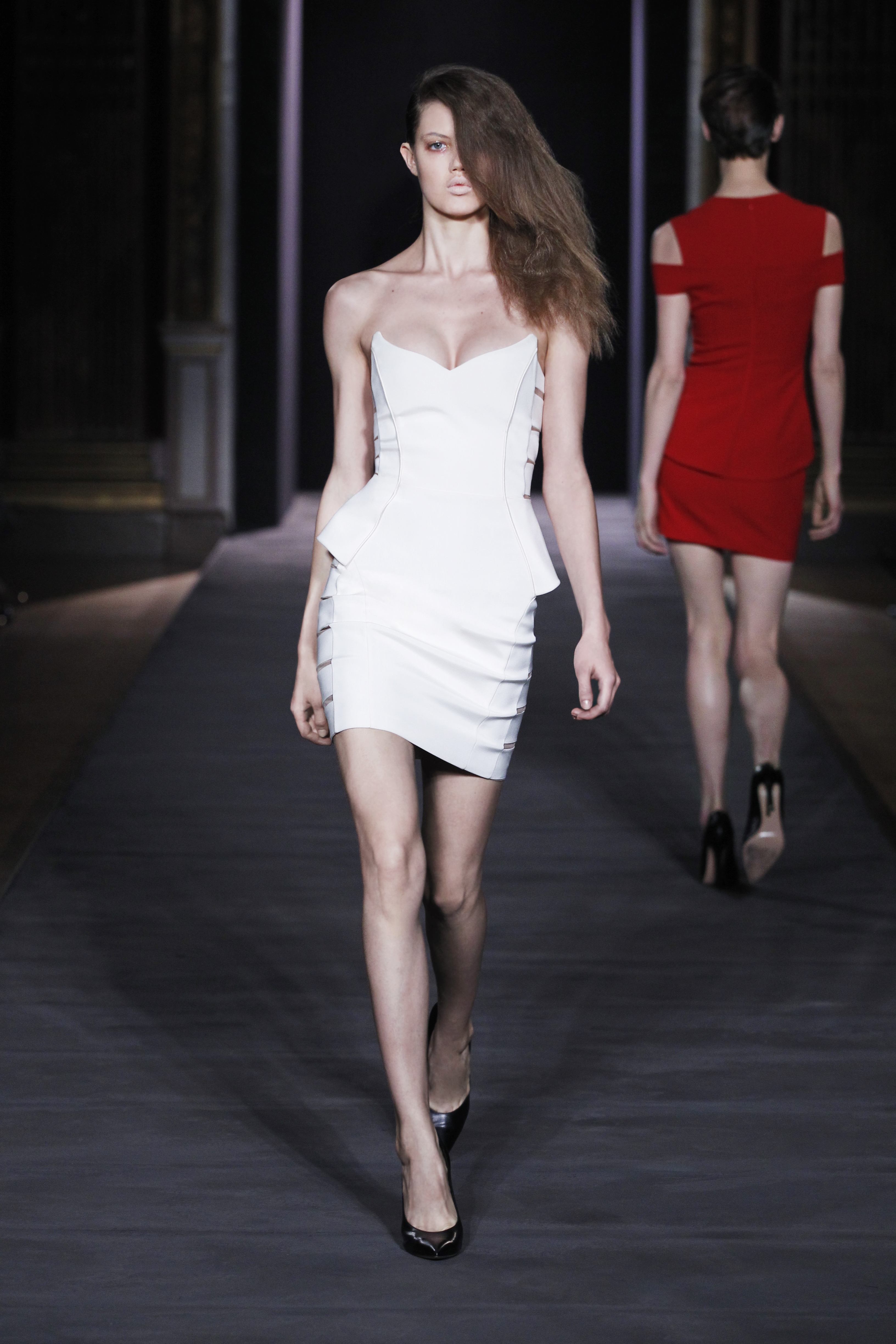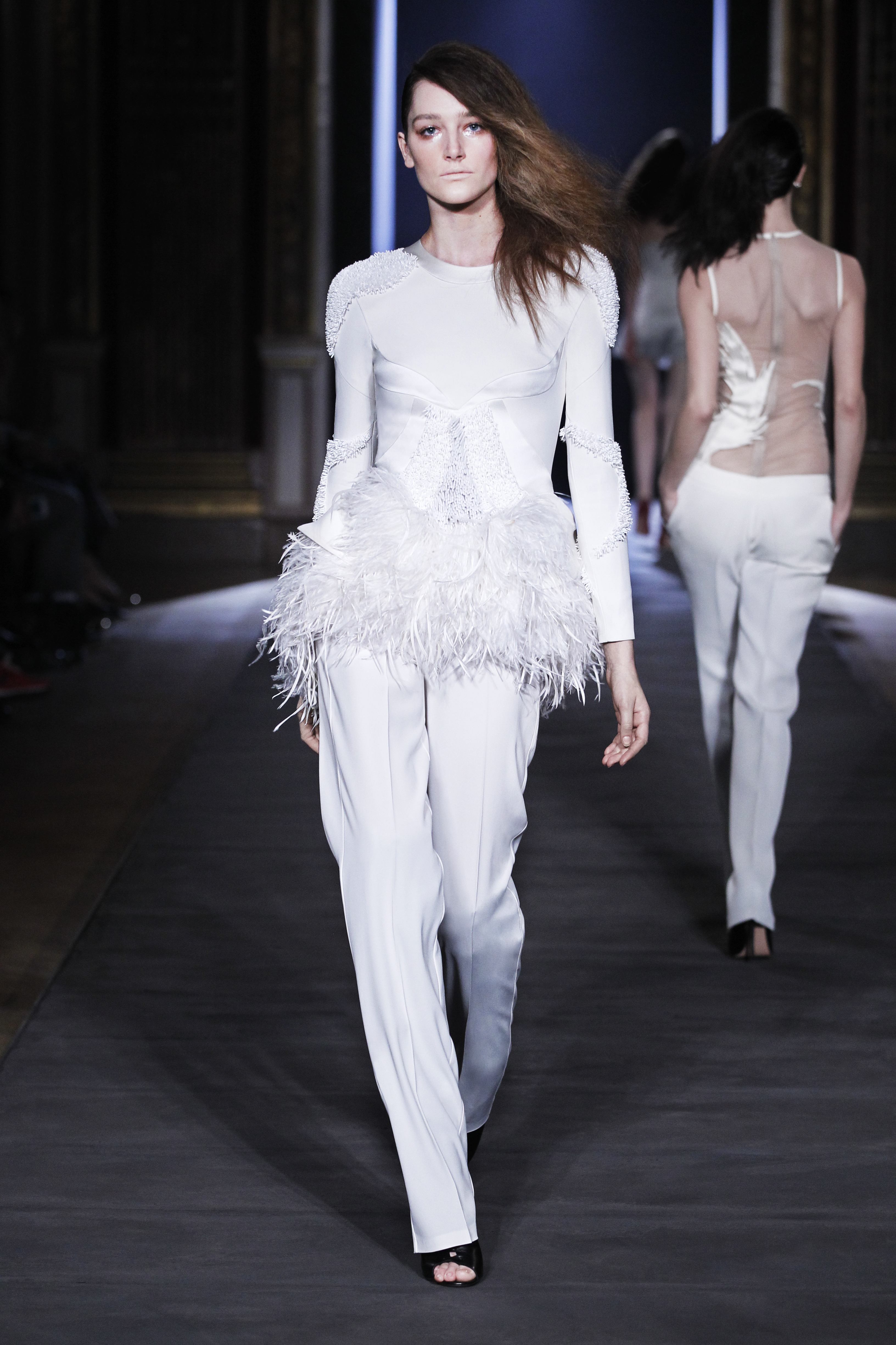 Skirt slits are THE sexy detail. White ensembles are brave and explore interesting directions: jewelry integrated into garments, organza inserts, fur. Dresses are often worn over pants (a future trend?).