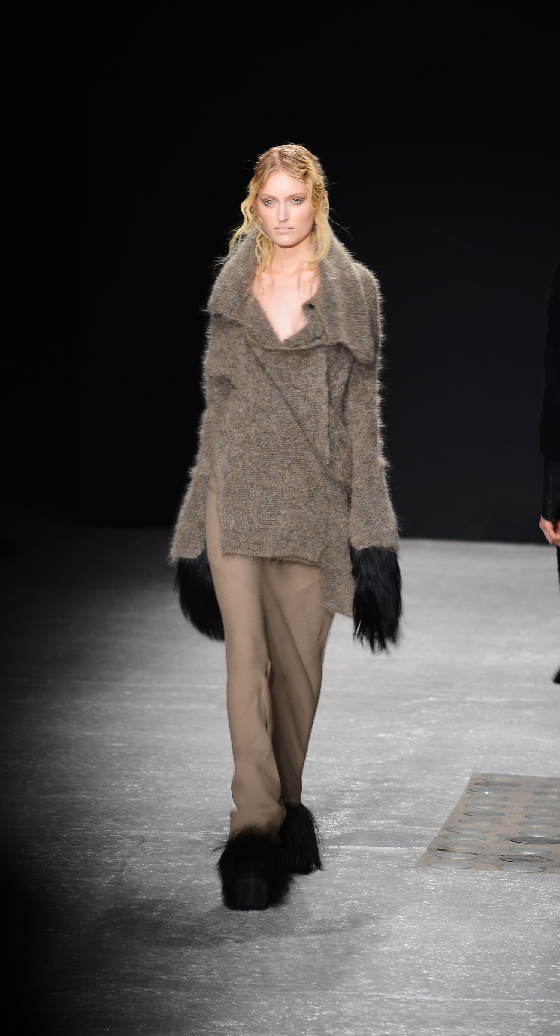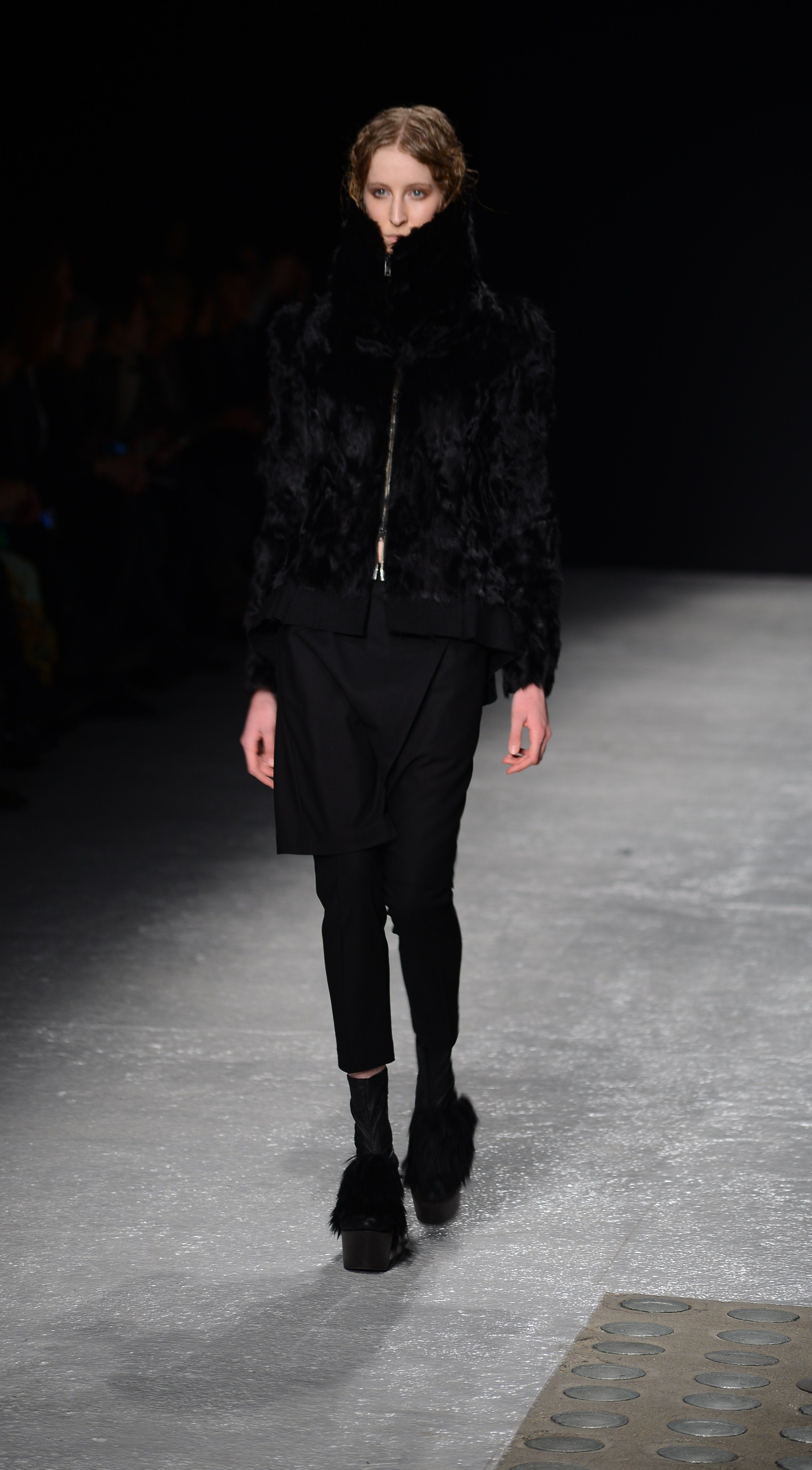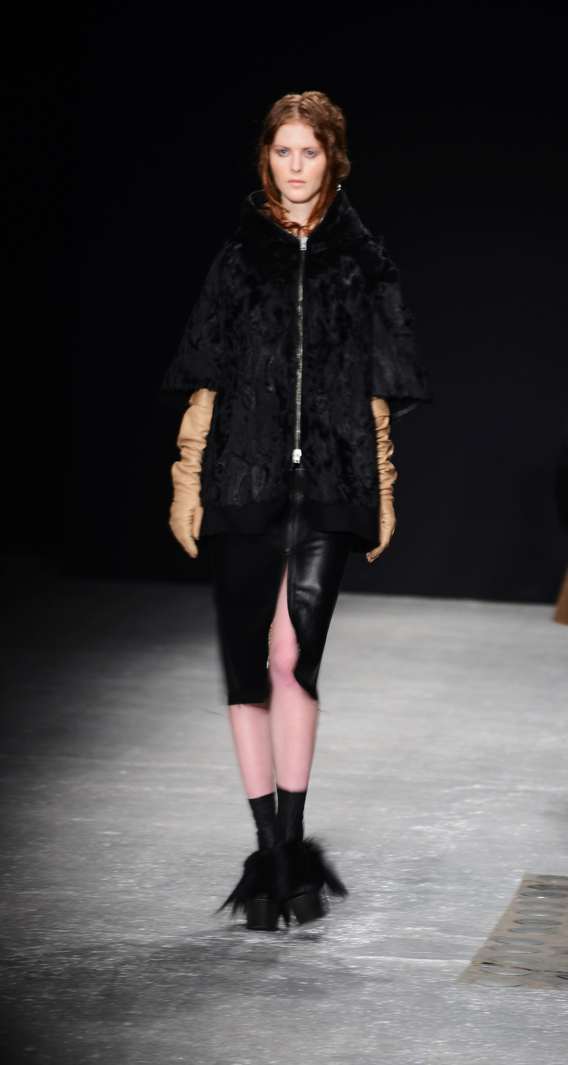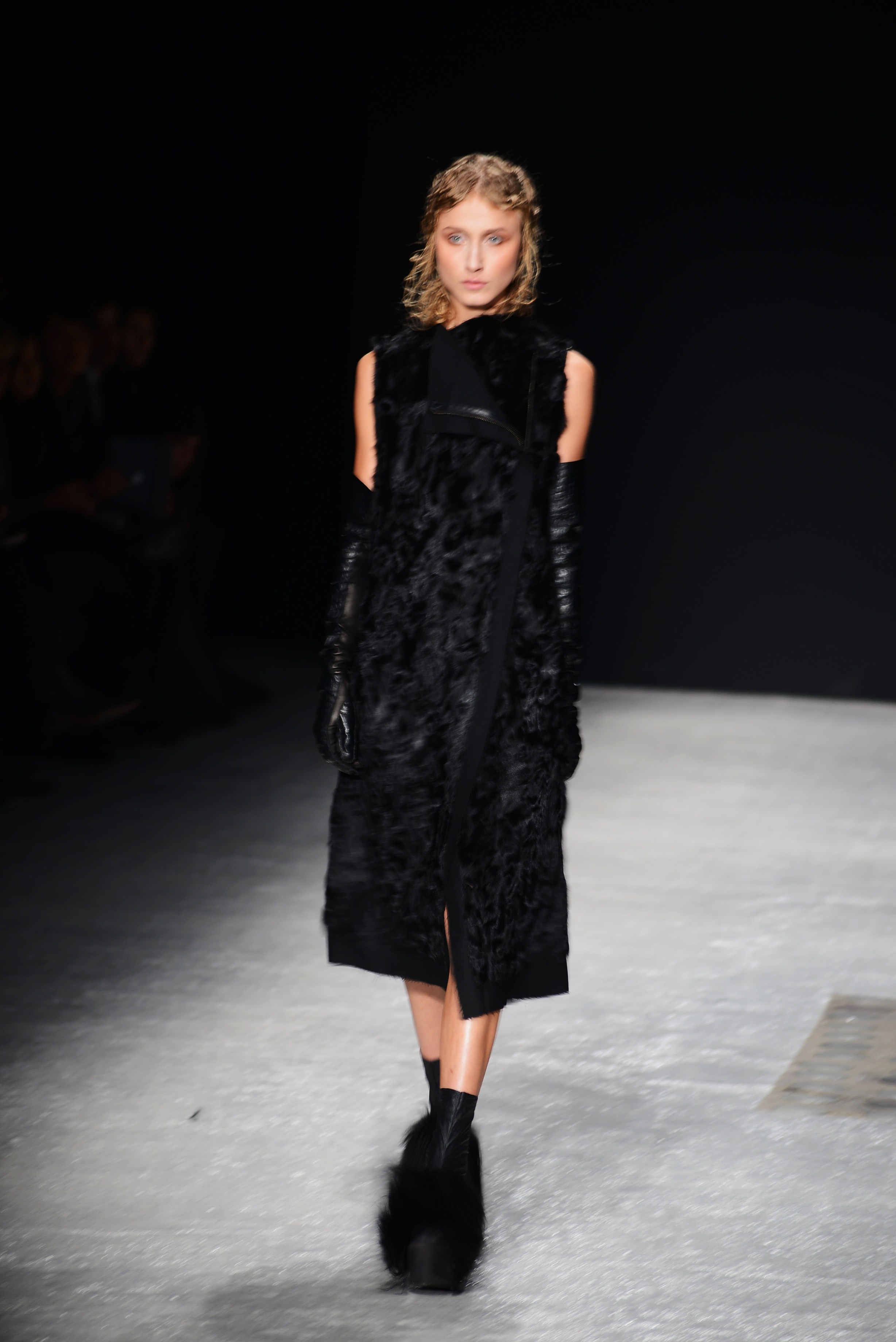 The first part of the show is based on raw materials: fur and shearling. Black was the dominant color, although we saw a few earthy hues here and there, so materials intermingled and yokes were a staple of the outfits.
