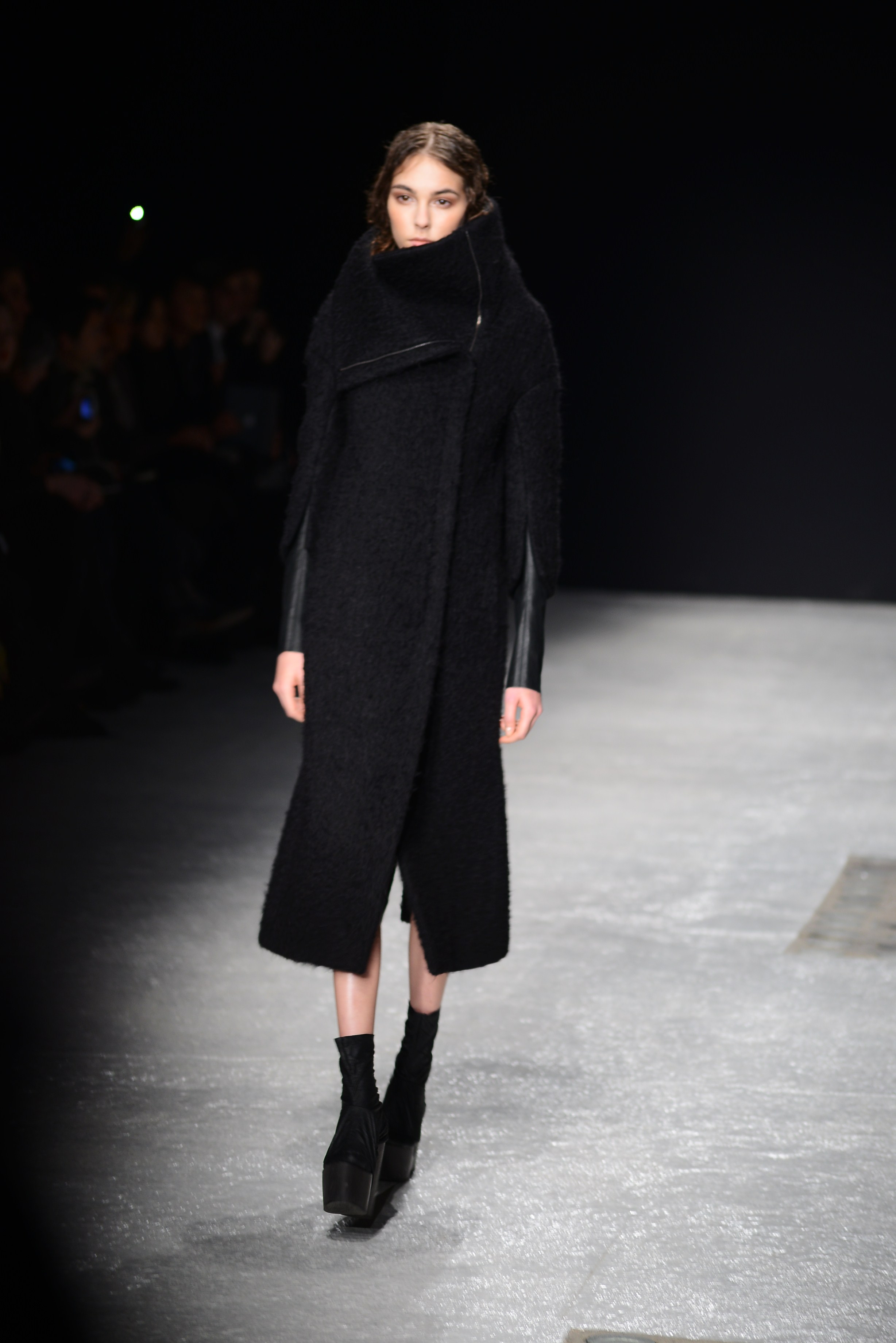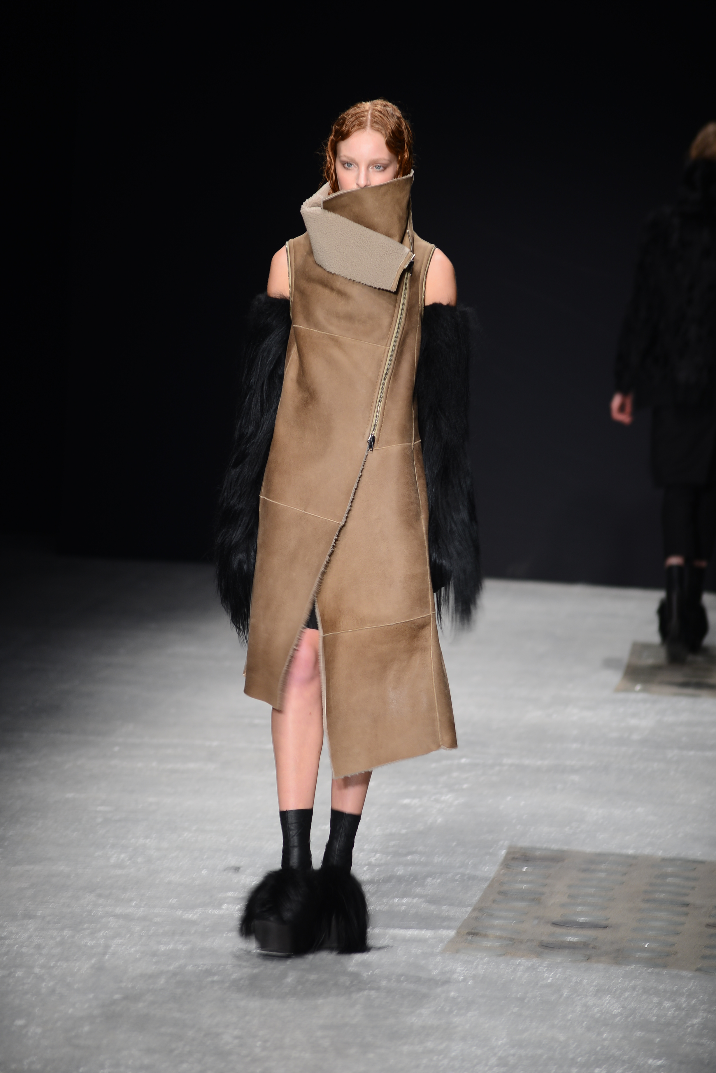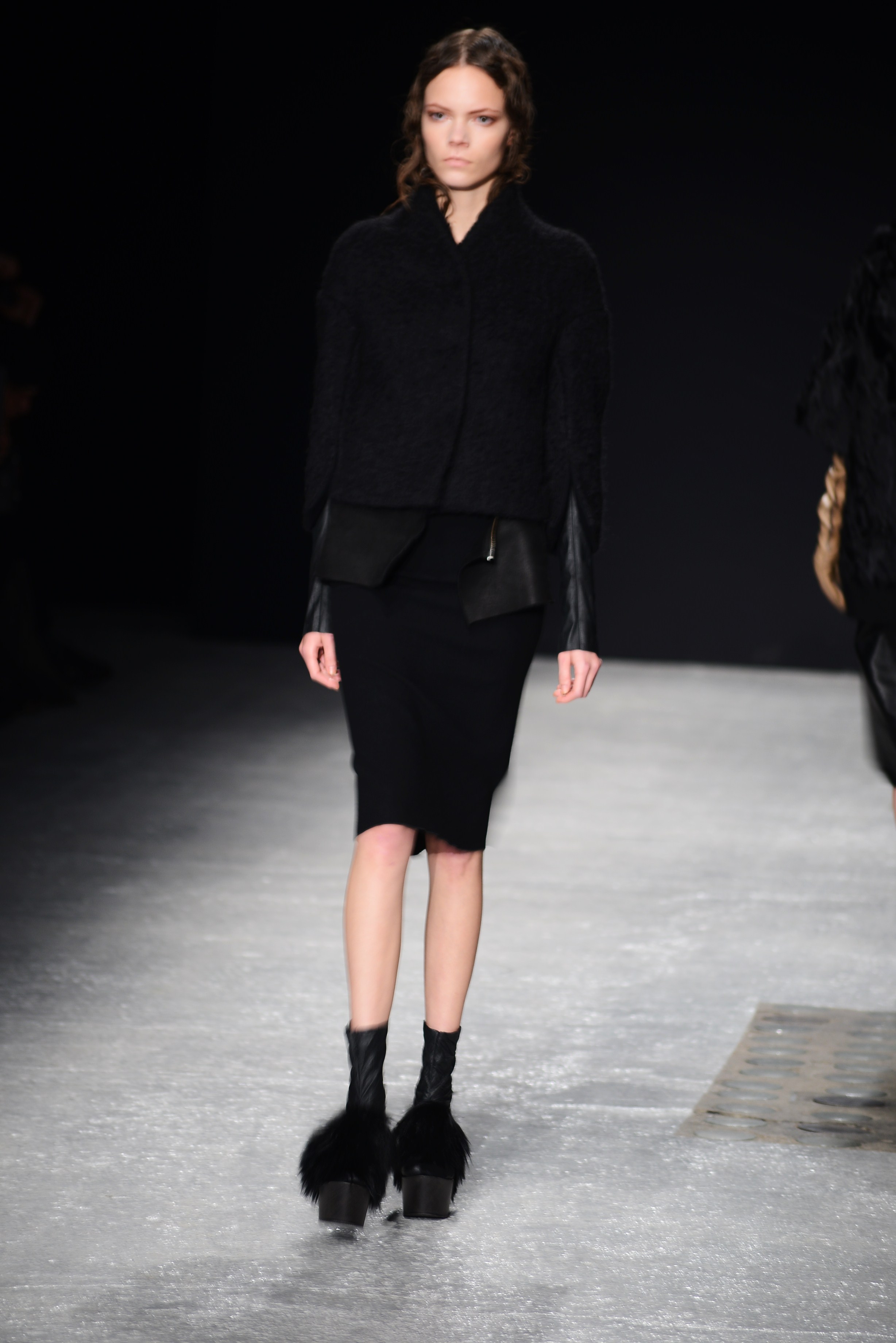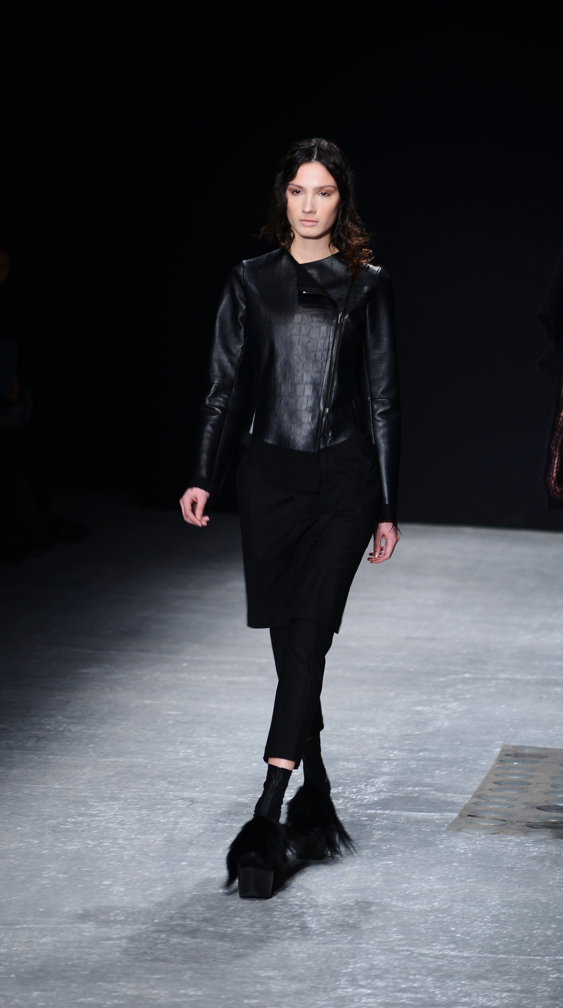 The first part of the show is based on raw materials: fur and shearling. Black was the dominant color, although we saw a few earthy hues here and there, so materials intermingled and yokes were a staple of the outfits.
