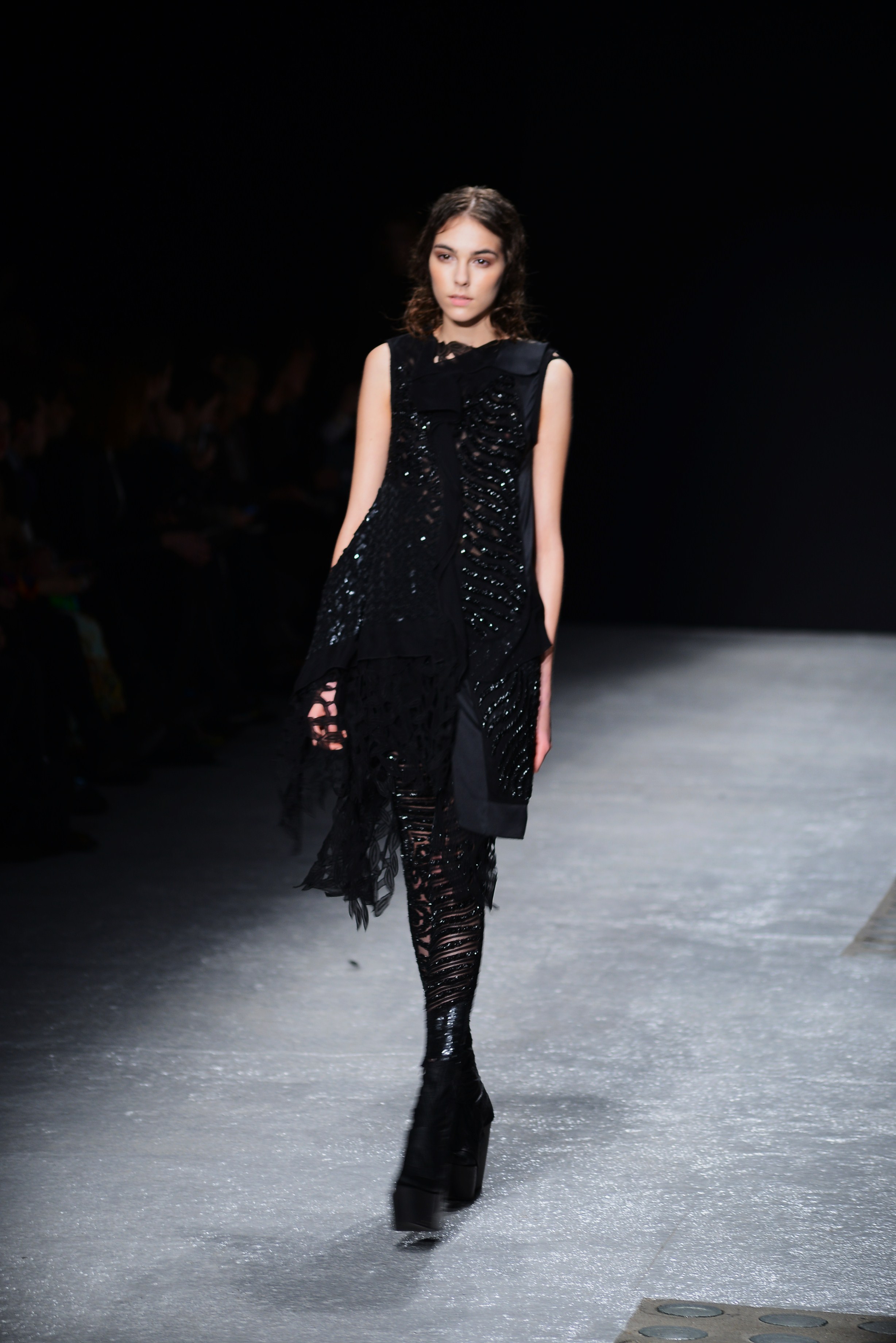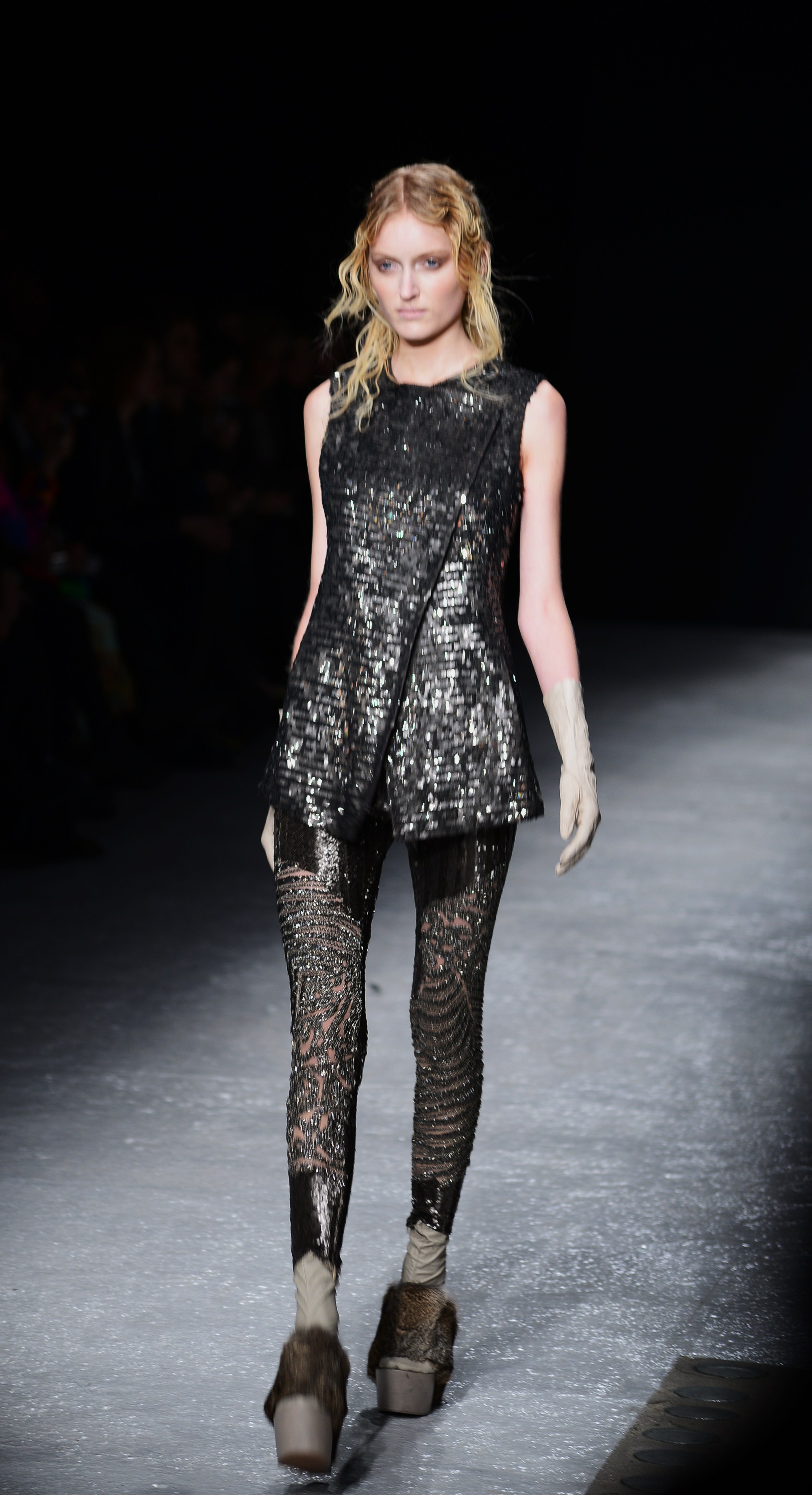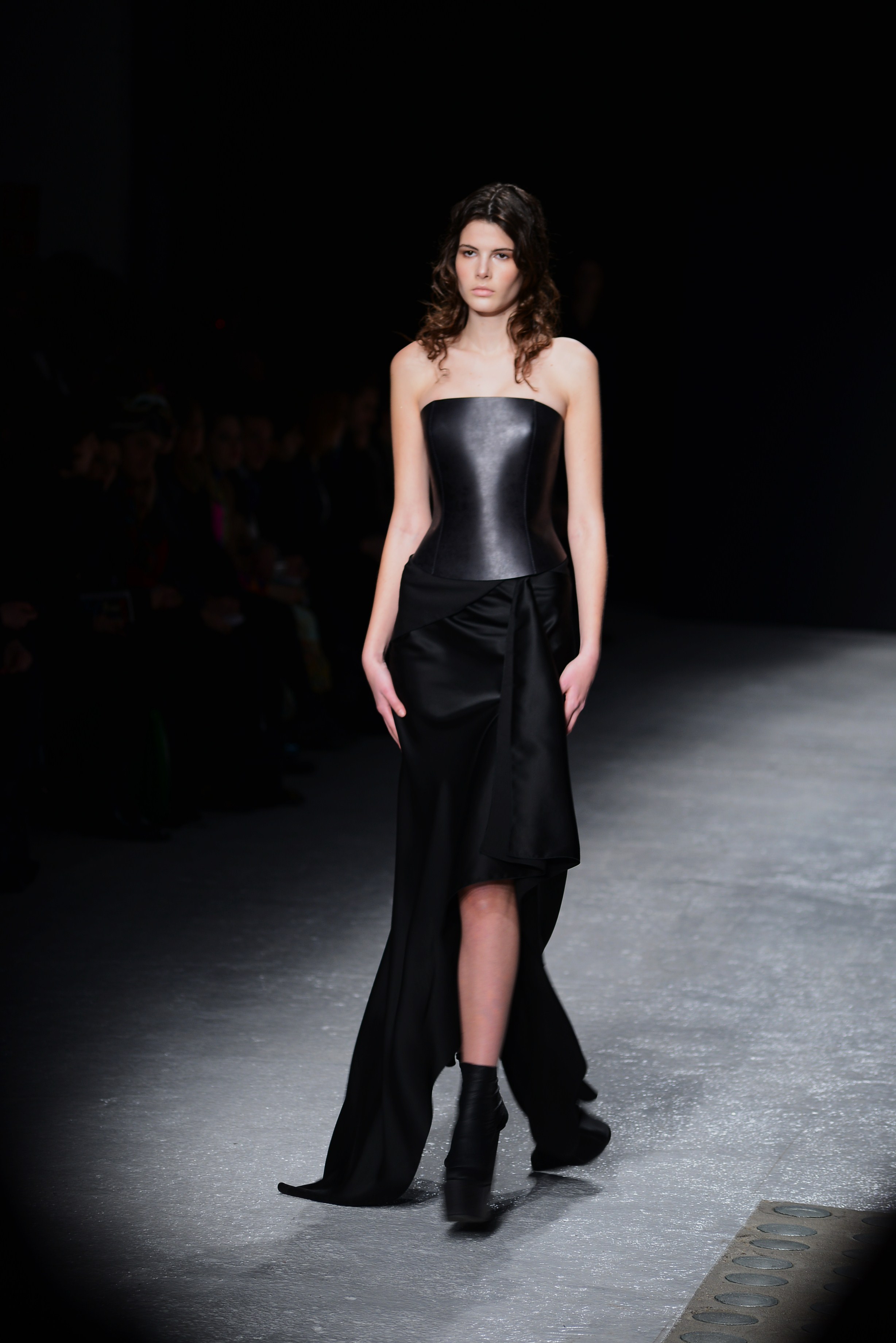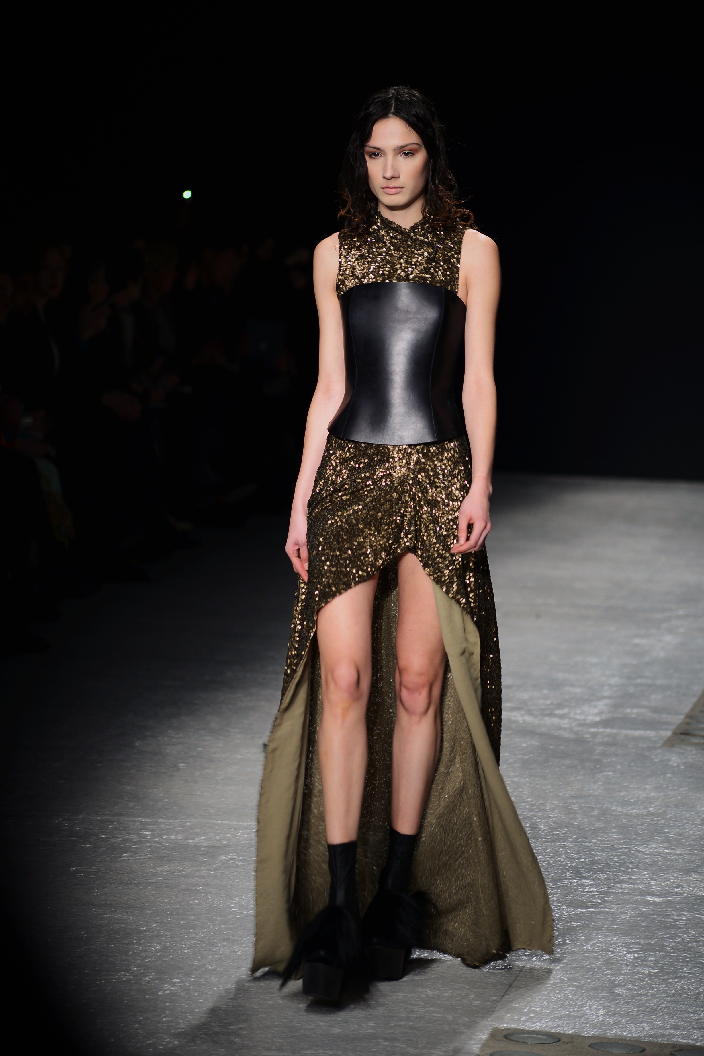 The second part of the collection focuses on eveningwear, with long dresses in lurex and sequins, structured by the addition of leather corsets. The inspiration of the first part of the show makes its appearance through small details and the use of more wintry materials.