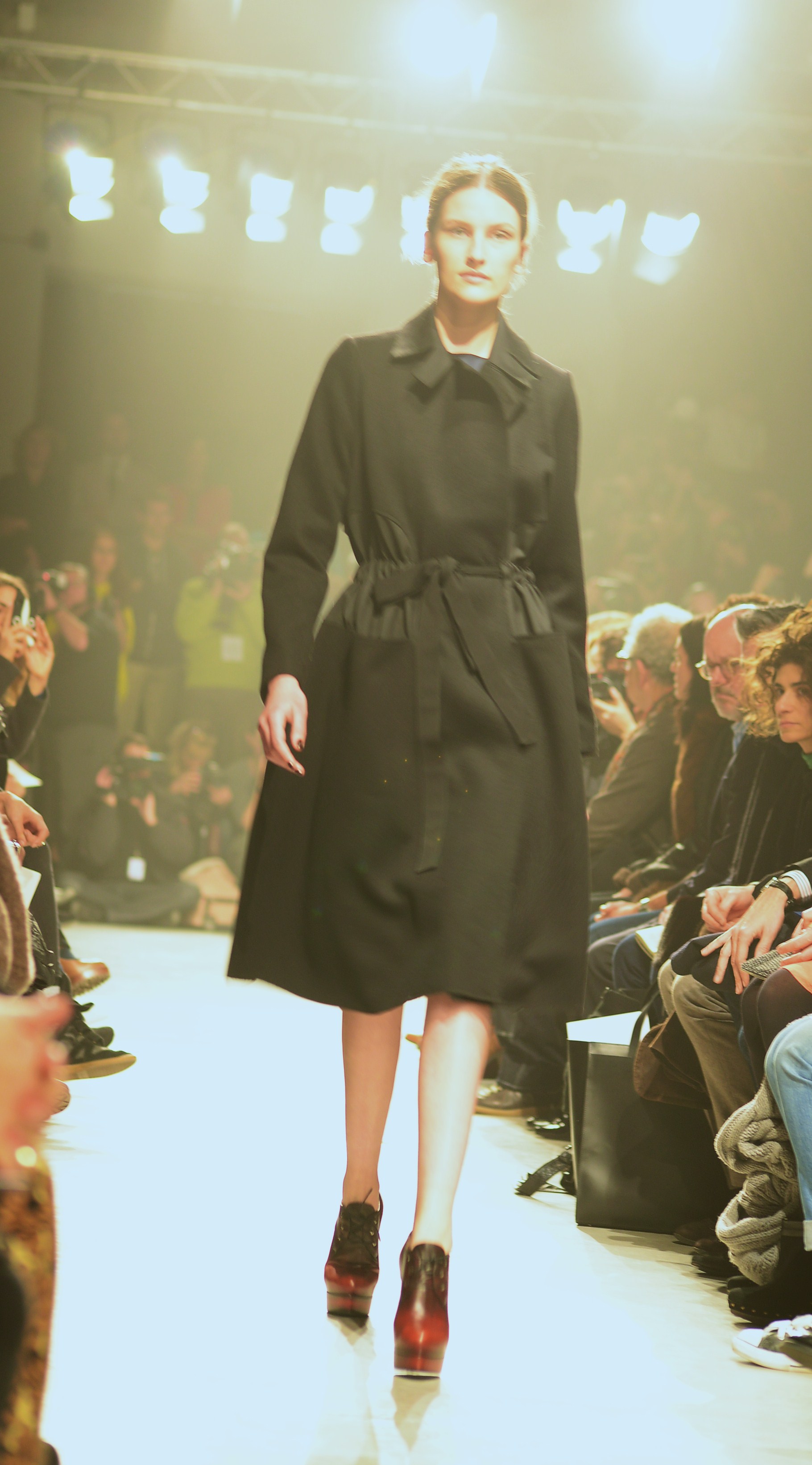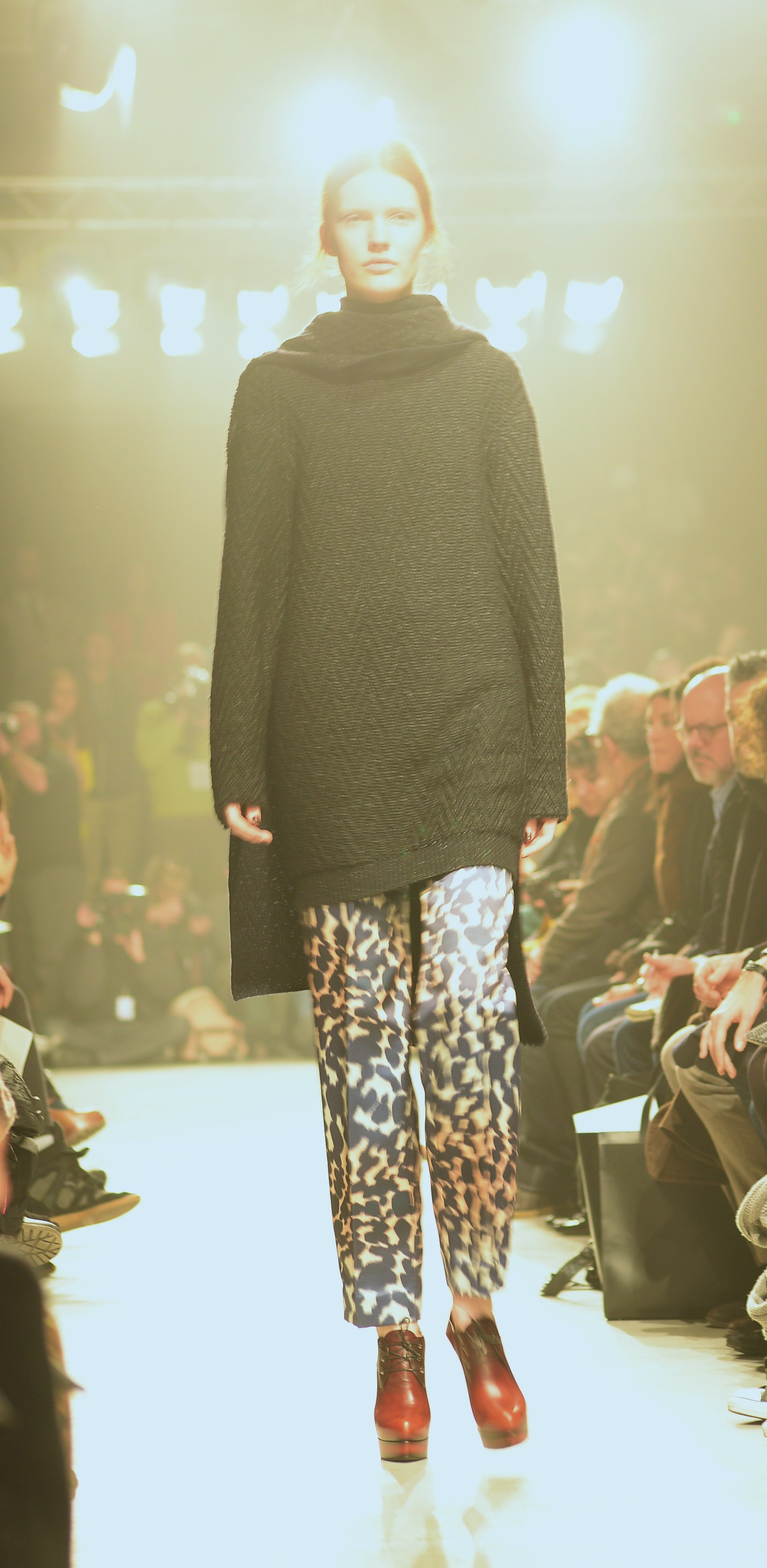 A collection entitled “Waiting”, based on a masculine-feminine mix that bets on a strong woman. Plain sheets in fire, saffron blue, black and chalk respond to the blotter print. Wrap-around pieces. Thick Jacquard, felted knit. Coyote and navy fox. Gleaming brushed and lacquered brass on the arm.