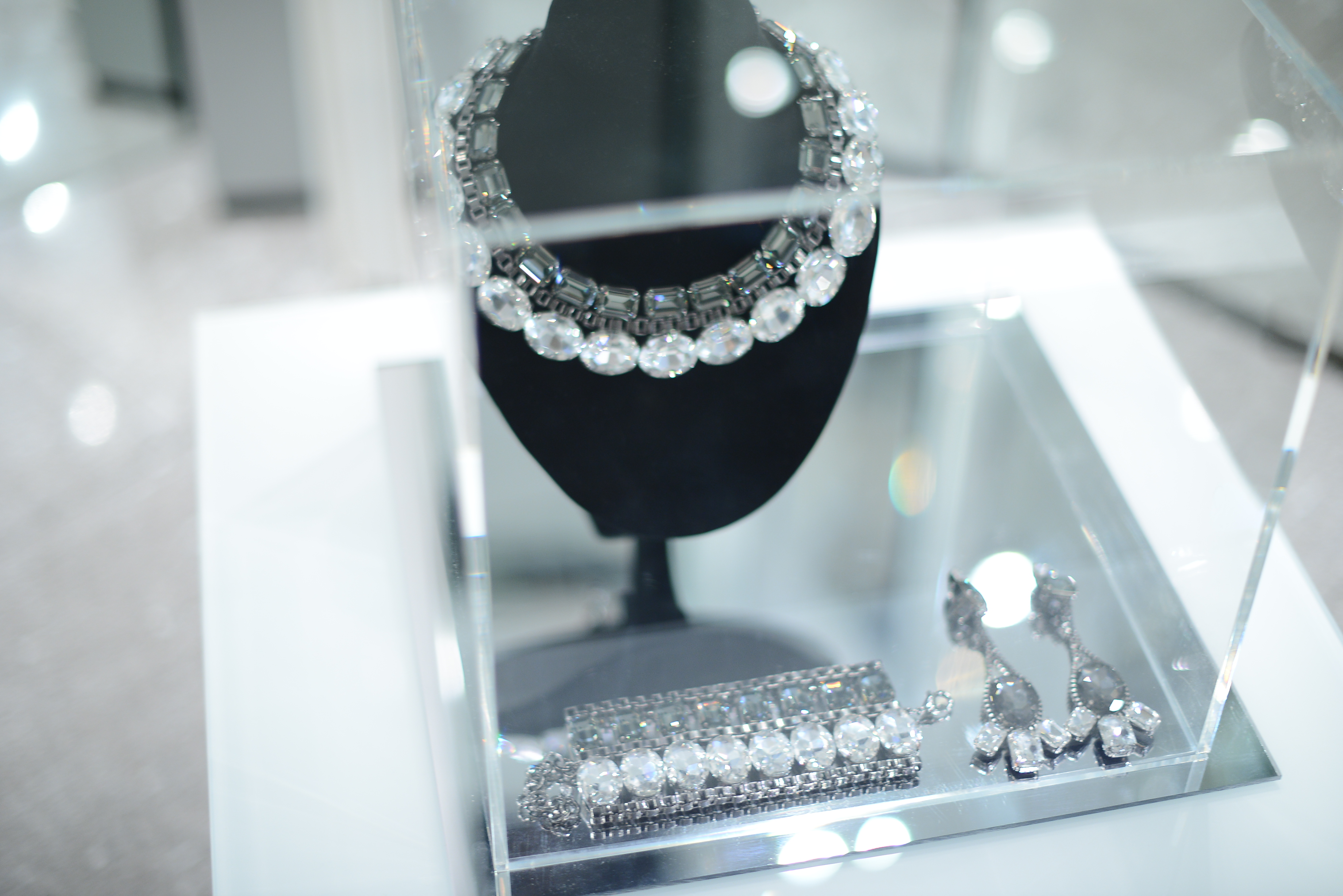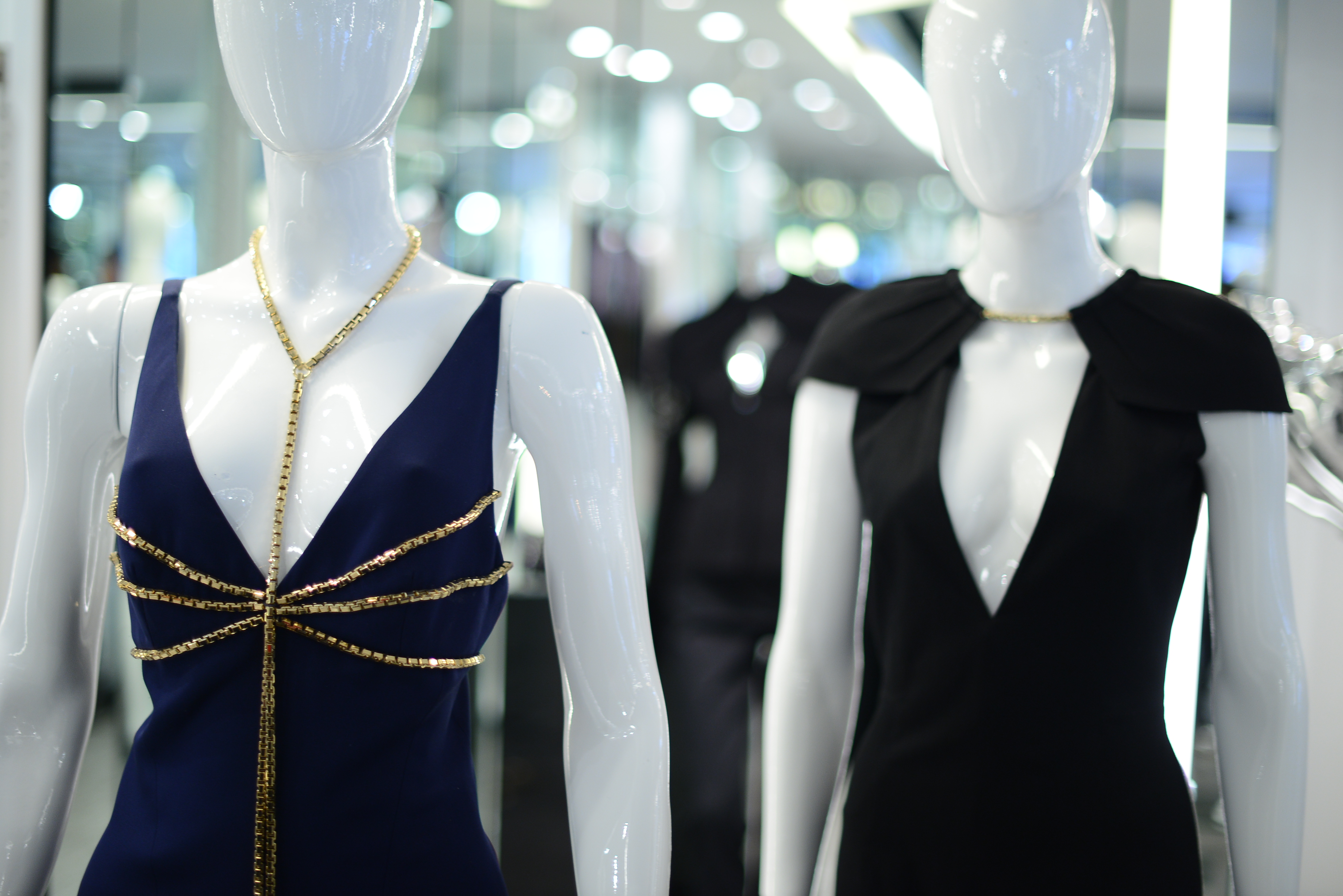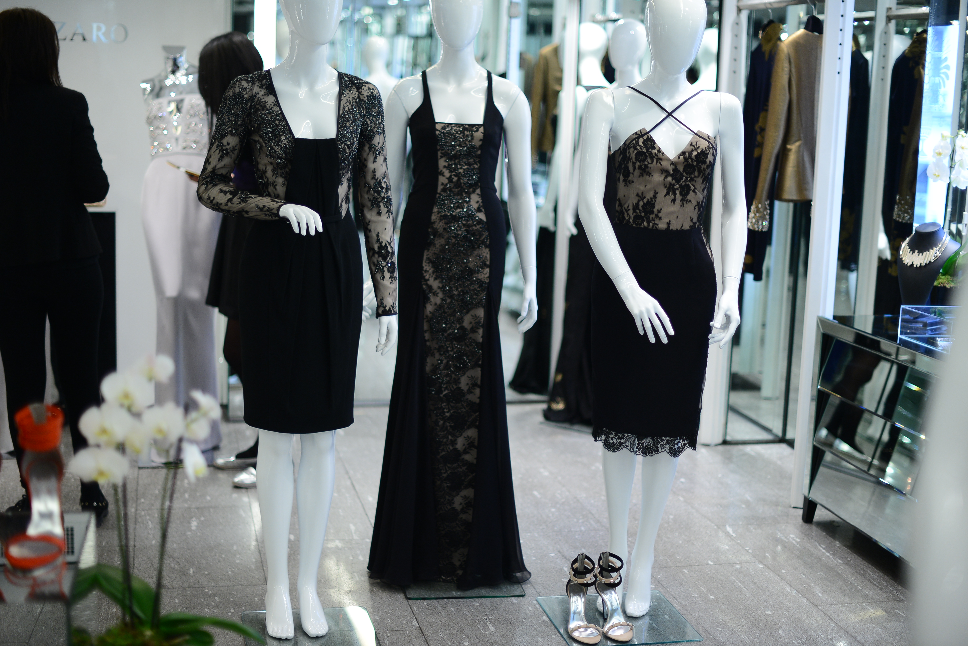 The long silk dresses have sublime silhouettes, and the richness of the design comes from the jewel-encrusted details of the bare back. Subtlety at its finest.
