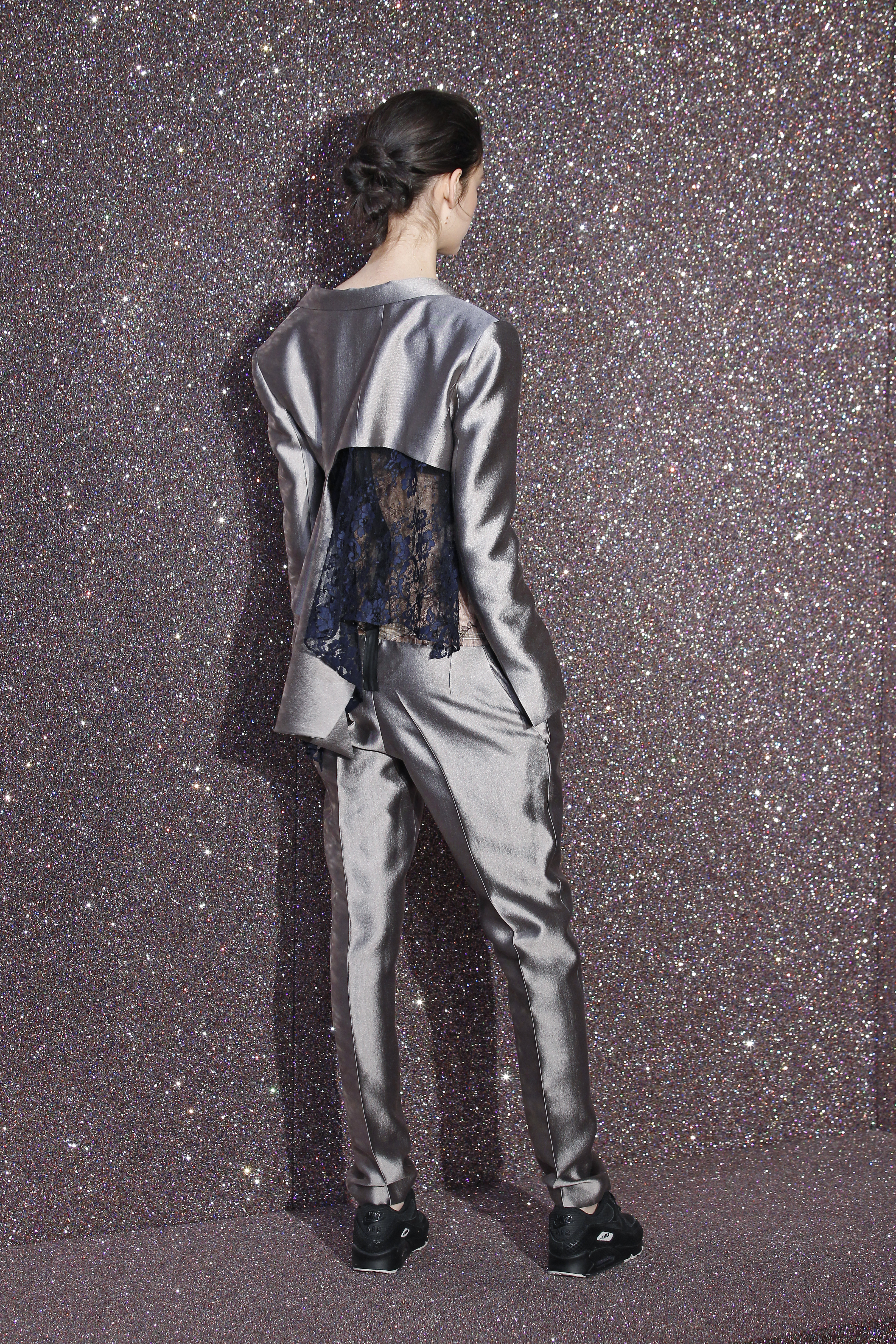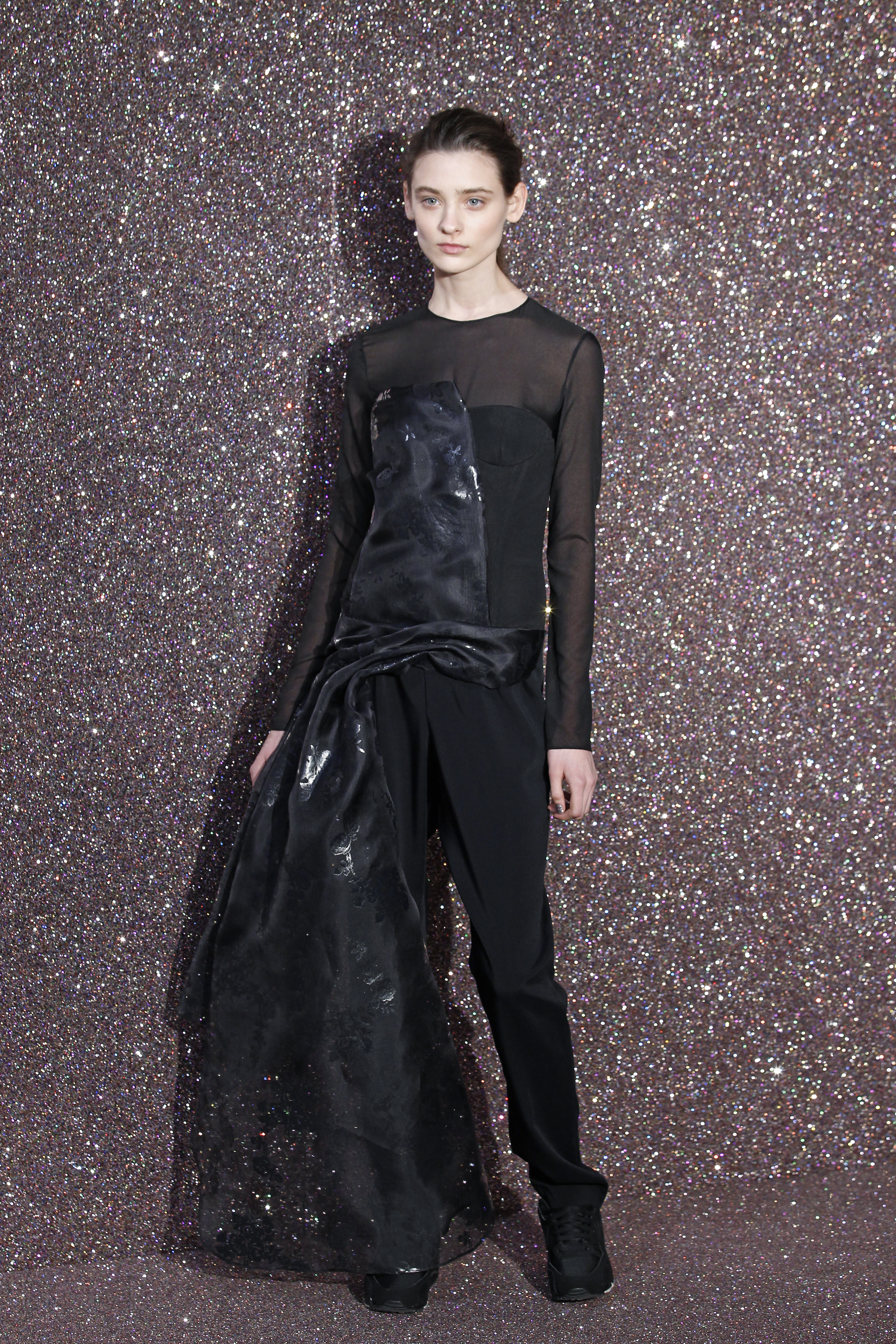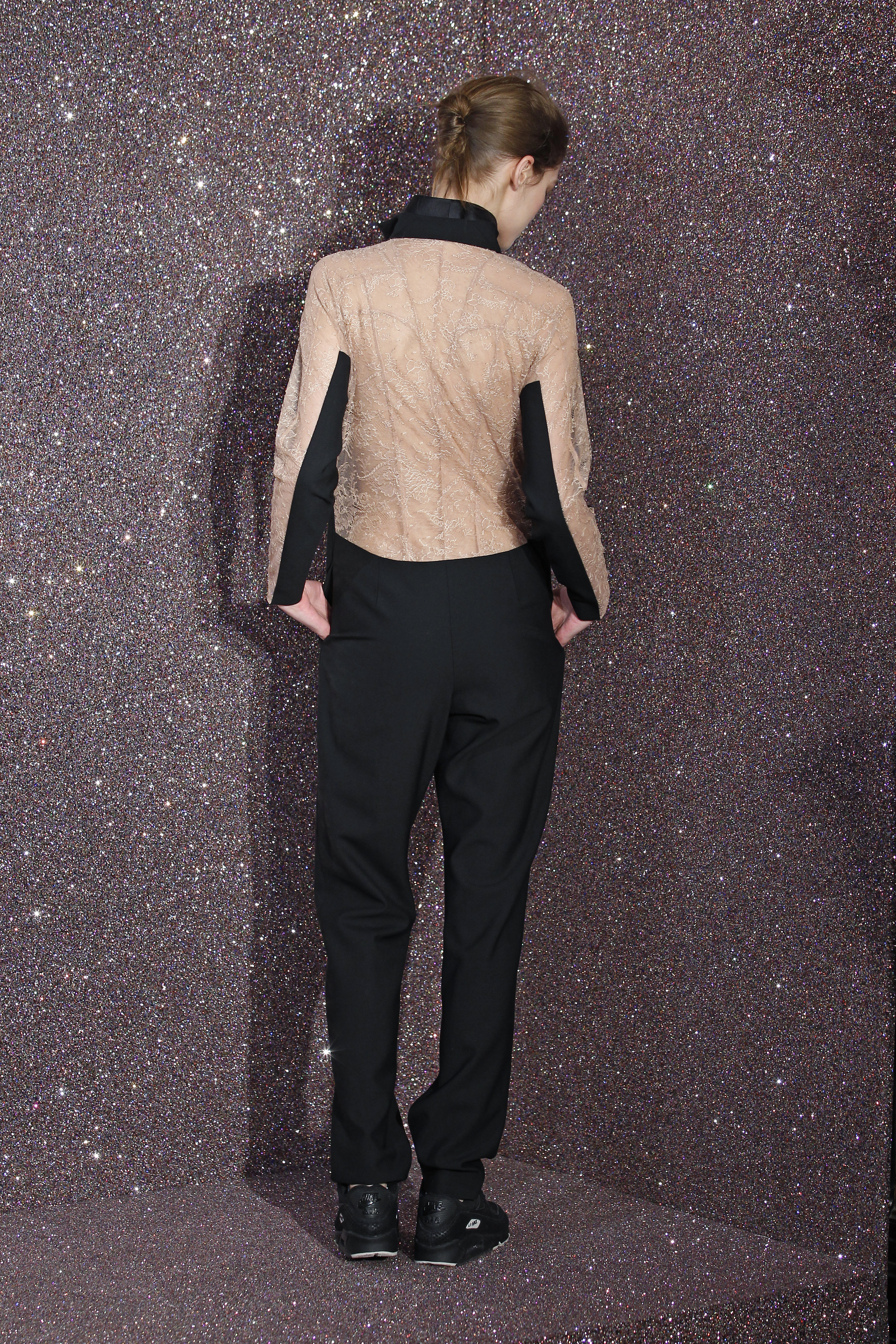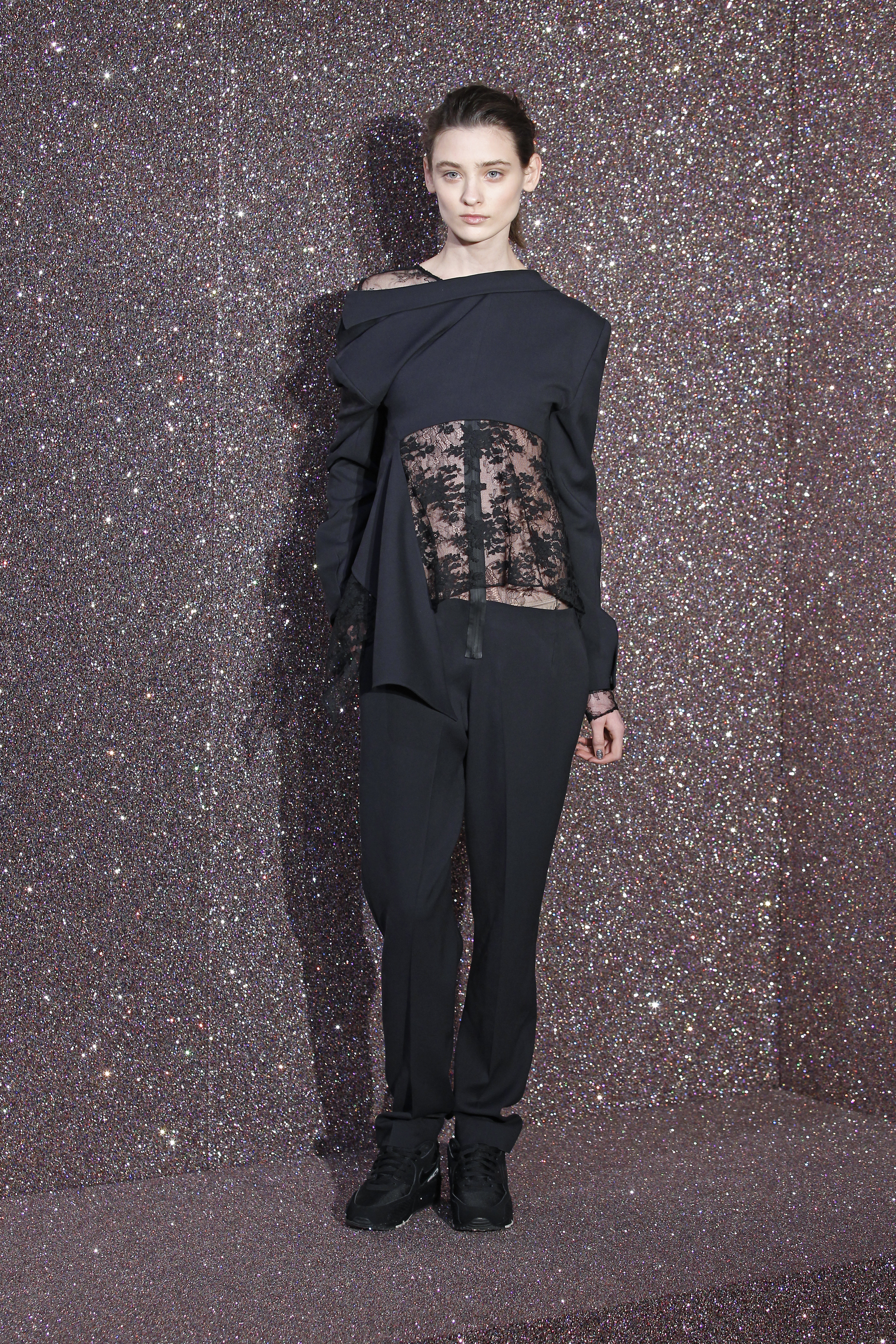 On the face of it, lace and sportswear are two very different things. But Anne Valerie Hash reinvents the city woman for us. The tuxedo is reinvented, embroidered to the extreme and worn with sneakers. The suit is adorned with long trains, giving it a glamorous look. Outfits are unstructured, and black is de rigueur with a few exceptions. Special mention for the magnificent embroidery.