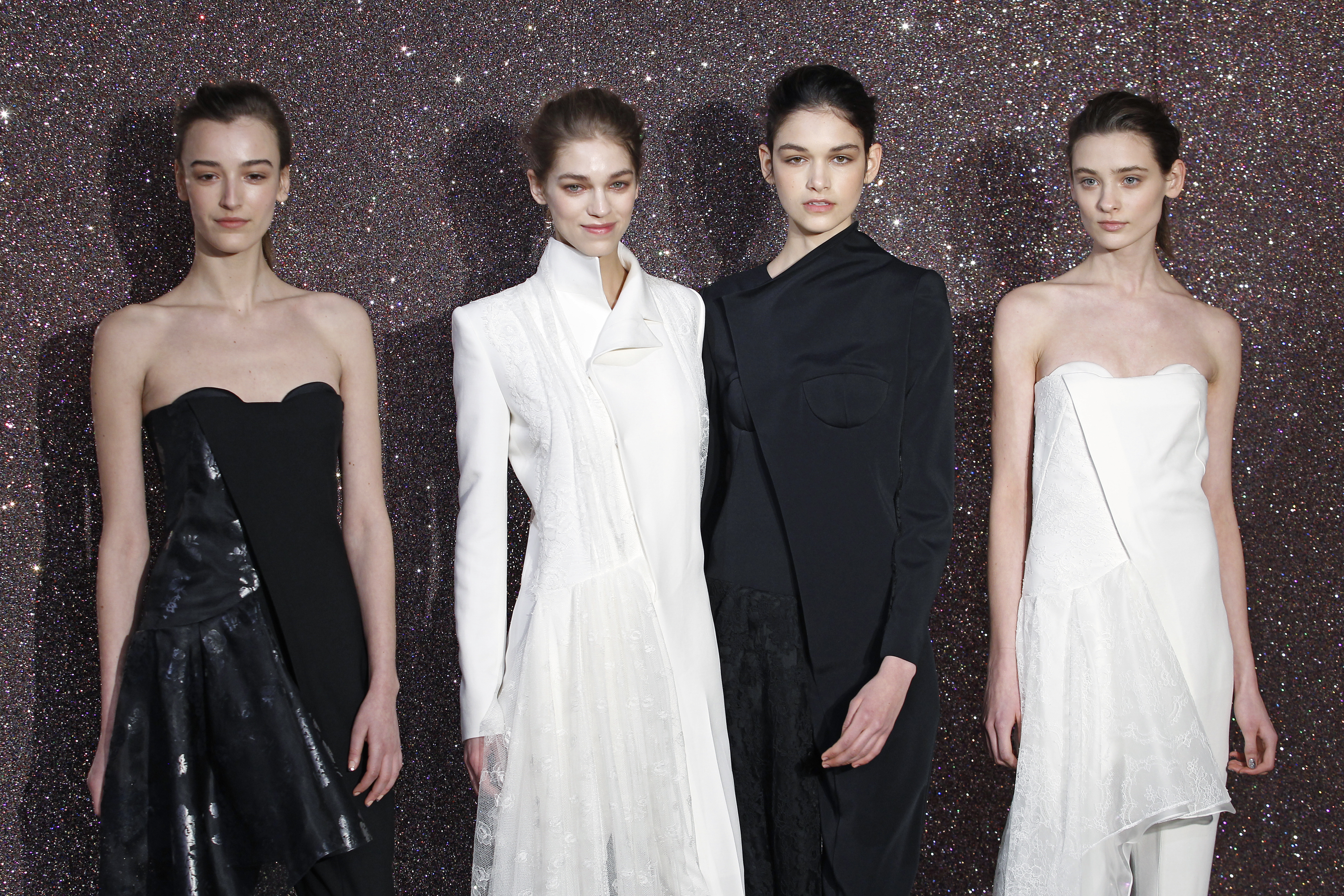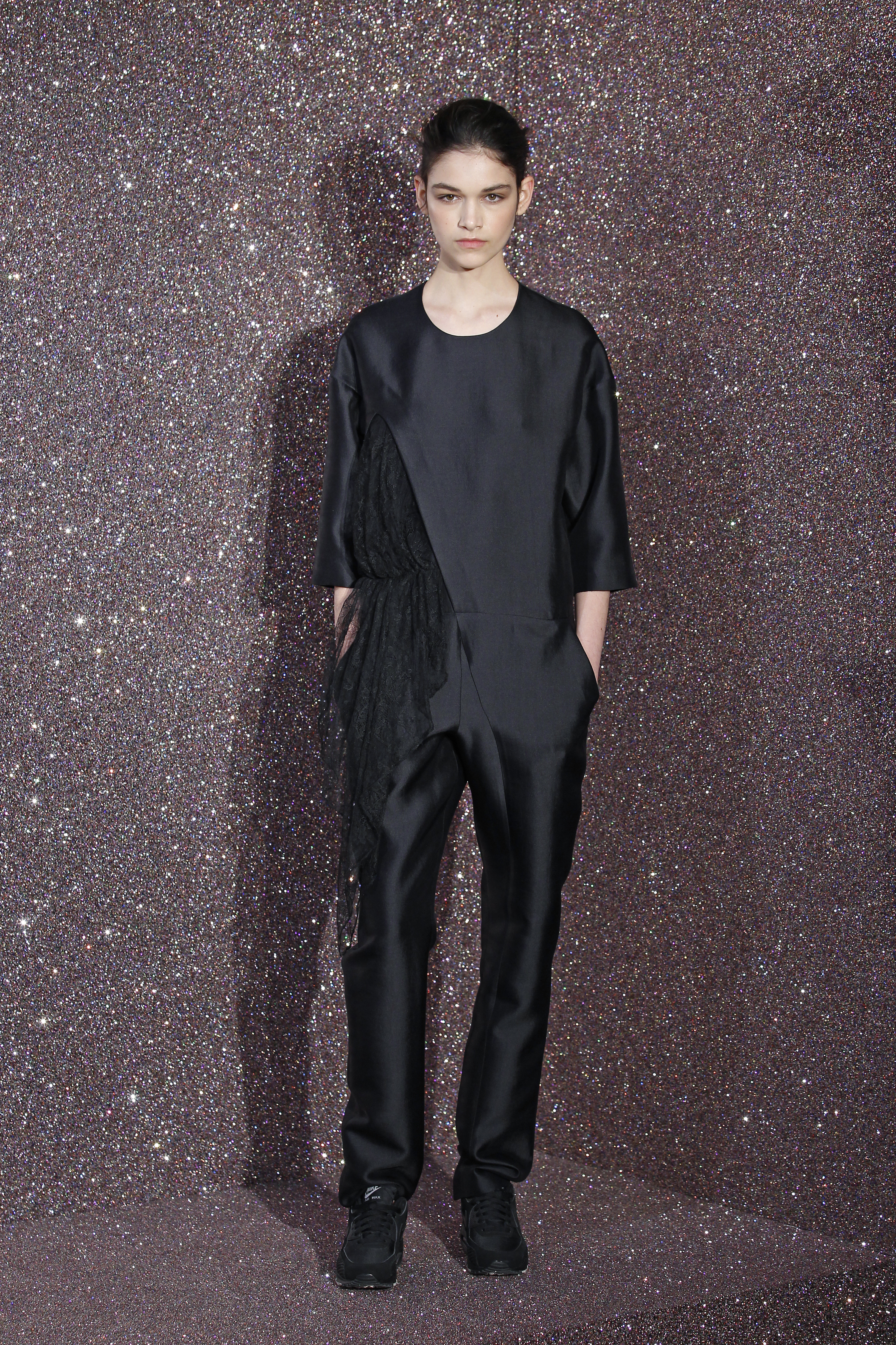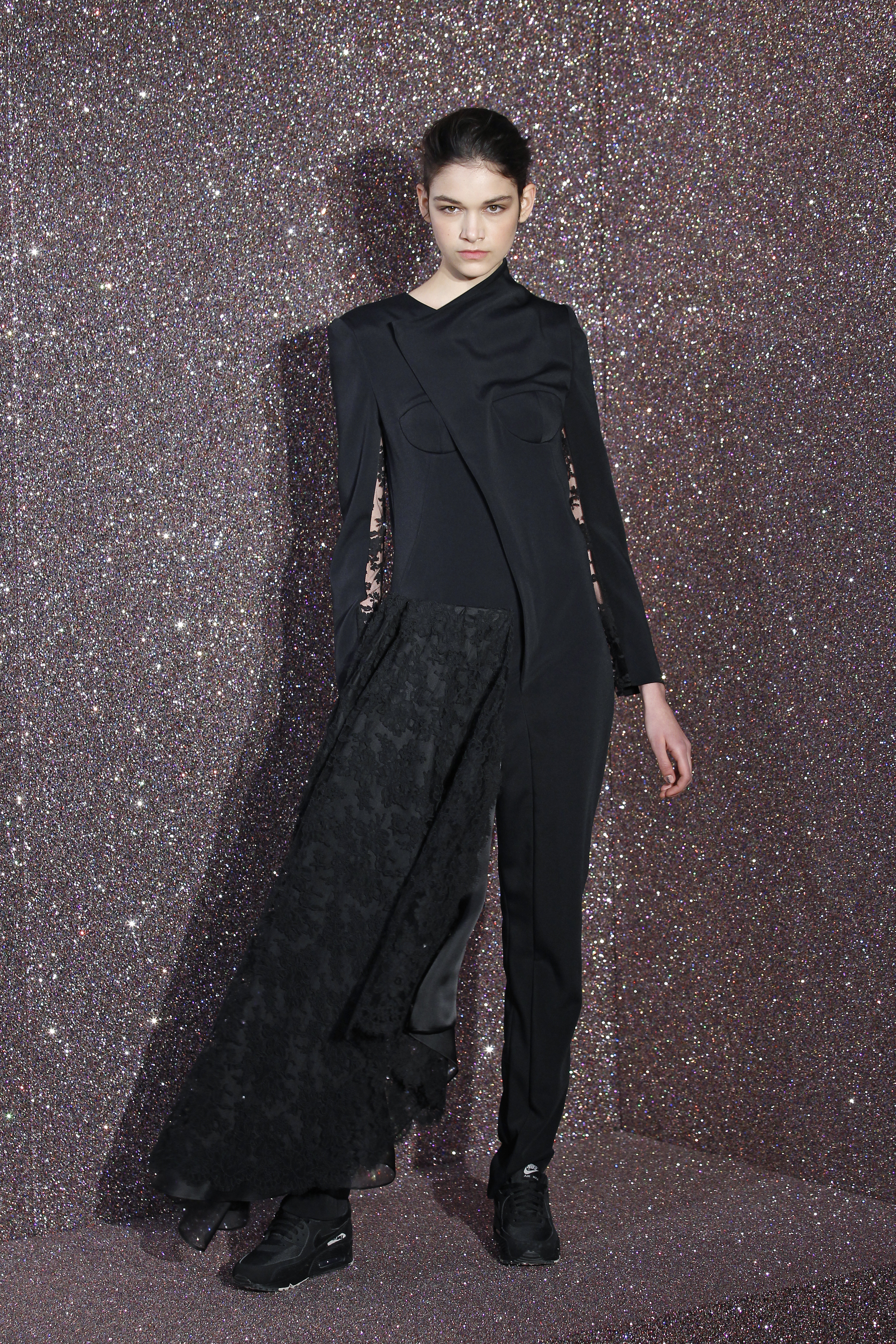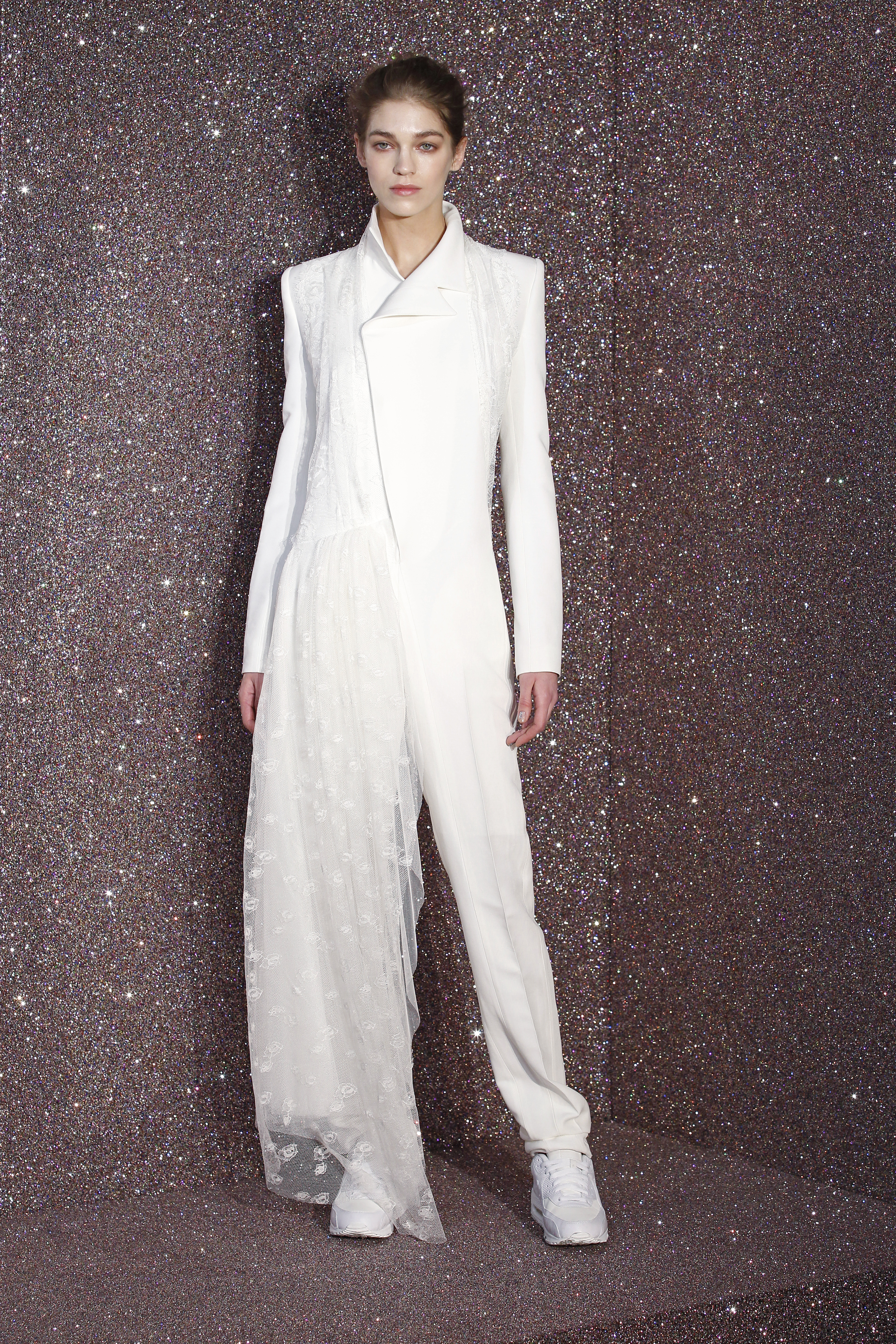 On the face of it, lace and sportswear are two very different things. But Anne Valerie Hash reinvents the city woman for us. The tuxedo is reinvented, embroidered to the extreme and worn with sneakers. The suit is adorned with long trains, giving it a glamorous look. Outfits are unstructured, and black is de rigueur with a few exceptions. Special mention for the magnificent embroidery.