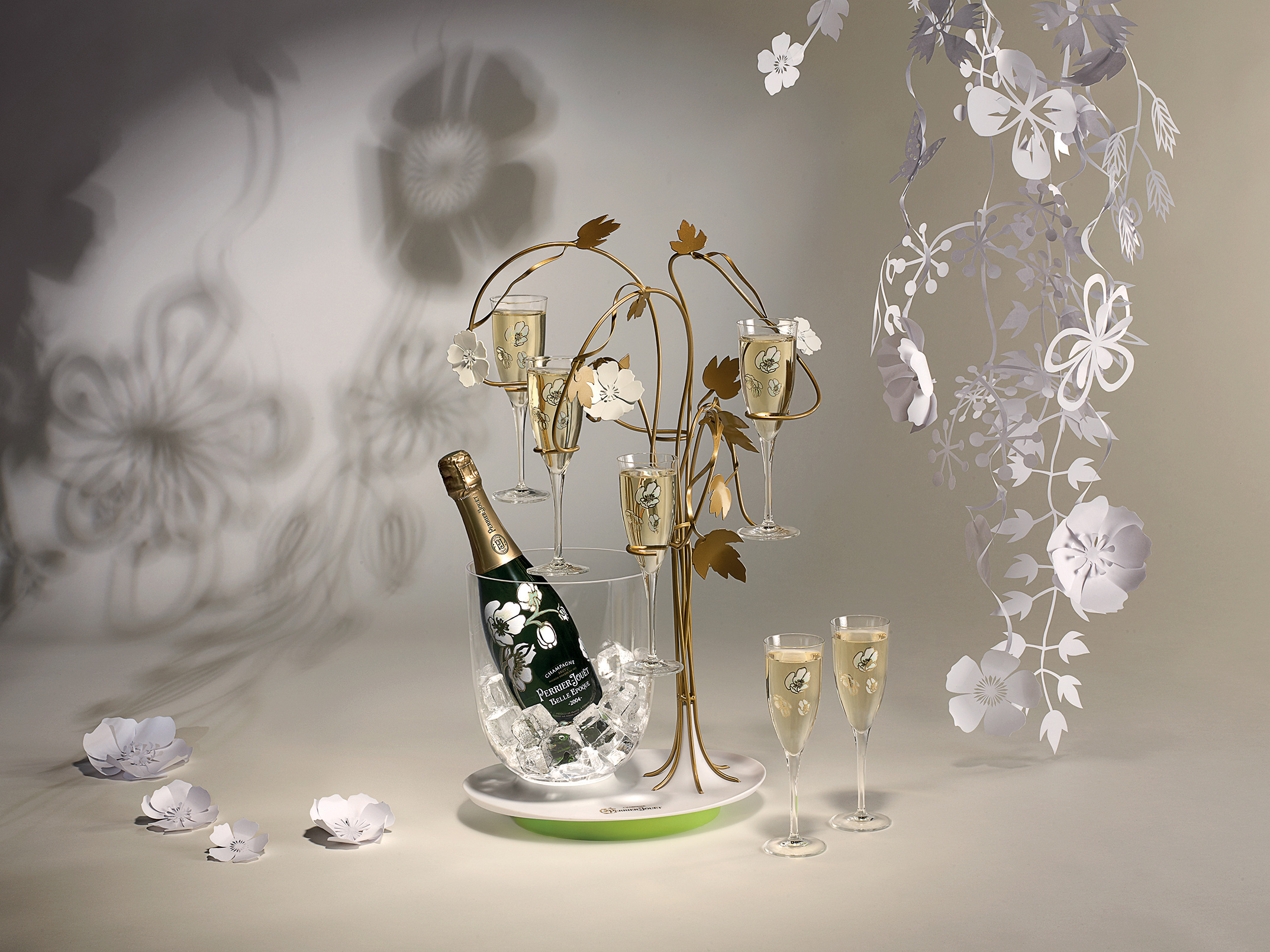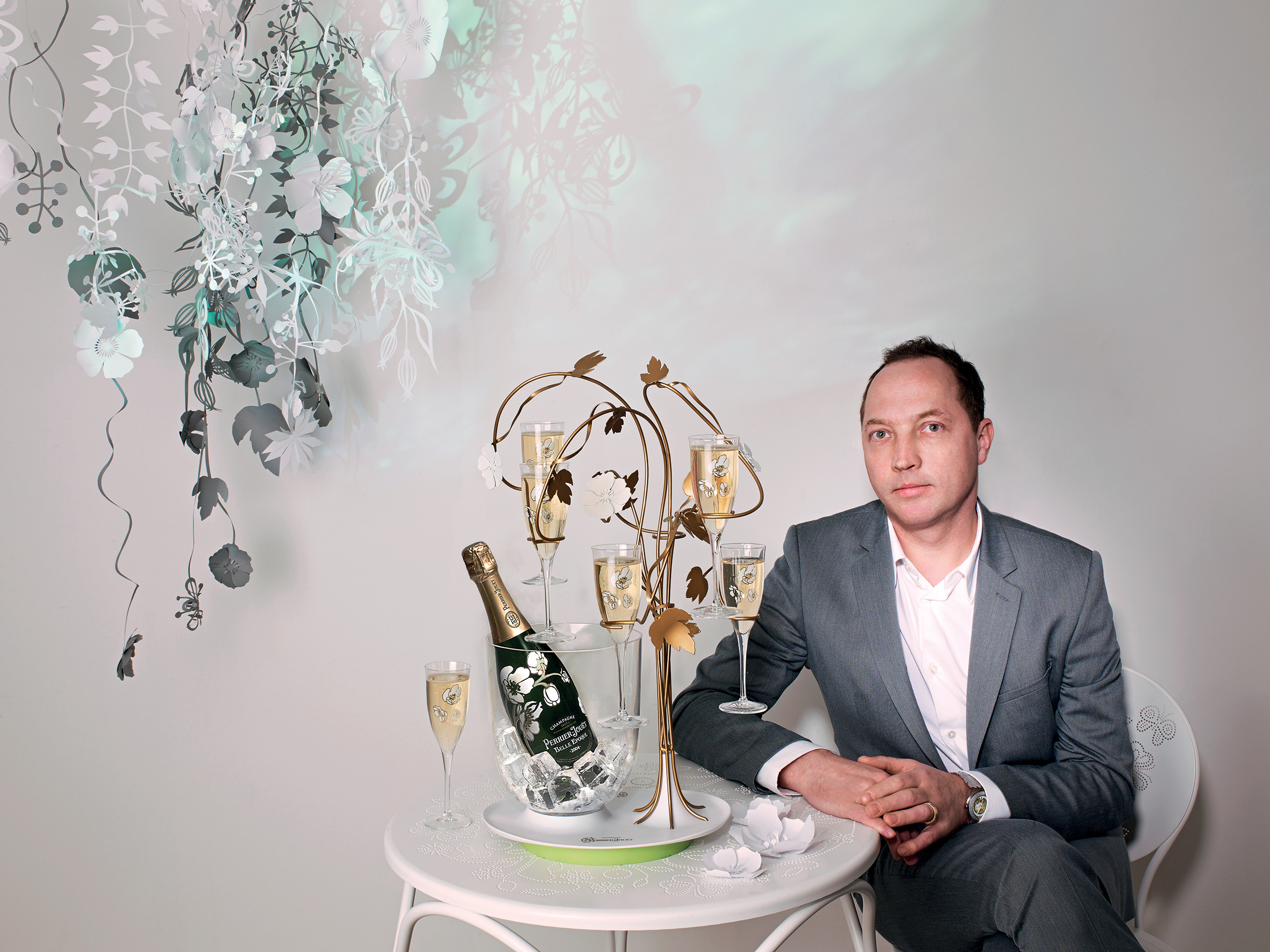 . Specially created for Perrier-Jouët, a champagne service bursting with anemones and flutes blooms at the foot of an ice bucket. Indoors, on a terrace or in a garden, in daylight or moonlight, this astonishing creation unexpectedly transforms the ritual of serving Cuvée Belle Epoque.