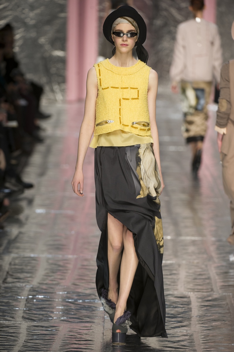 The play of lengths is very present, reinforced by asymmetries on the skirts (mini at the front and long at the back) and the thigh-highs/bottoms/peep-toe. Draping is also present, supporting the fluid yet effective movement of the garments. There’s also a mix of materials, with leather jackets structuring a rather airy silhouette (or knit sweaters and metal chains breaking up the ethereal side of loose pants).