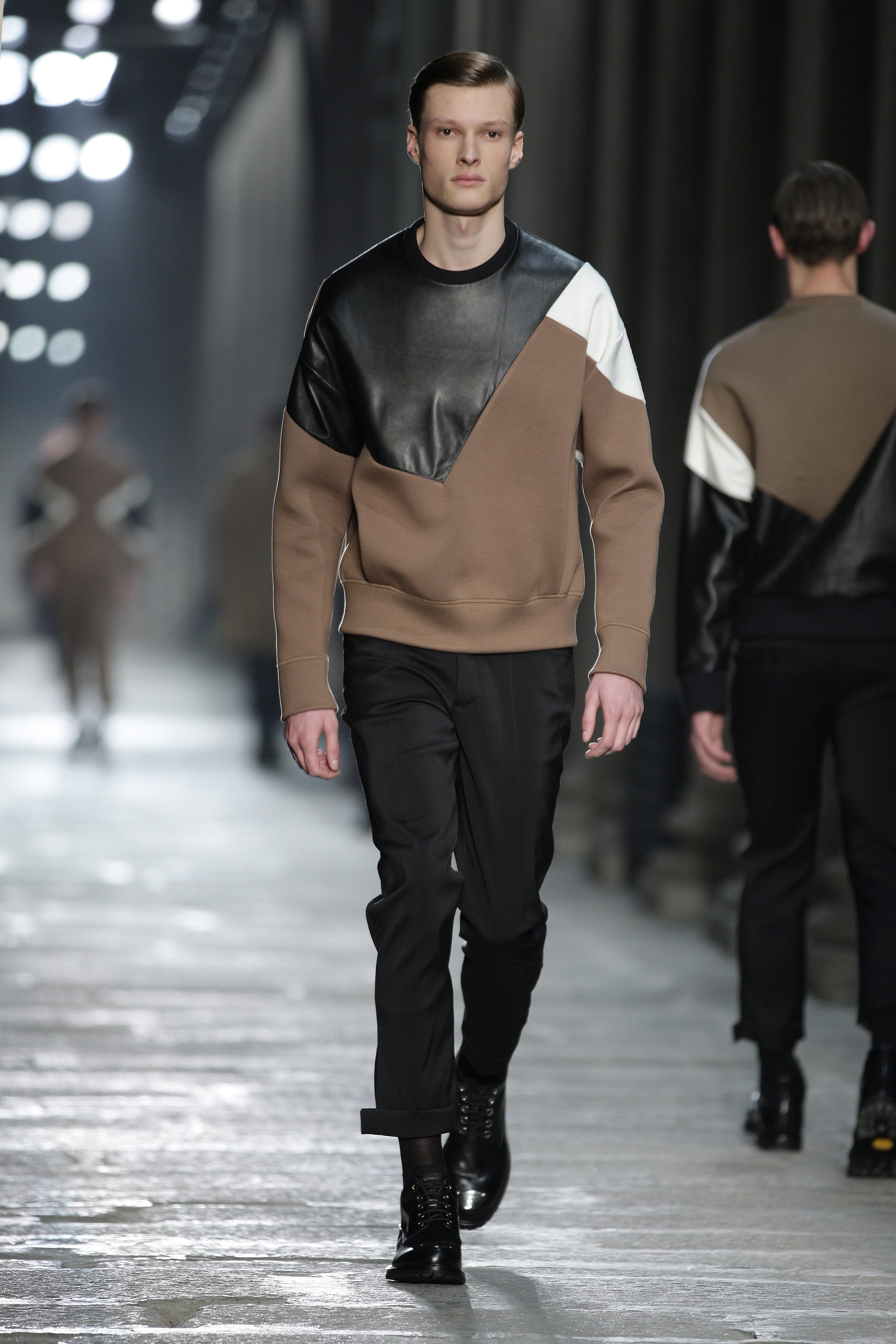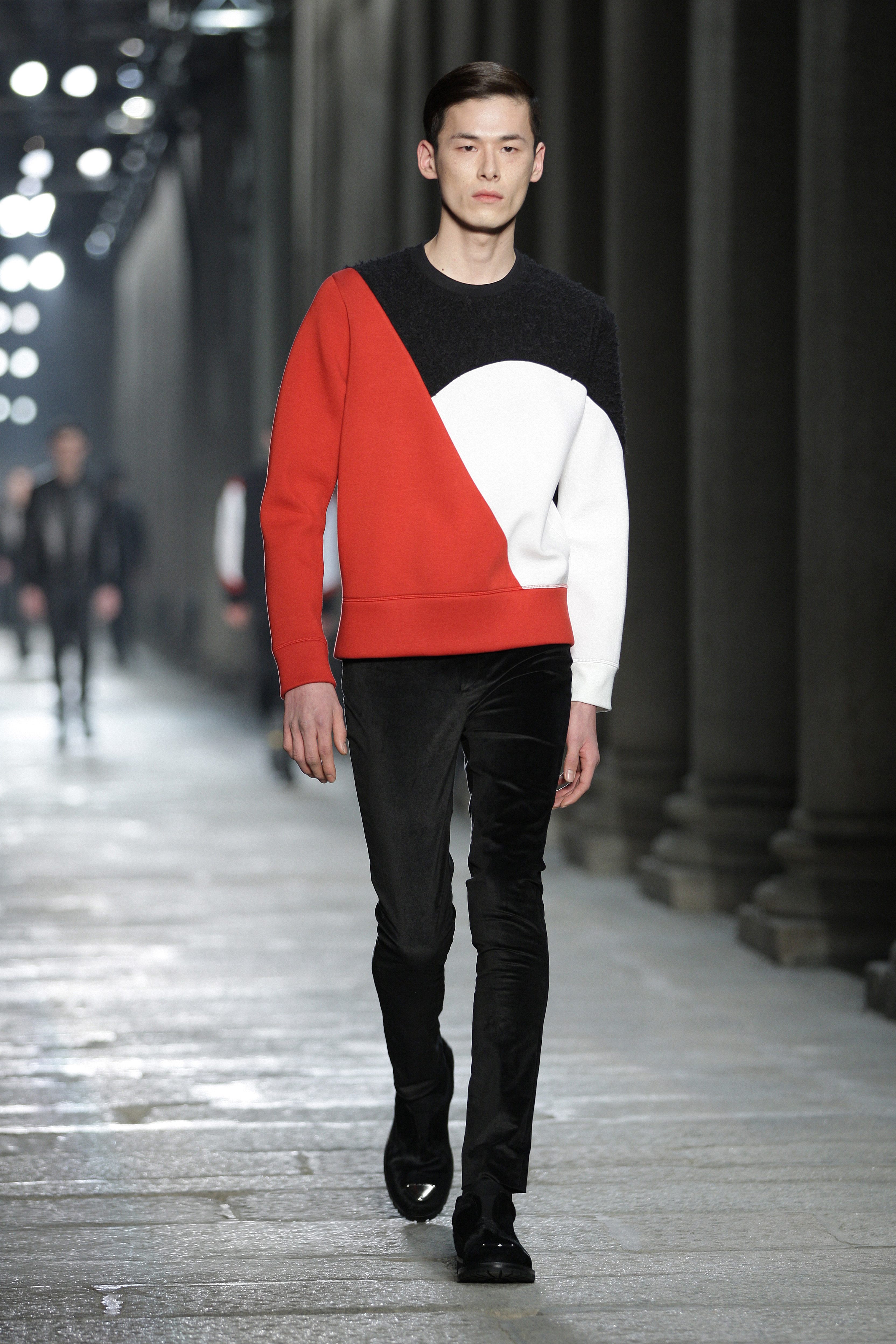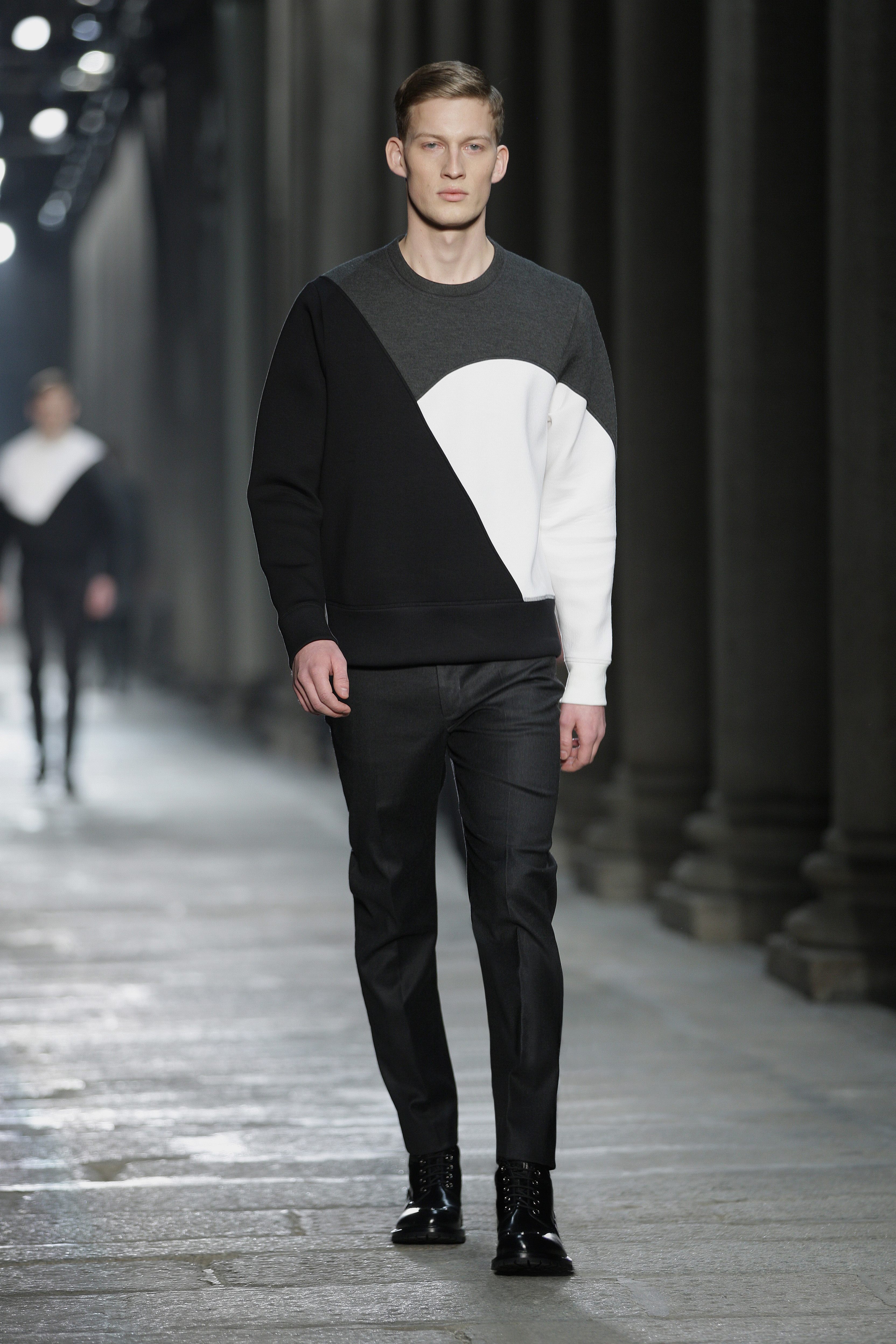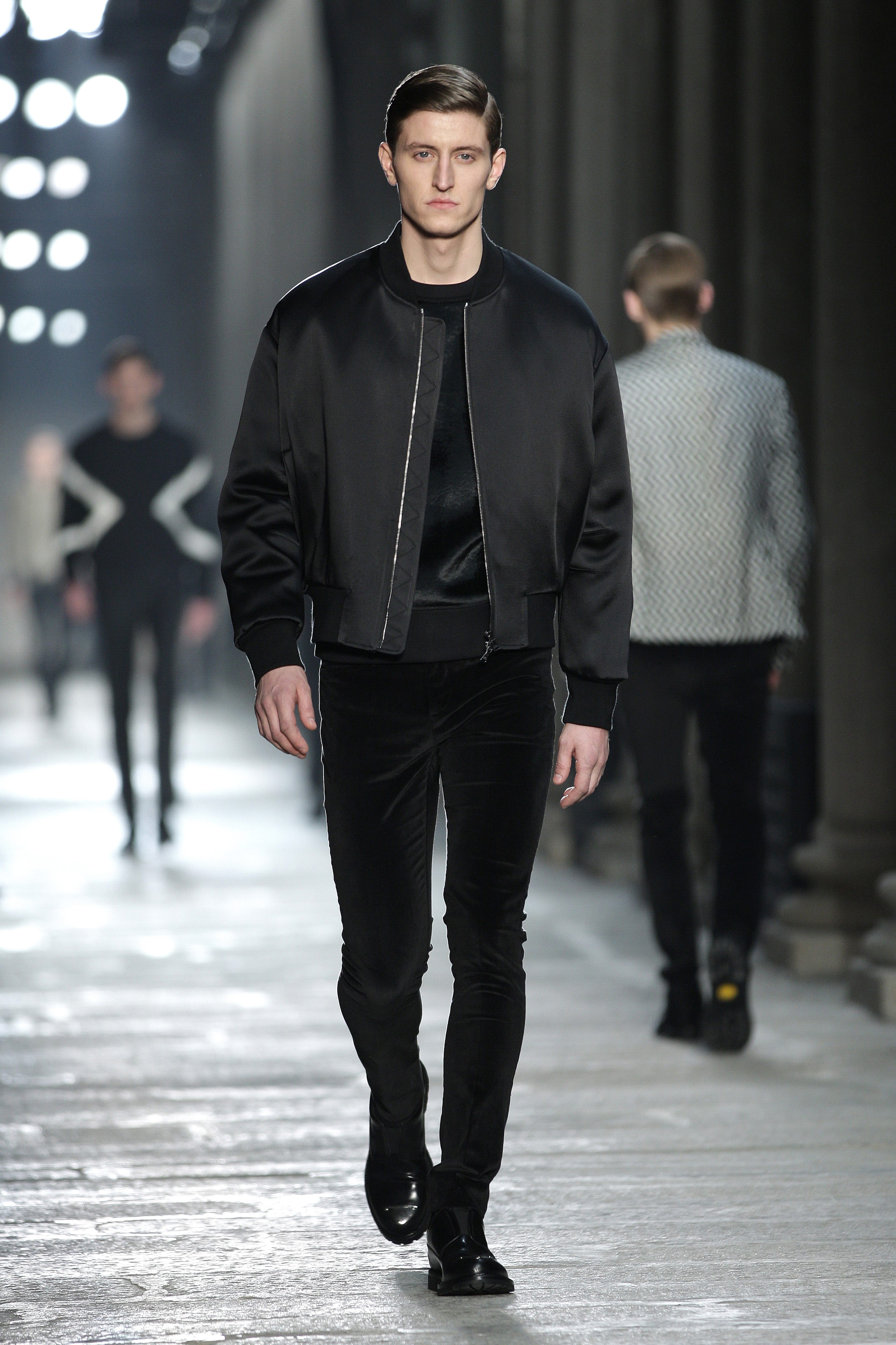 Simplicity doesn’t seem to be the only notion imbued with the Bauhaus movement; functionality is also at its heart. Bombers, sweaters and coats – these are the kind of clothes Neil Barrett offers that are beautiful and appropriate for winter, without falling into a rigorist aridity that would make the collection boring. What the color palette lacks in fantasy, Neil Barrett reinjects in shapes, fabric mixes and prints.