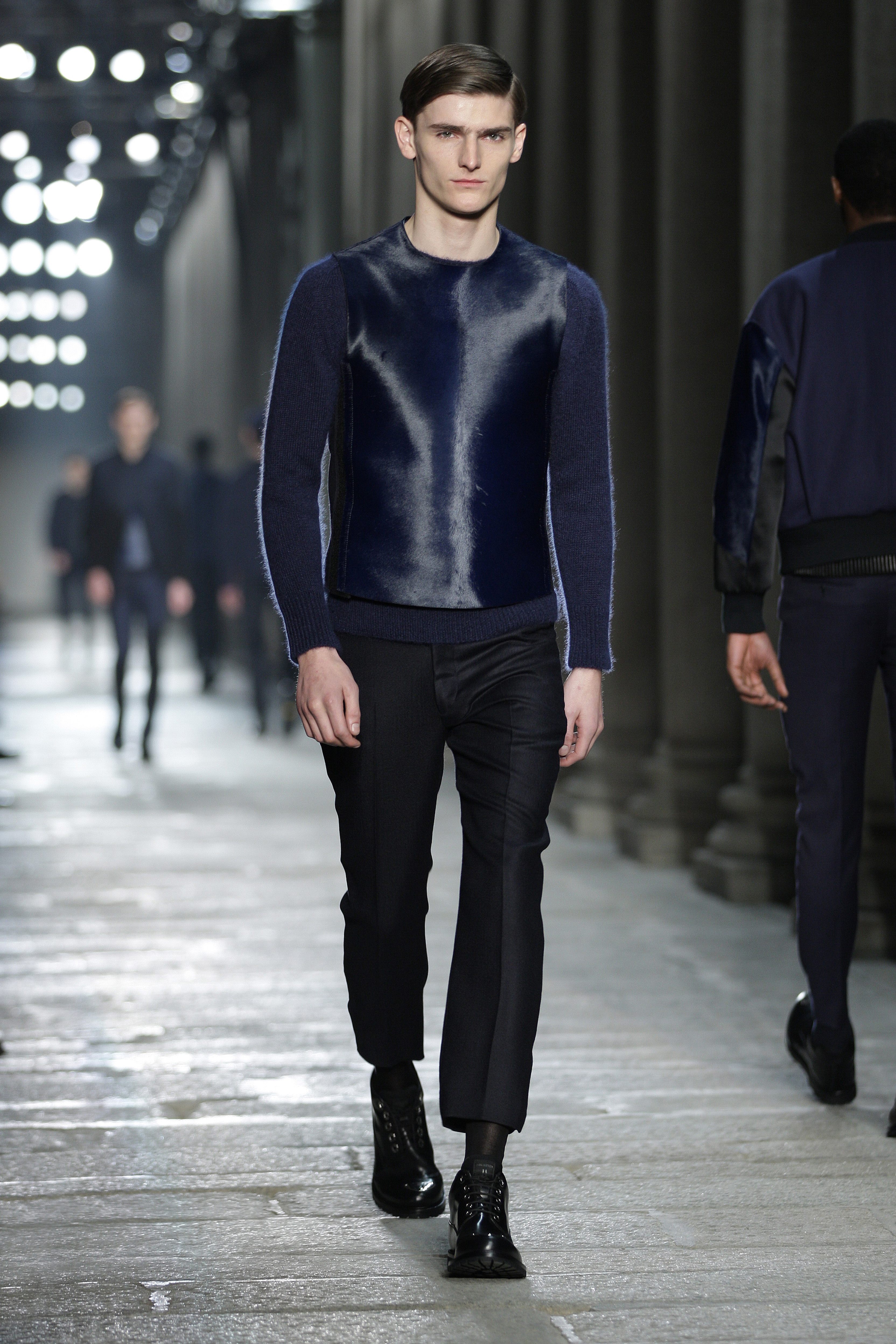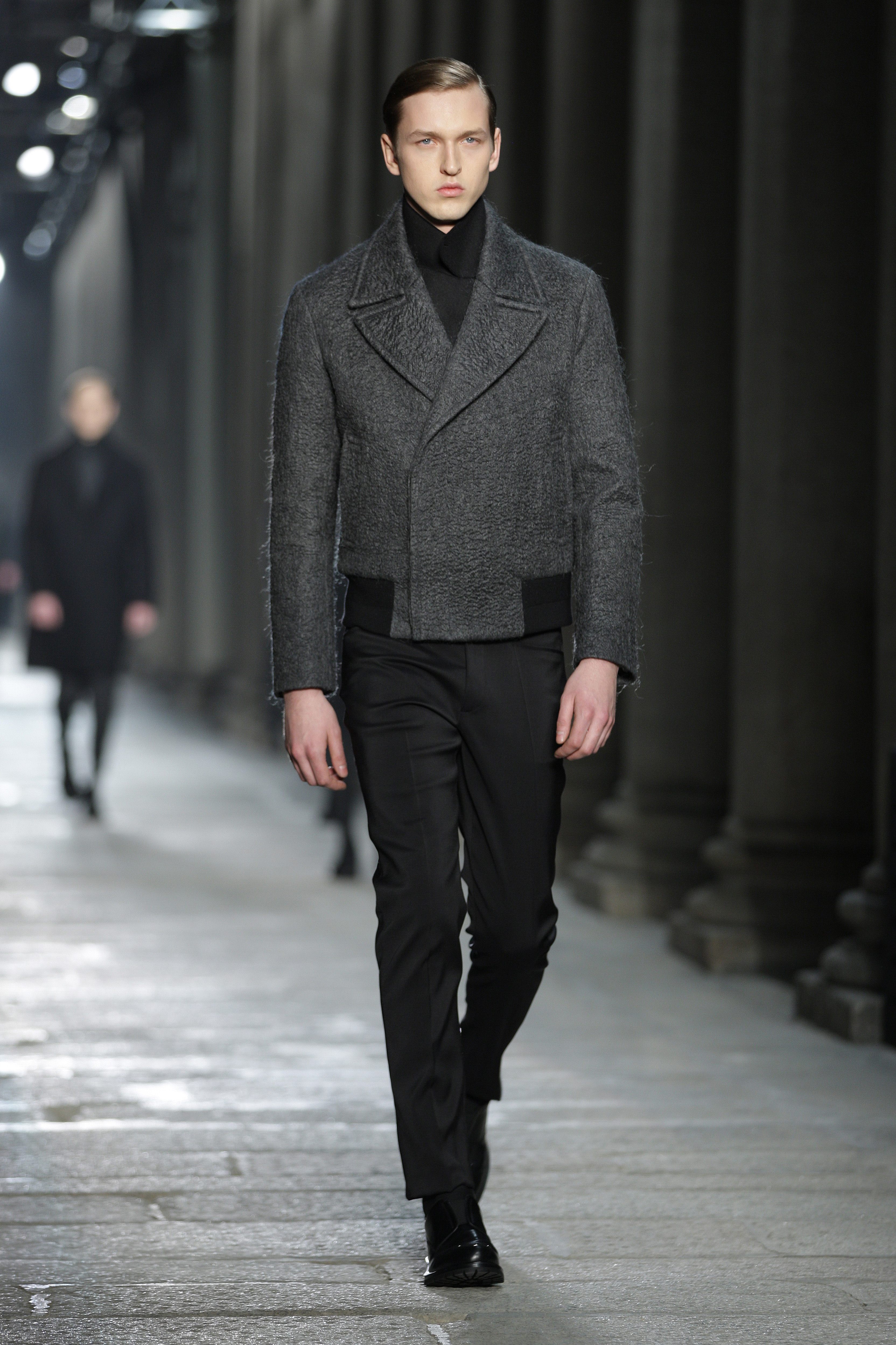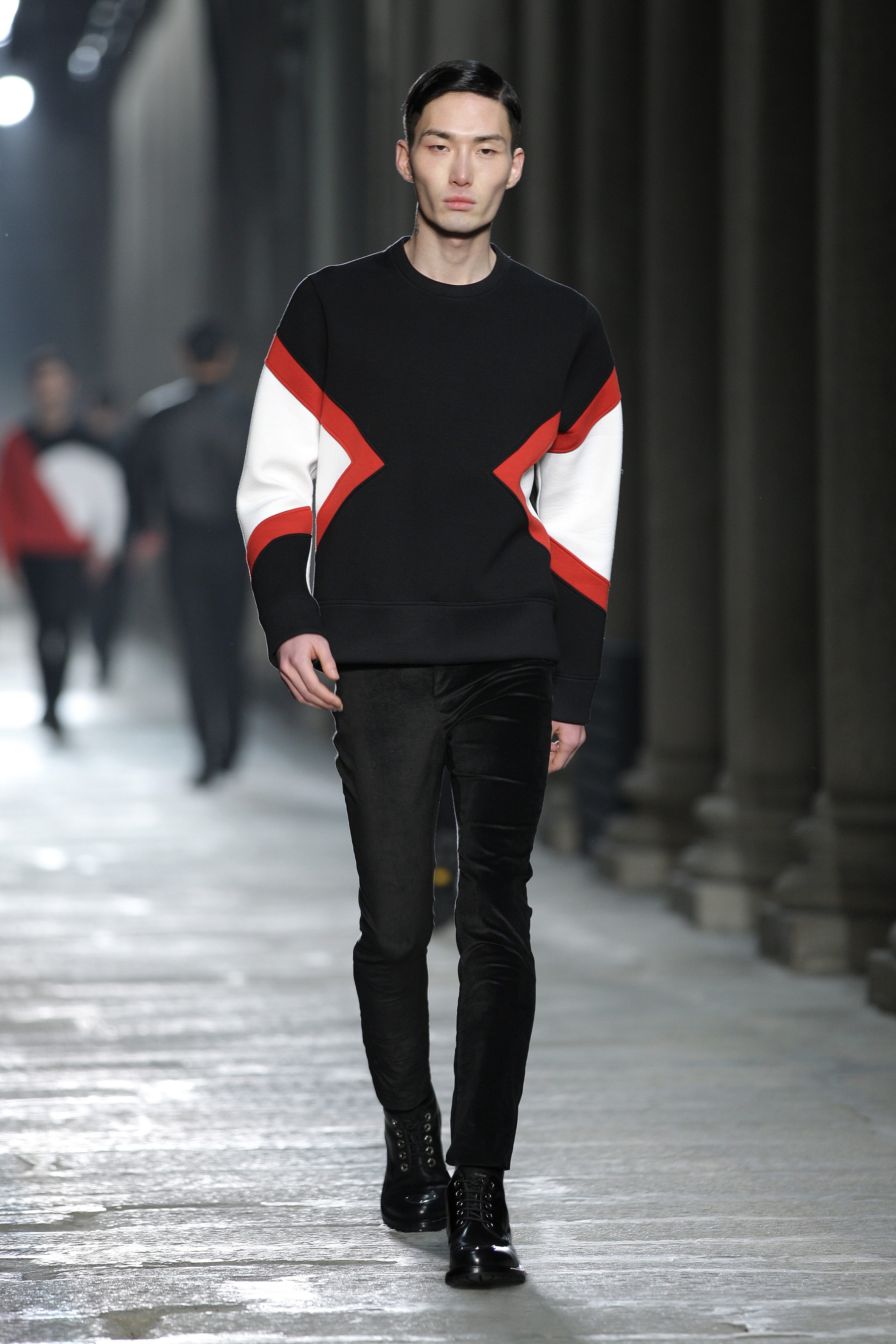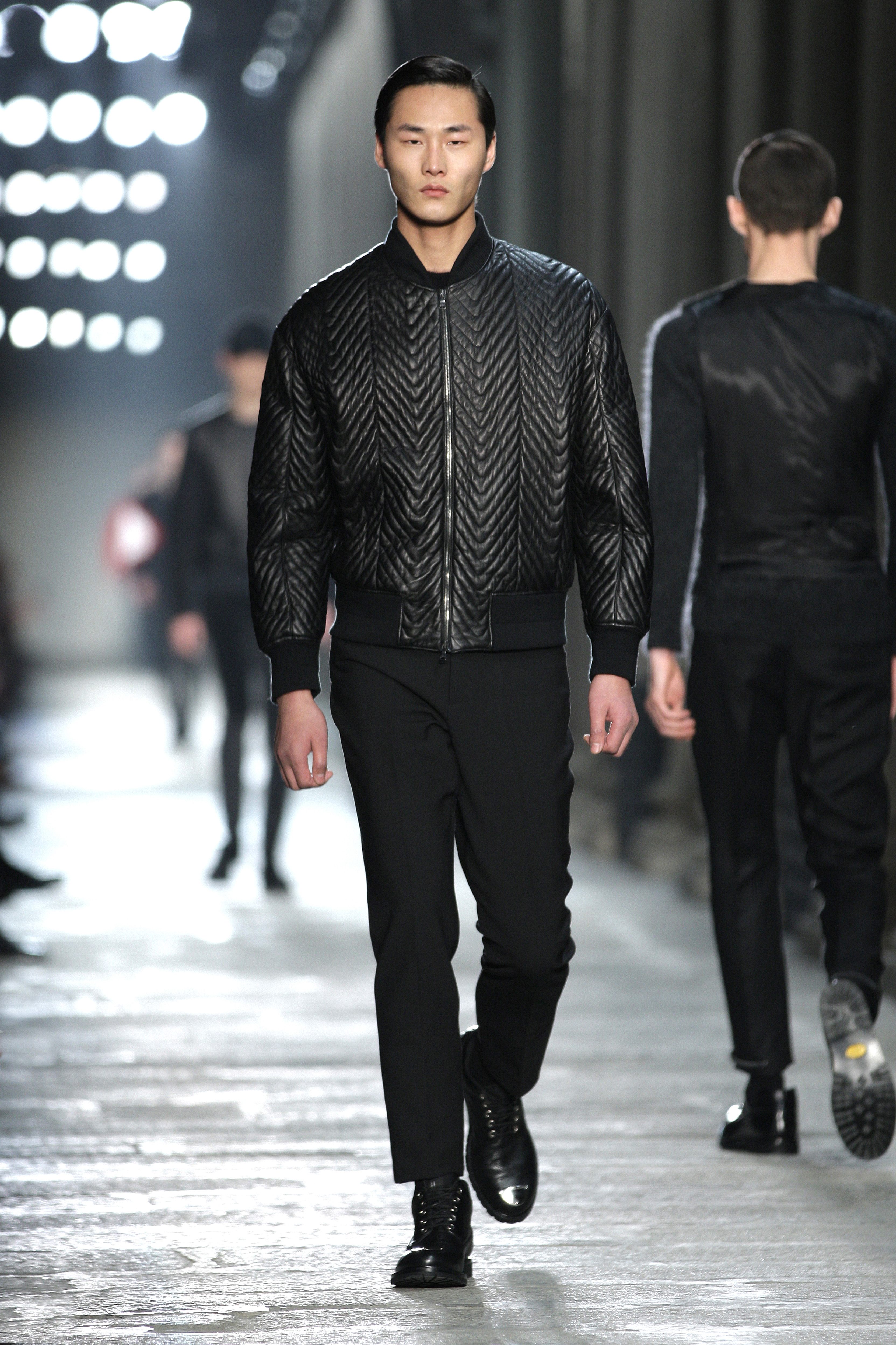 Simplicity doesn’t seem to be the only notion imbued with the Bauhaus movement; functionality is also at its heart. Bombers, sweaters and coats – these are the kind of clothes Neil Barrett offers that are beautiful and appropriate for winter, without falling into a rigorist aridity that would make the collection boring. What the color palette lacks in fantasy, Neil Barrett reinjects in shapes, fabric mixes and prints.