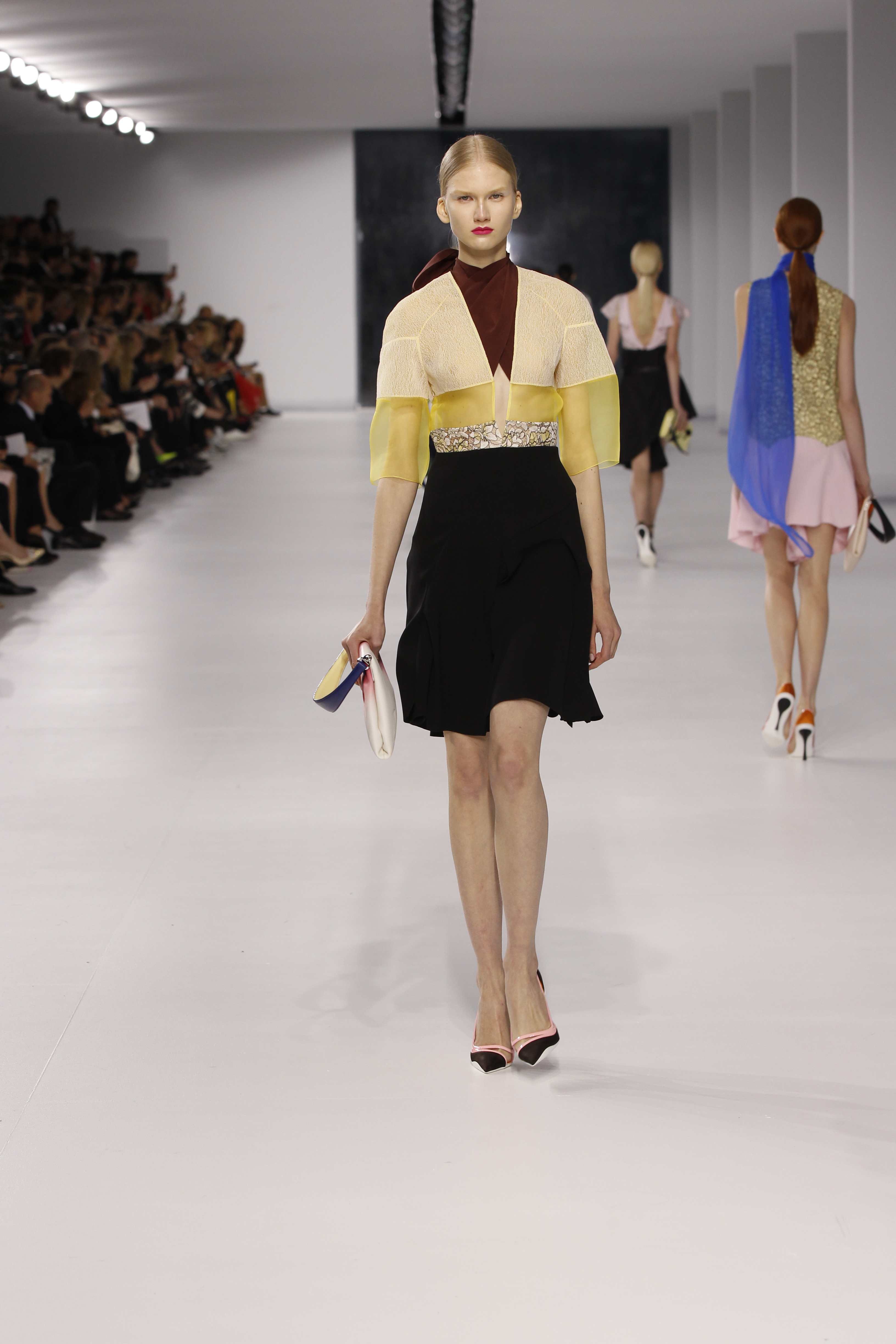 Of course, this is a graphic collection in which every seam and every detail serves a visually pleasing purpose. With strong color blocking complementing the mix of materials and collar details (reminiscent of those in his menswear collection for his own label), Raf Simons dares to mix genres, creating asymmetrical garments far removed from the polished idea we might have of the House of Dior. A refreshing dose of modernism.