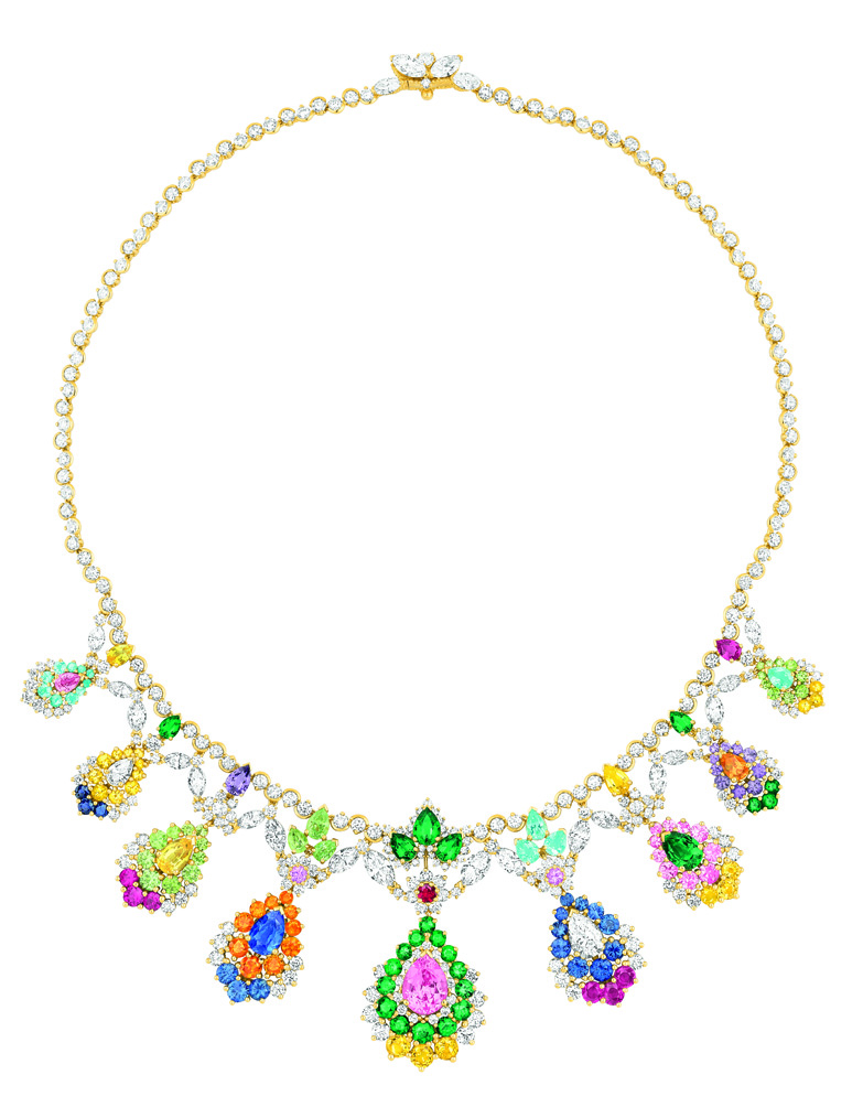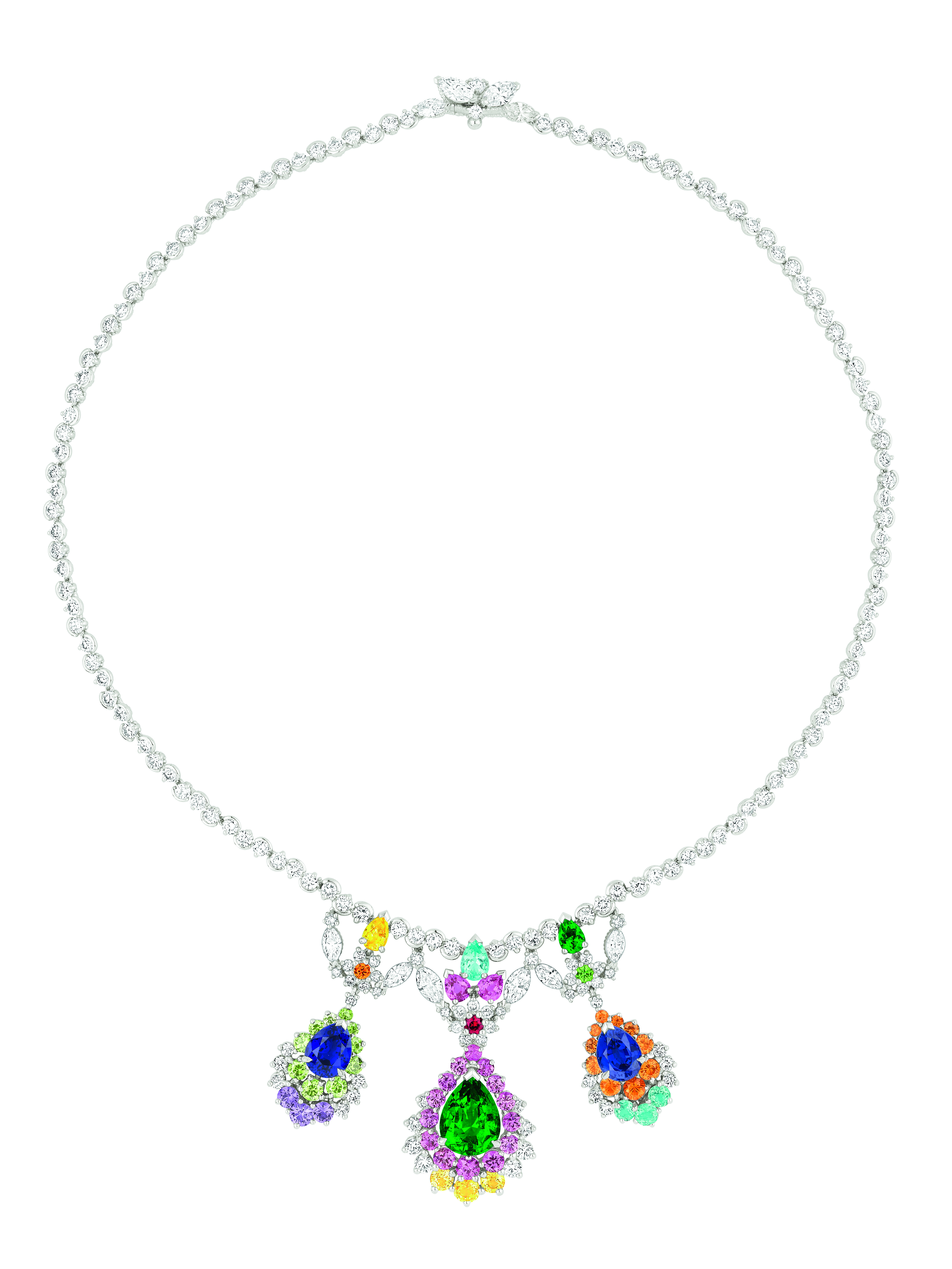“Dearest Christian” is how Victoire’s letter might begin, as her Cher Dior collection is such a tribute to him. And then she tells him about their shared passion: color. Bright reds – scarlet, English red, crimson or cherry – are full of youth and gaiety,” wrote Christian Dior in his Little dictionary of fashion. There’s one for every woman. Or, a little higher up: “When choosing a blue, be careful to look at it in both daylight and electric light, as it can look different.” Choosing shades, harmonizing hues, matching them or, on the contrary, clashing them – Victoire de Castellane also masters this talent of the couturier. And the colors respond to each other: red and blue, the silks and fabrics of the day become rubies and sapphires. As with all our collections, but this one in particular, the subtlety of the stones highlights the work on color. Diamonds, spessartite garnets, demantoid garnets, Paraiba tourmalines, rubies, emeralds and a whole range of sapphires, from light to intense yellow, from pale blue to deep violet, through all shades of pink.