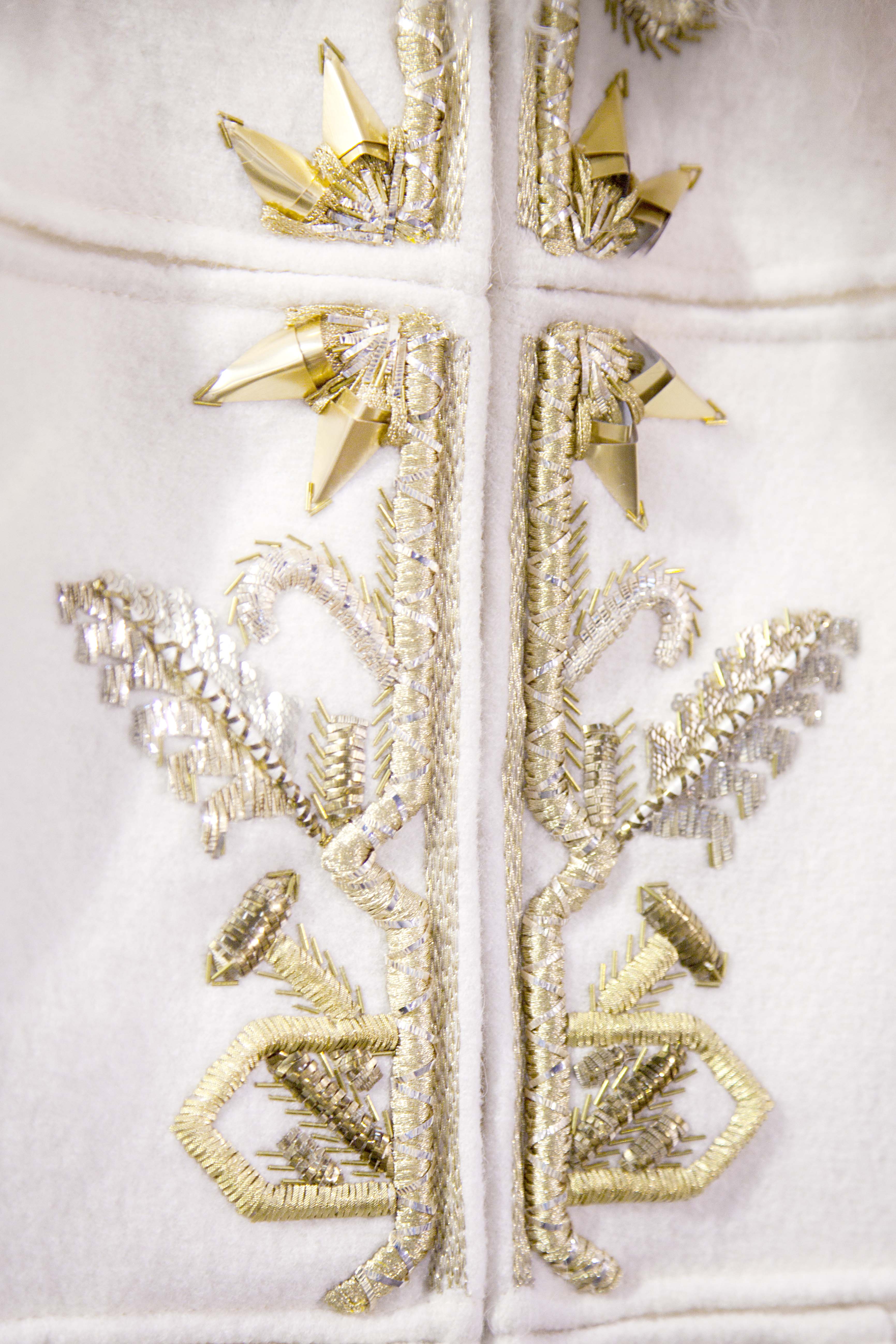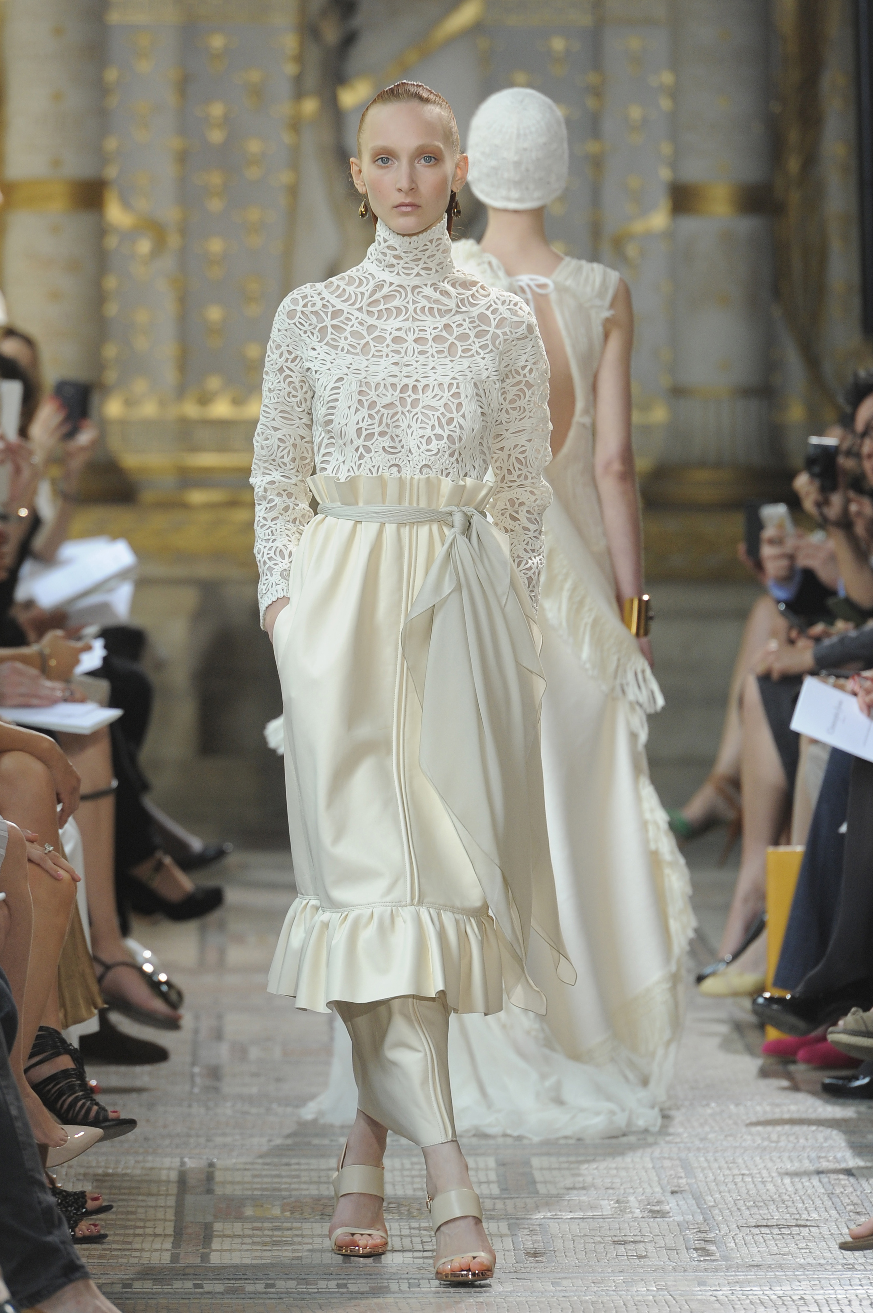 The roughness of milky felt is quilted with raw-thread embroidery, the leather of a peasant skirt combines with the laces of a Victorian blouse.