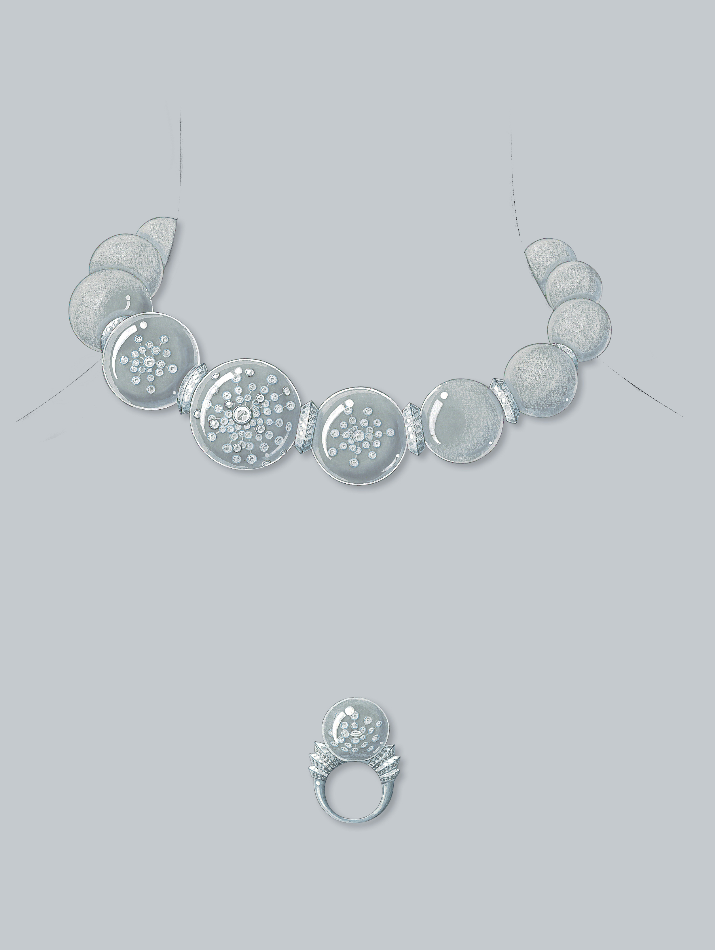 To counterbalance the weight of the rock crystal and make this dense yet very fragile material light, the 19 bubbles in the necklace were patiently hollowed out, then ground and polished – a process that took many hours of work.