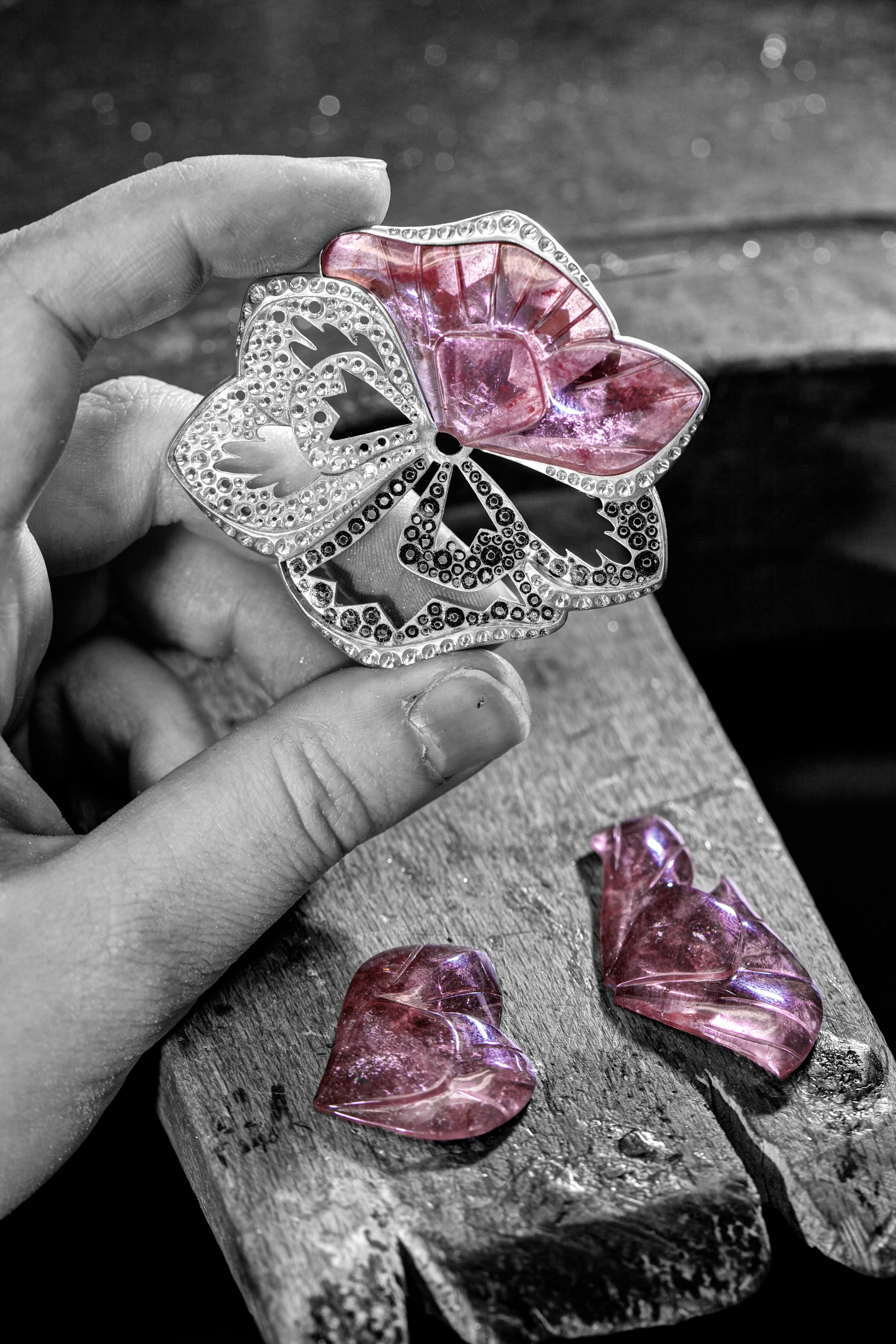 At the end of a stem paved with round diamonds, a white gold flower unfurls into nine petals paved with snow-set diamonds, all volume and superimposition. In the center, pistils set in diamonds and enhanced by gold threads covered with ultra-fine gold beads reveal an extraordinarily fine openwork design. Beneath it, another is detached to be worn as a brooch, representing the shadow of the first. It is sometimes transparent and pink in sculpted tourmaline, like the morning dew, sometimes opaque and grey in mother-of-pearl, like the evening rise.