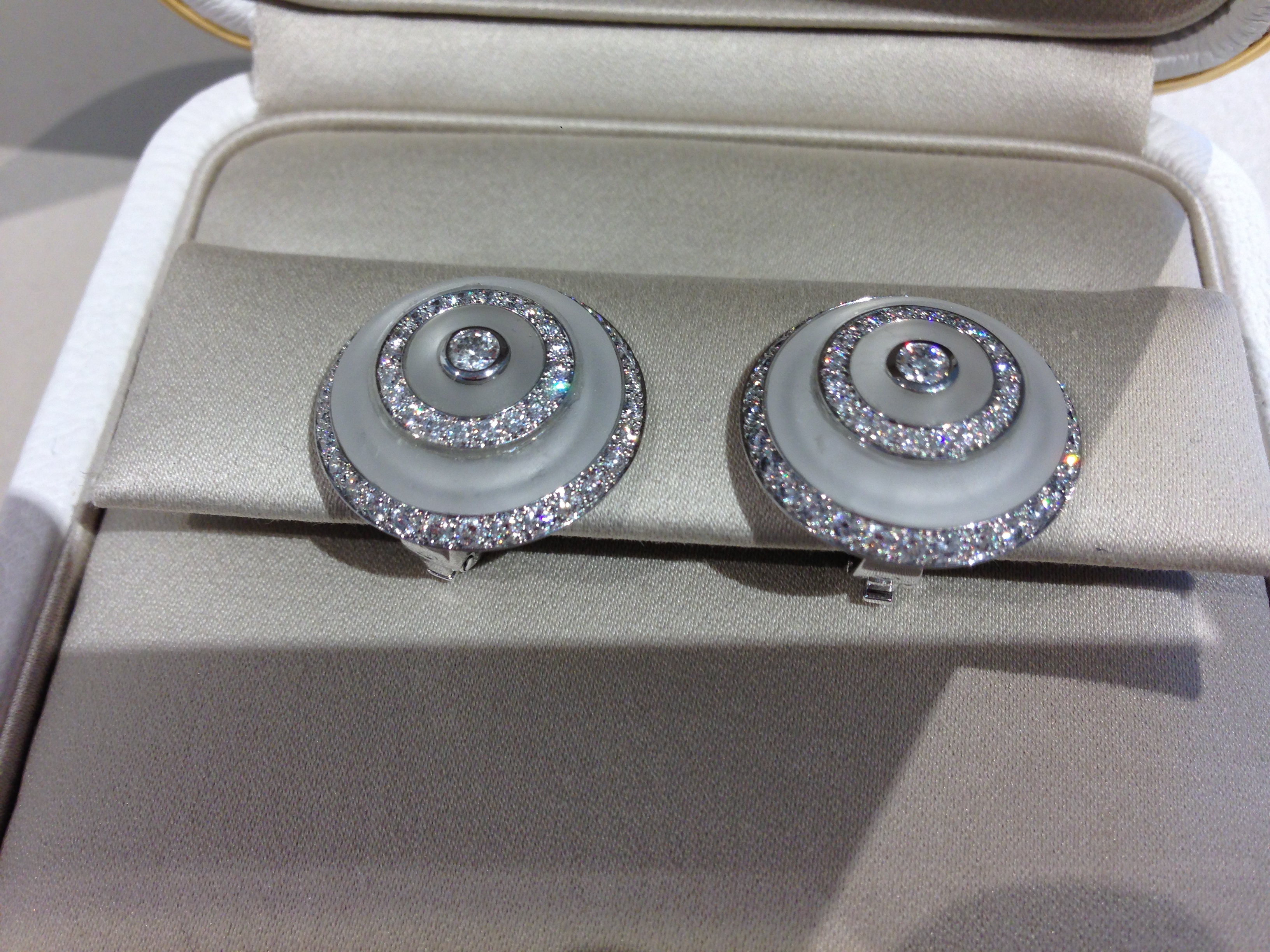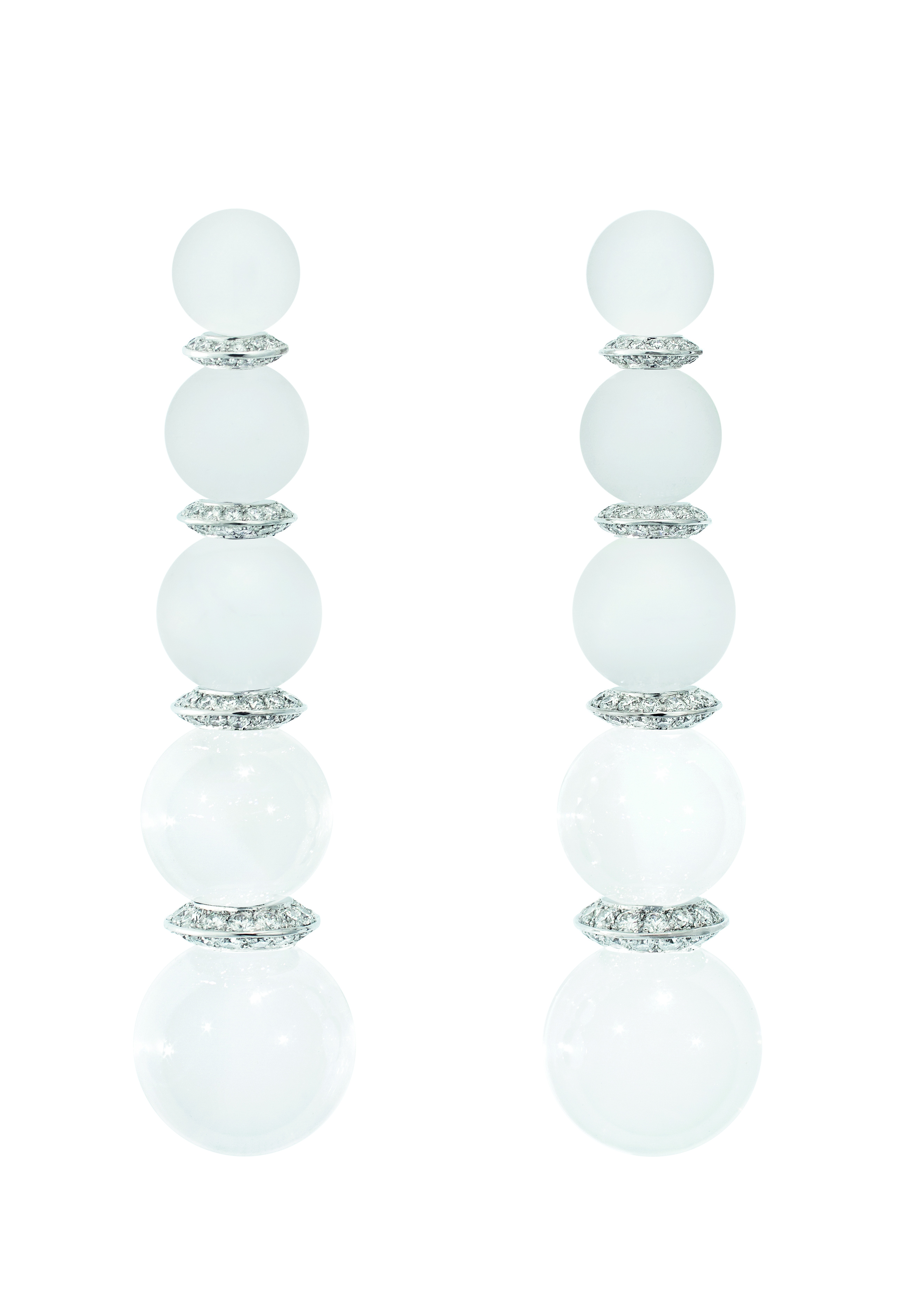 In addition to this deliberately free rhythm in the arrangement of the stones, the beauty of this set lies in the fascinating complexity of the rock crystal drop set off by diamond pavé. Many techniques have been employed to create this frosted effect. The rock crystal drop was split lengthwise into two parts, with the diamonds set inside. The two parts were then set together, and the absence of metal gives the impression that the diamonds are floating in the rock crystal. The drop is faceted, polished and frosted, and the rock crystal magnifies the diamonds at its center.