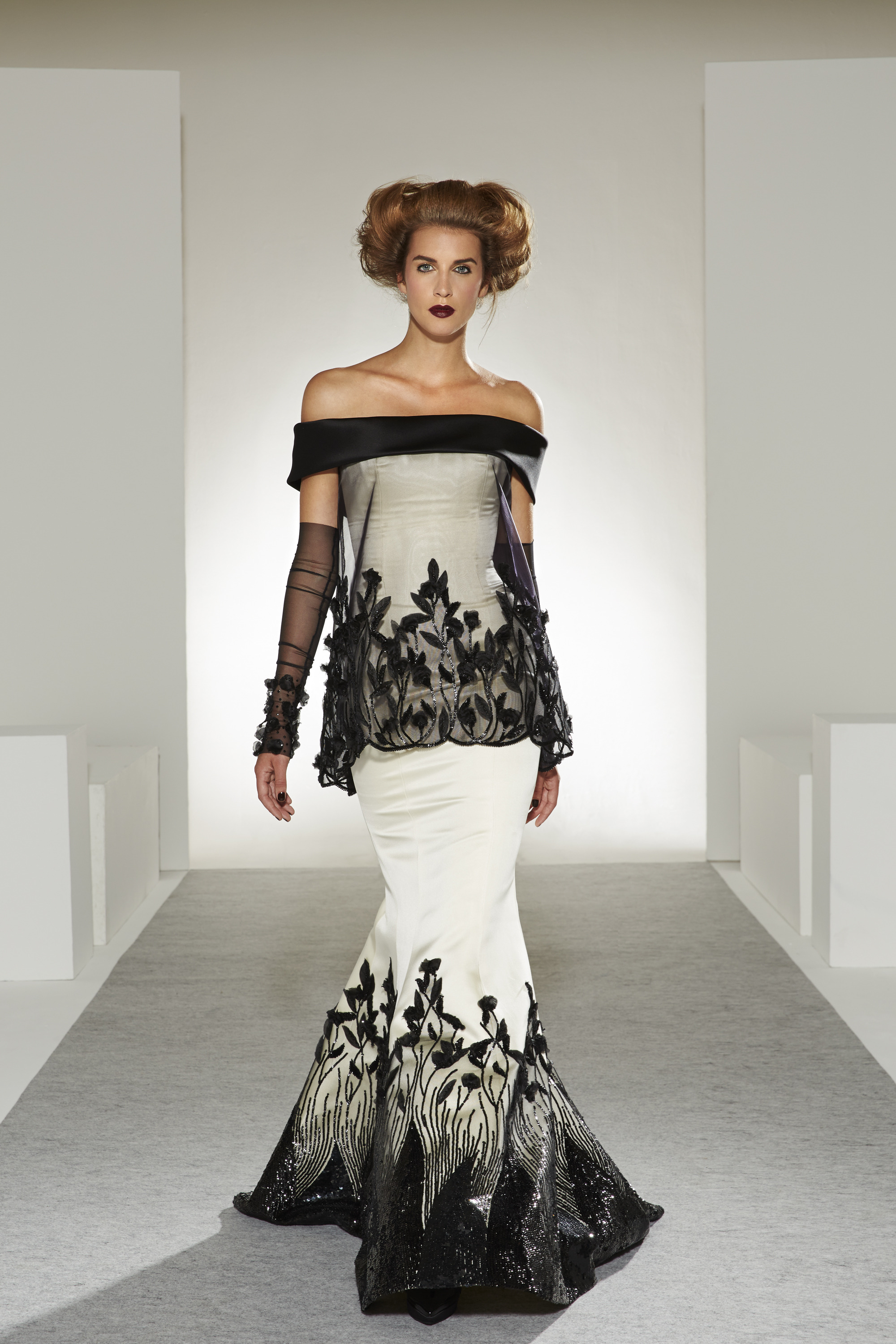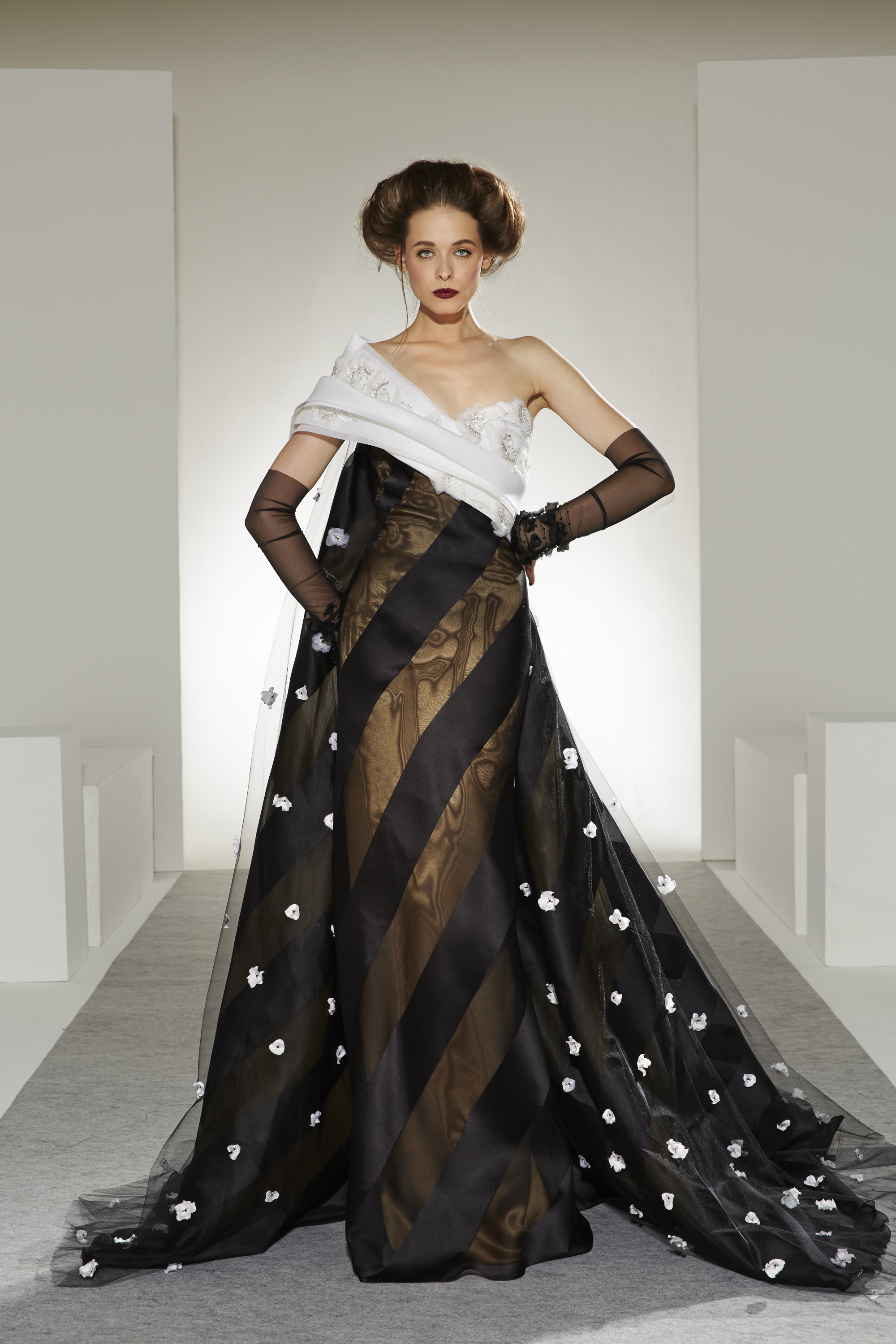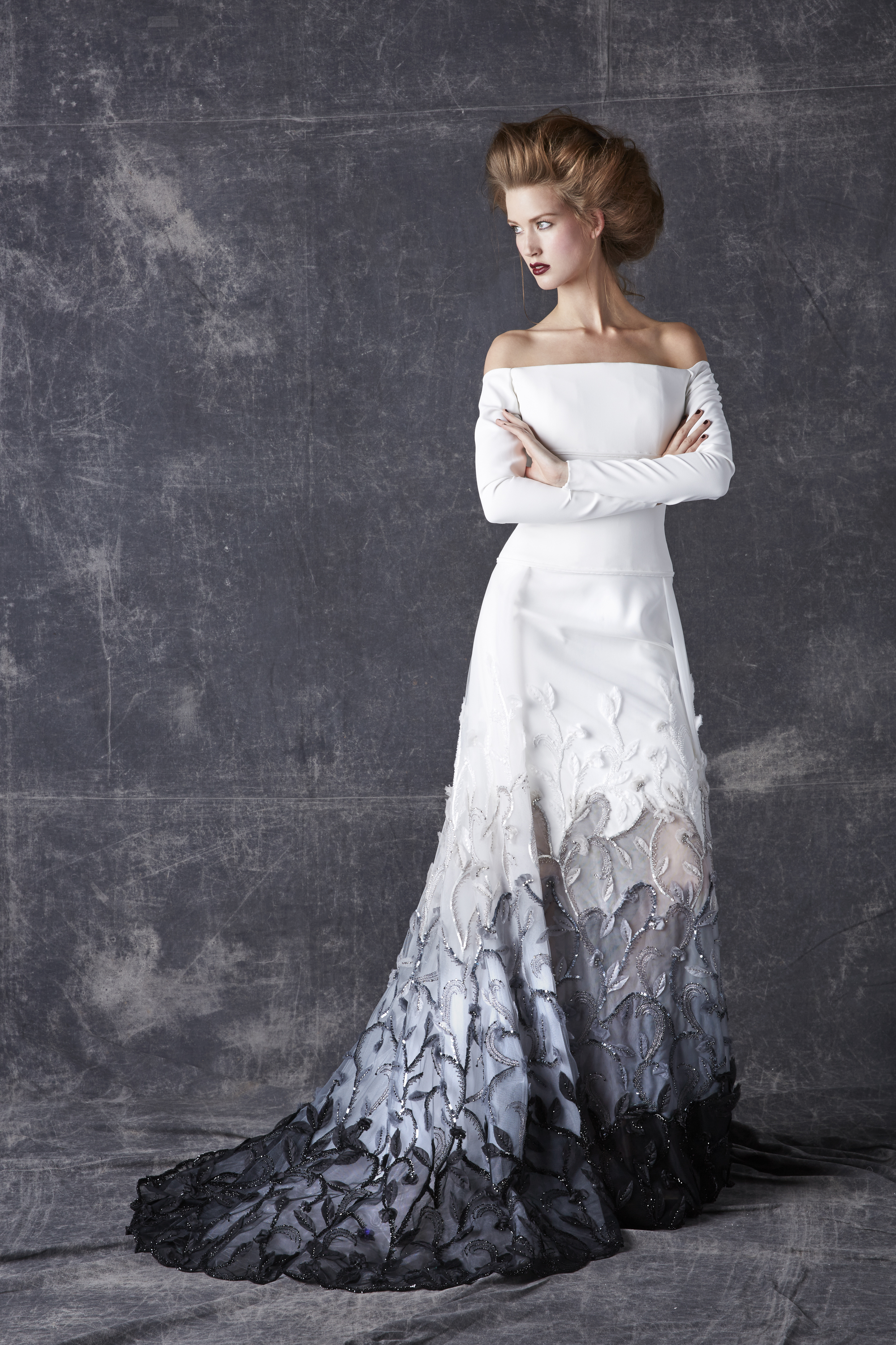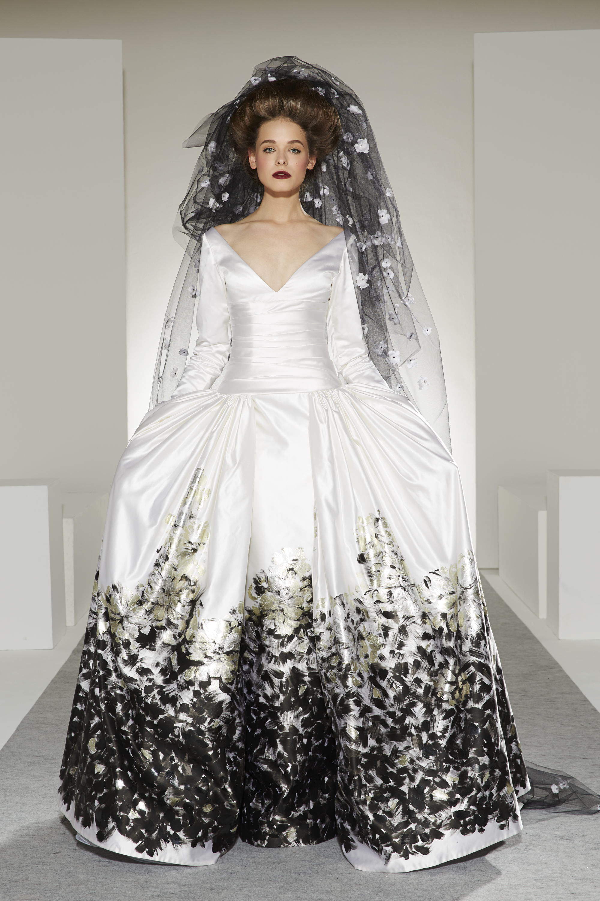 Bonheur: An artistic marriage of dreamy white and raw, inspired black, the wedding dress completes the contemporary picture of a collection that is happy to unite desires, pleasures and reality.