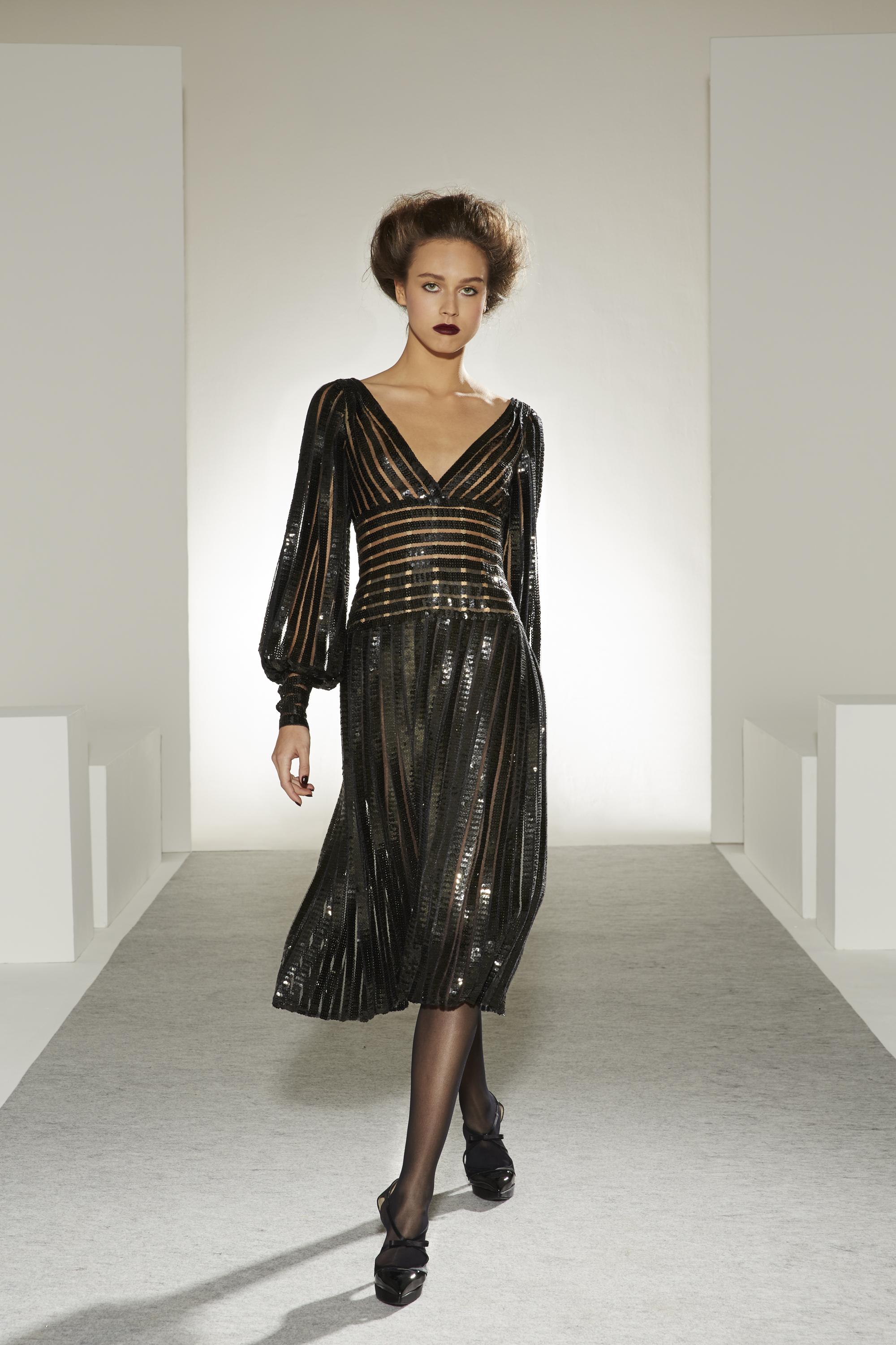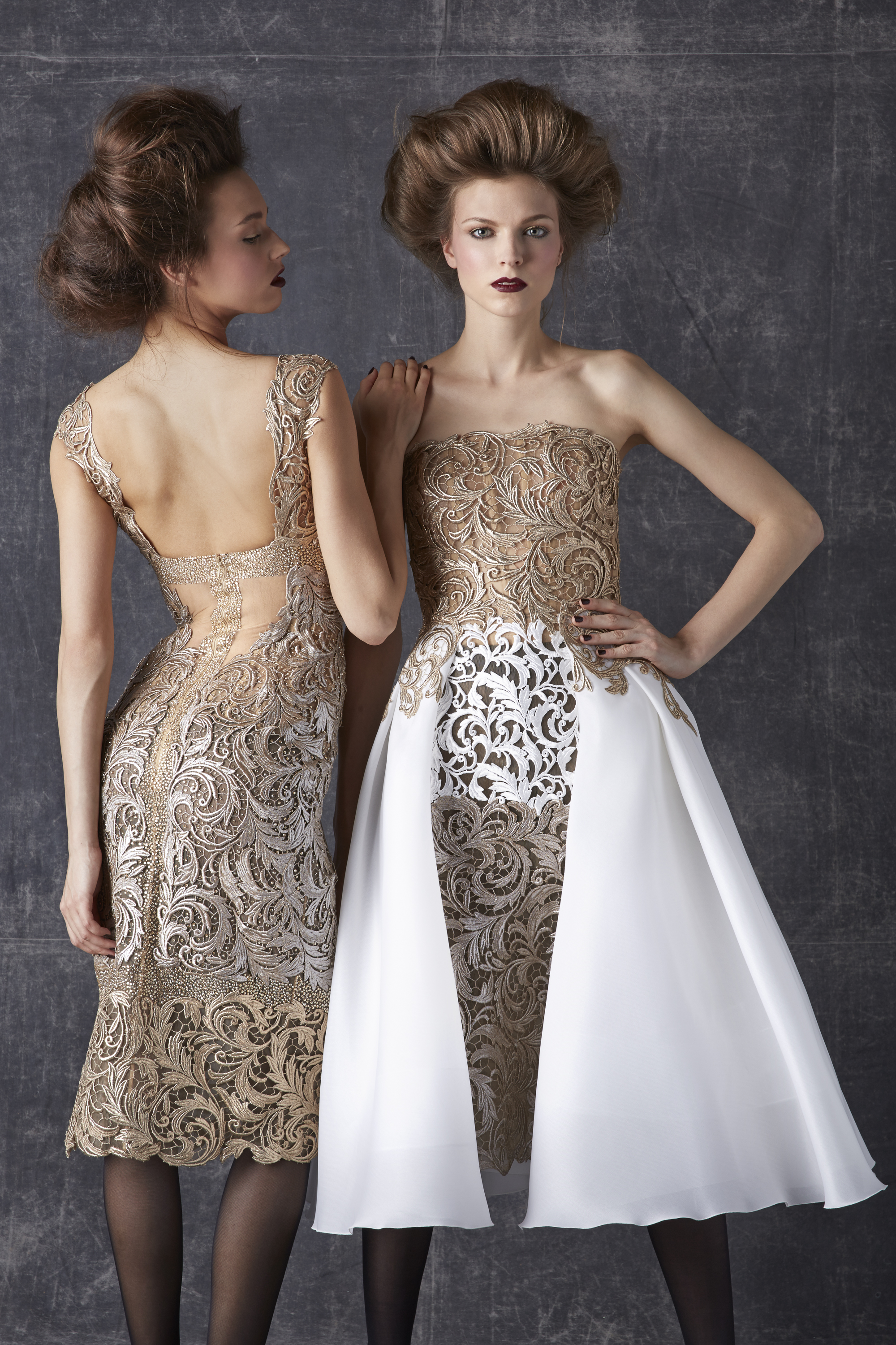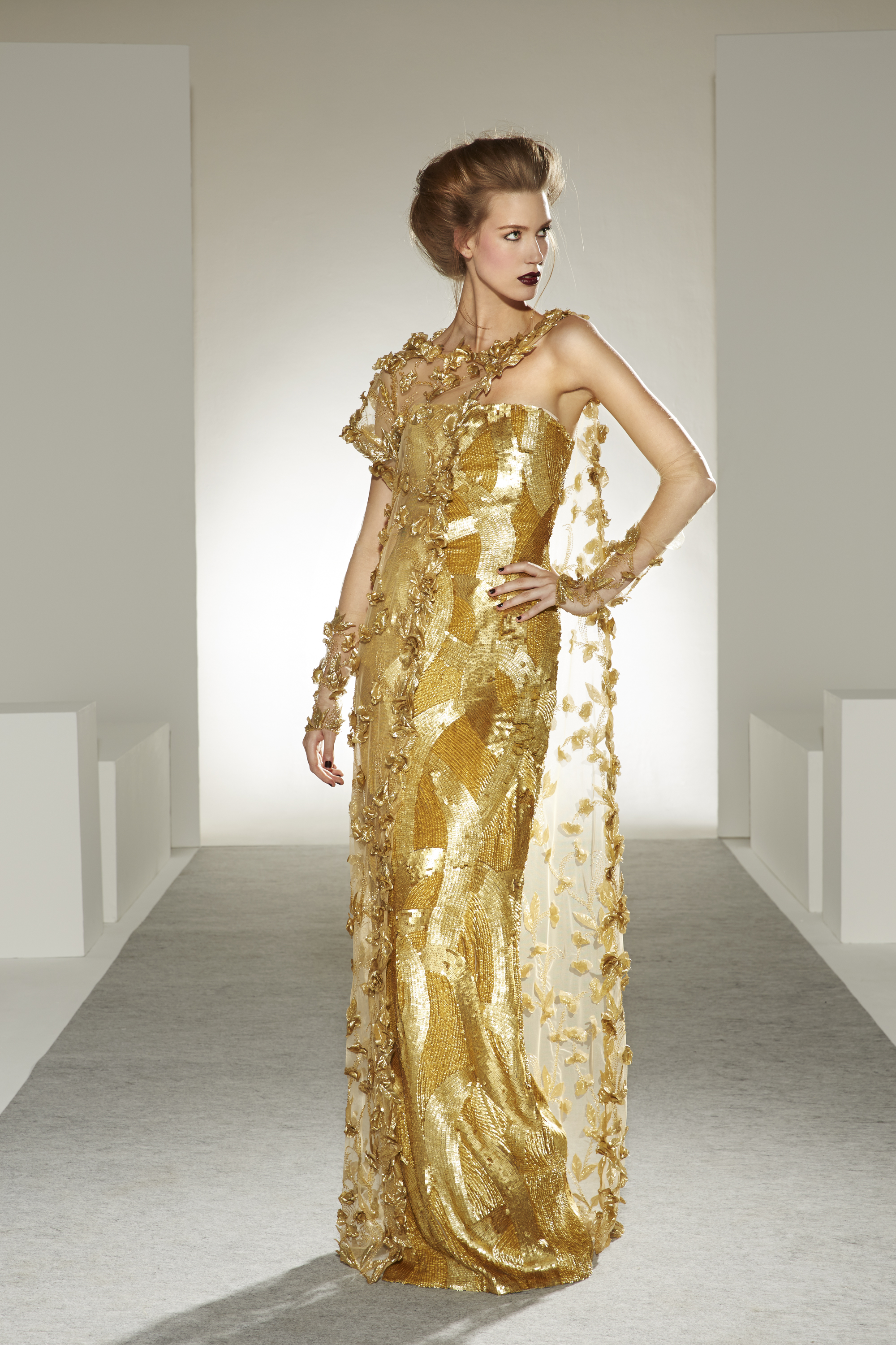 Good vibes: veils of tulle and nostalgia, mirrors of sequins and glamour, solar or lunar filters of pearls and embroidery, patinas of gold and lace, graphic feuilletés, arabesques of guipure, face à faste of flowers and Art Deco motifs, organza attracts, furrows of radiant satin… The silhouette is embraced by what enchants and comforts it, an aura of ornaments imbued with familiar references.