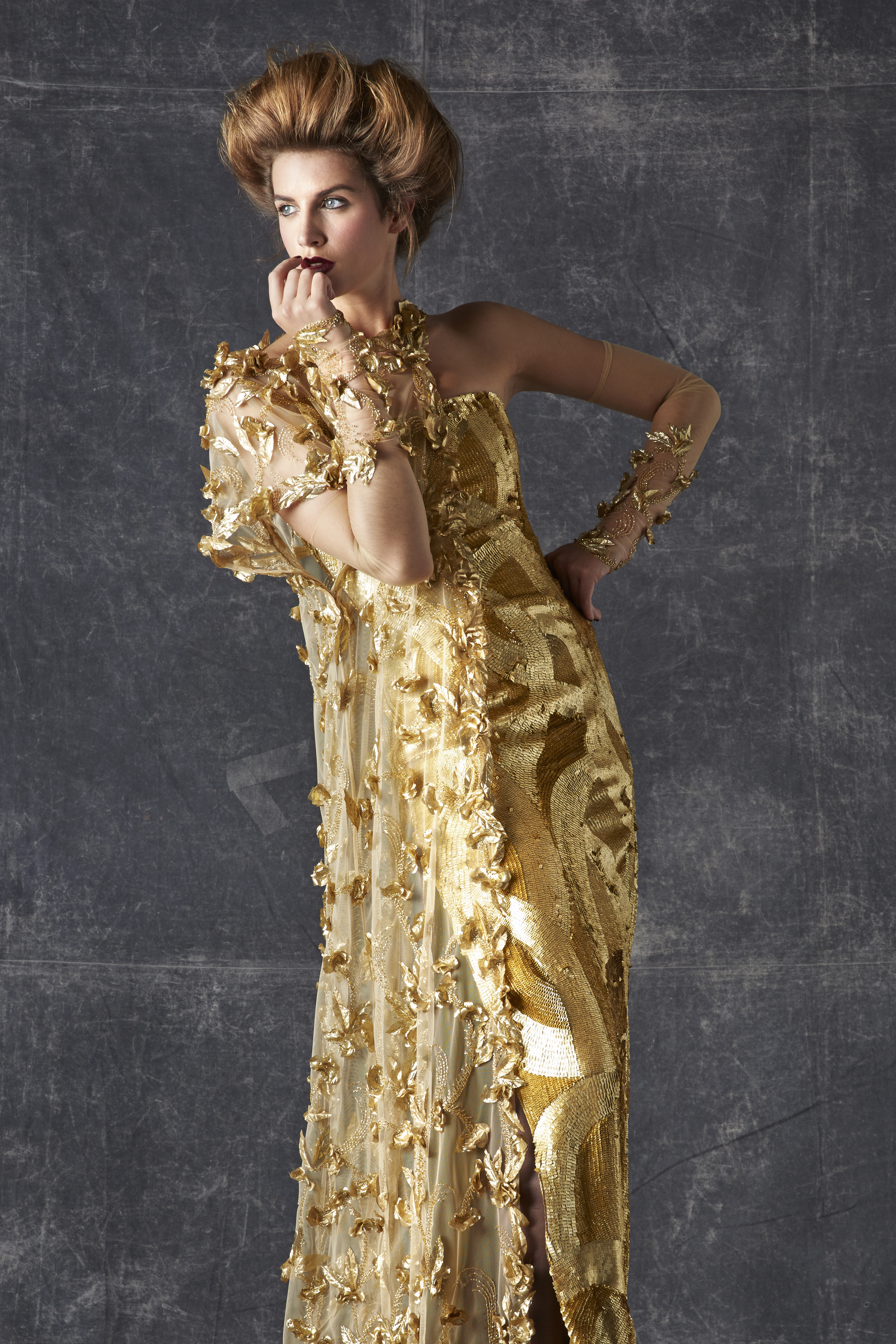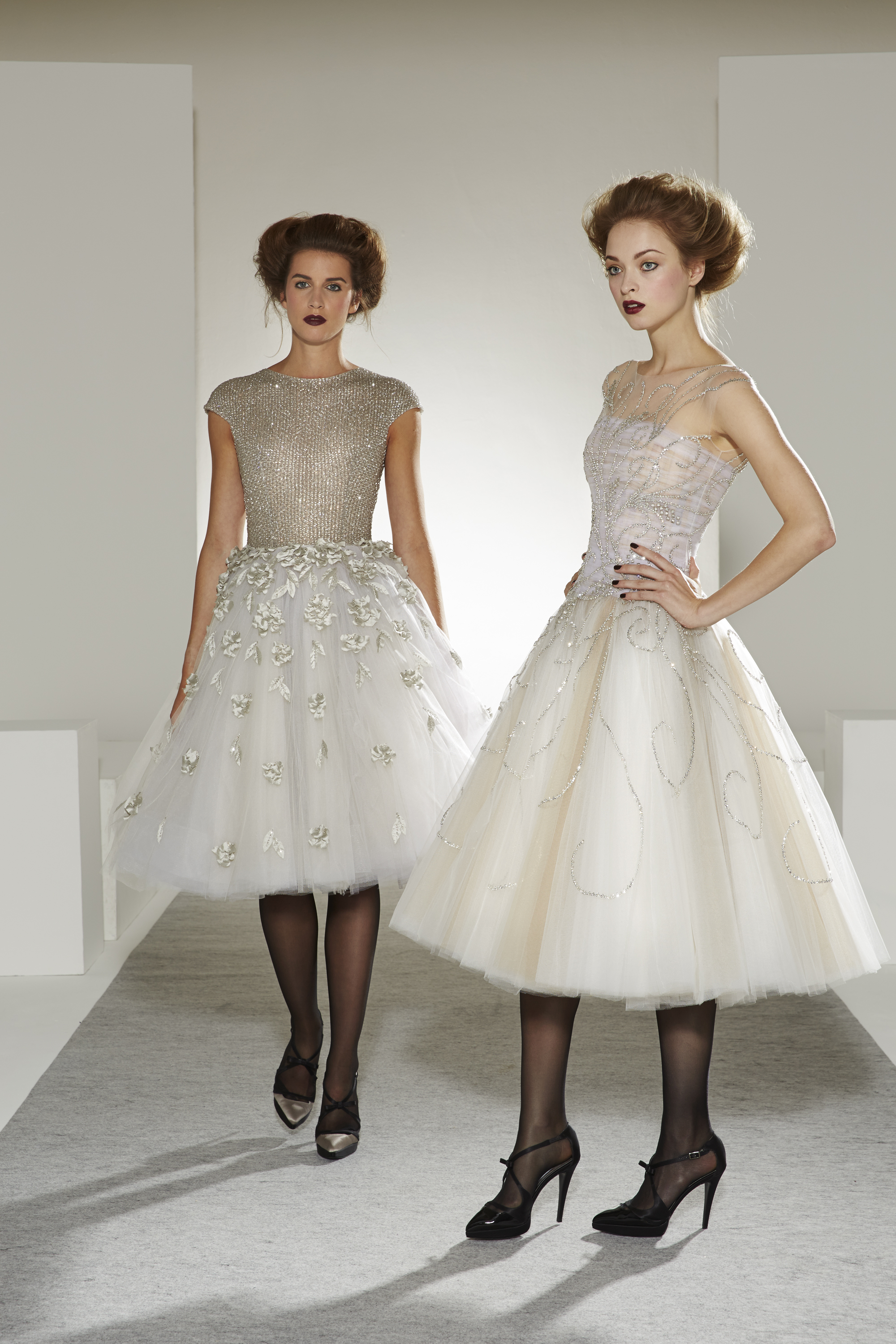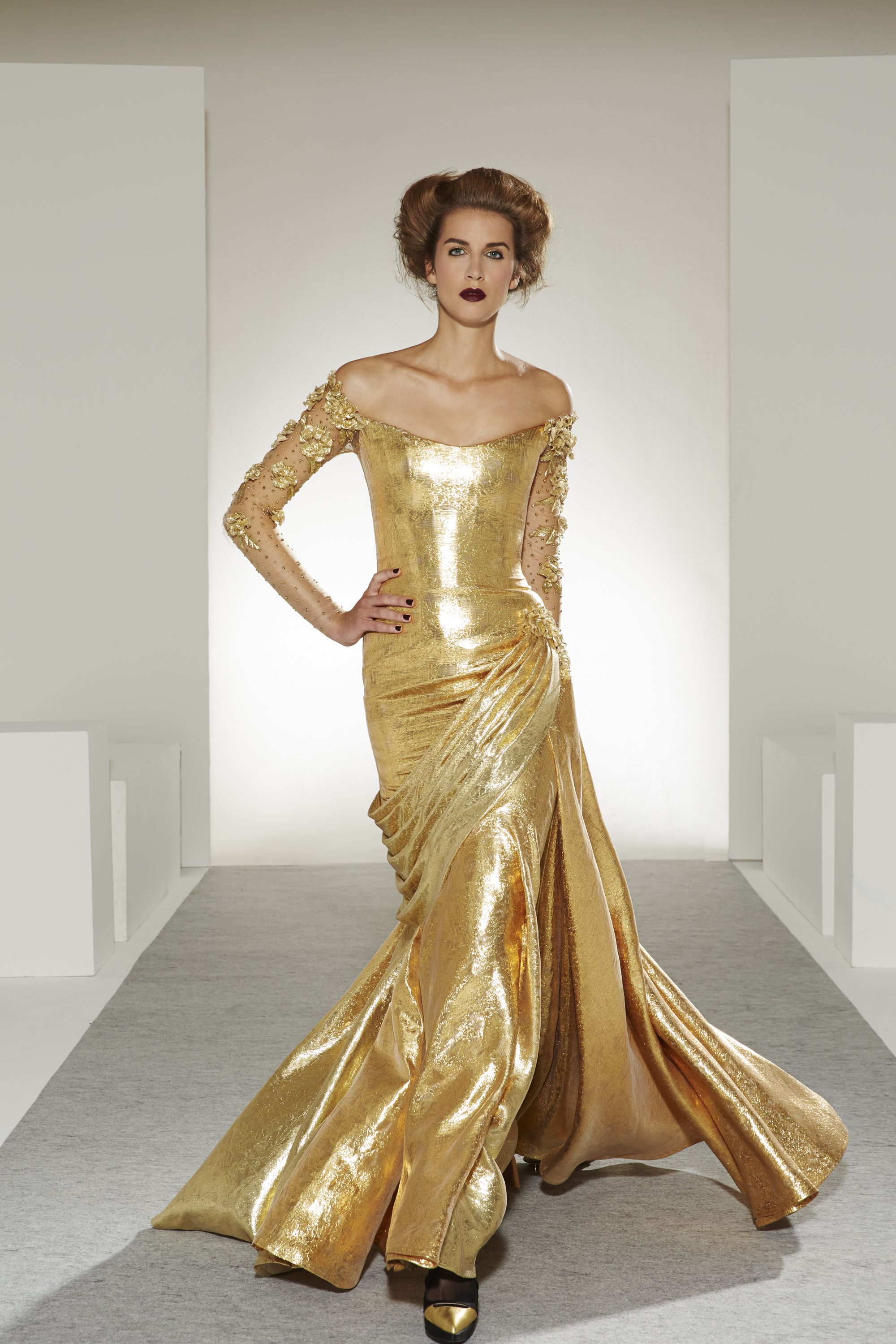 Good vibes: veils of tulle and nostalgia, mirrors of sequins and glamour, solar or lunar filters of pearls and embroidery, patinas of gold and lace, graphic feuilletés, arabesques of guipure, face à faste of flowers and Art Deco motifs, organza attracts, furrows of radiant satin… The silhouette is embraced by what enchants and comforts it, an aura of ornaments imbued with familiar references.