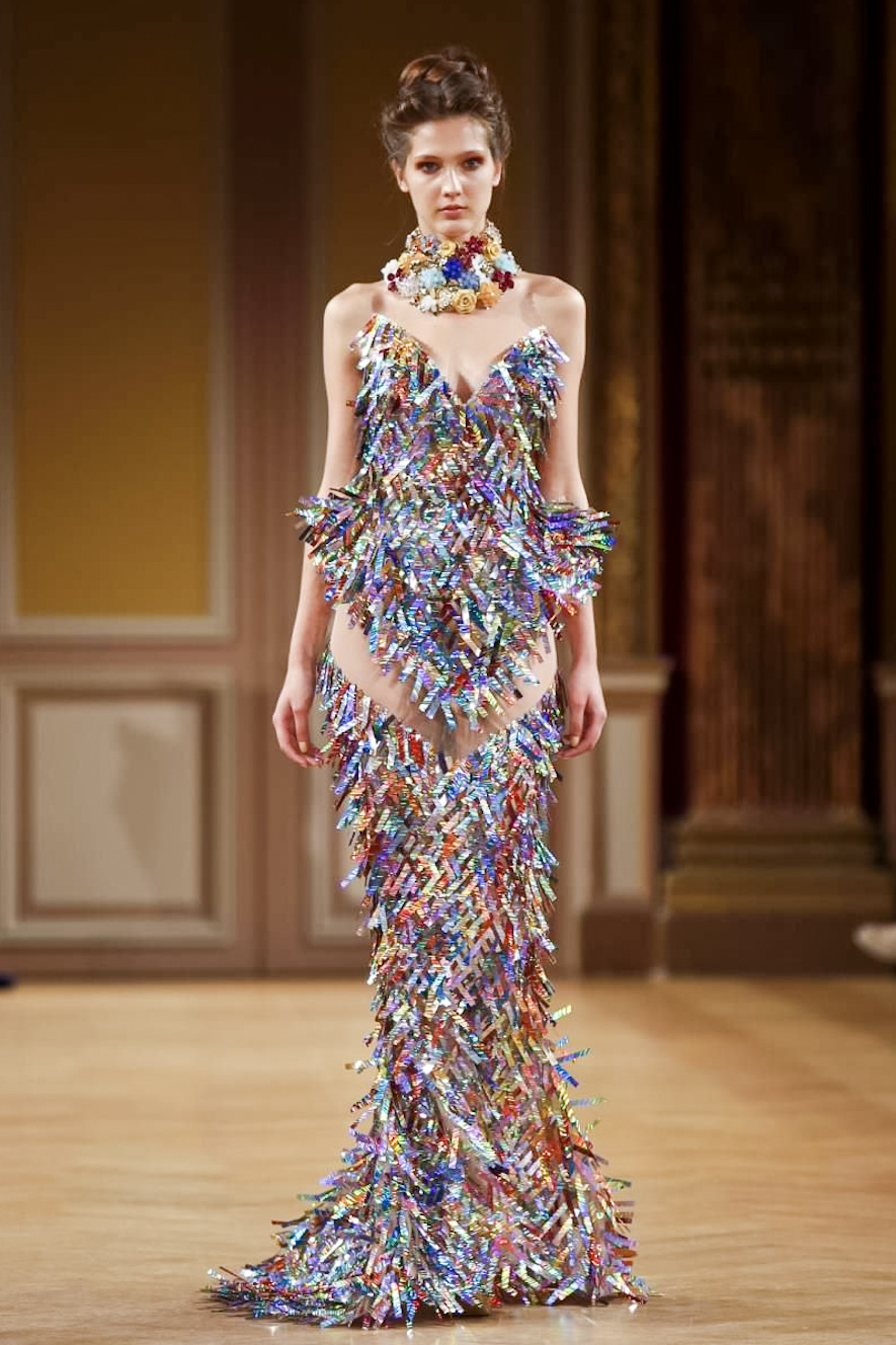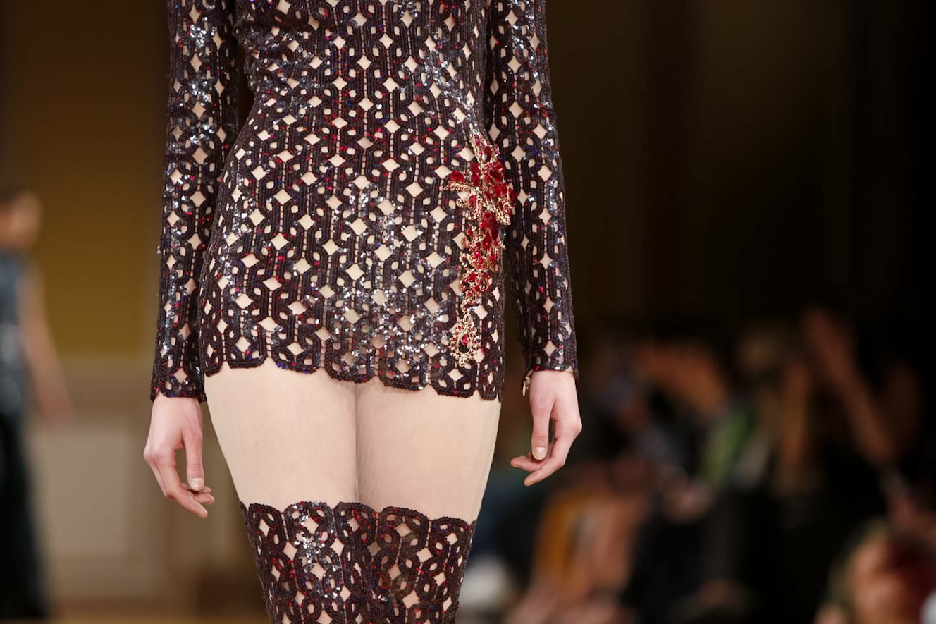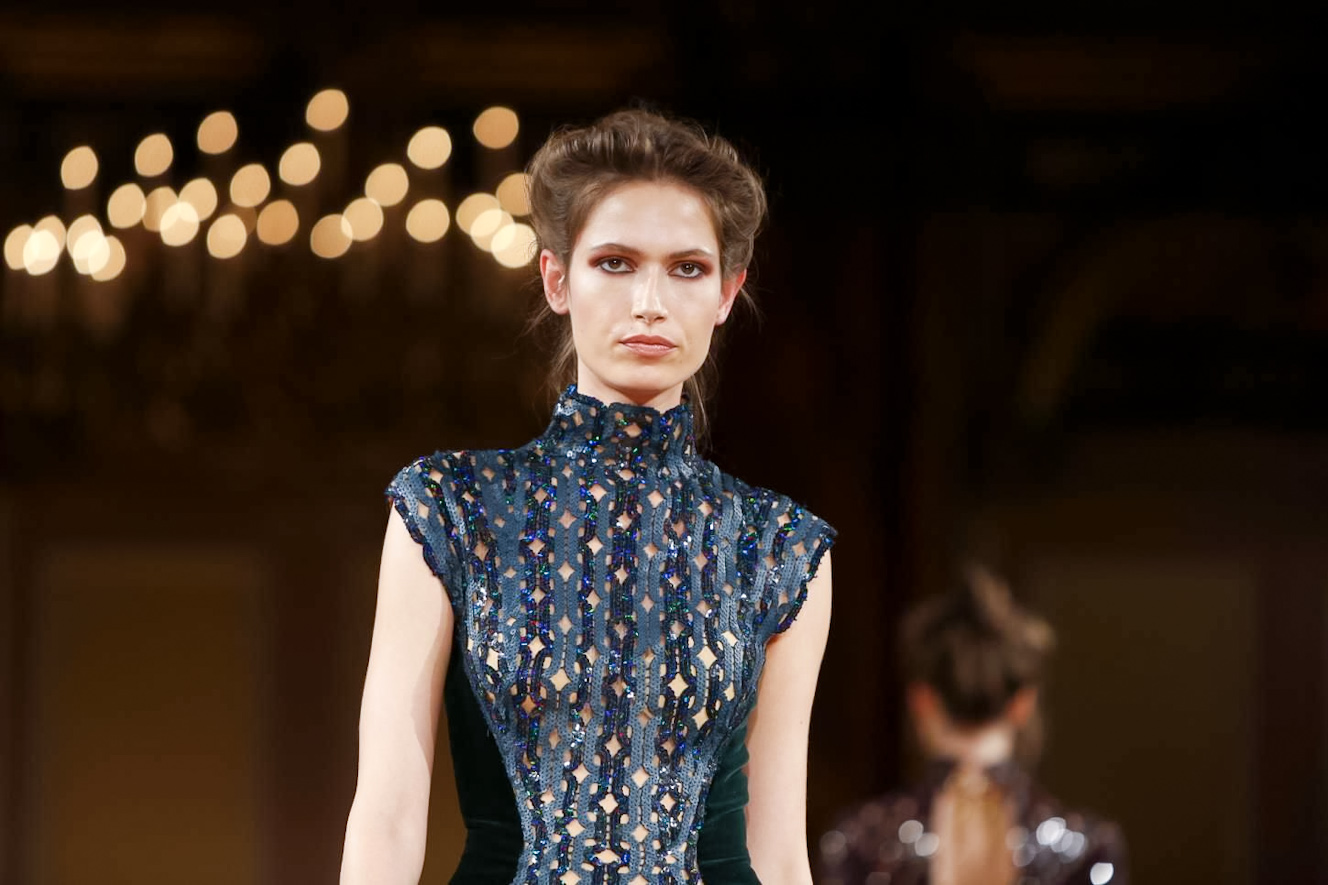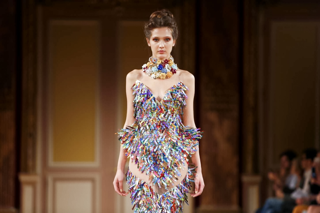 Velvets, crepes, silk lamés or sequined chains reveal the sheaths of grand soirs, inventing plays of transparency, volutes and asymmetries. Silk jacquard bubbles up and shapes a skirt or train. Scalpel-cut sheets of rhodoid shimmer in the light.