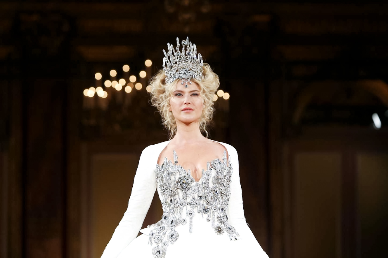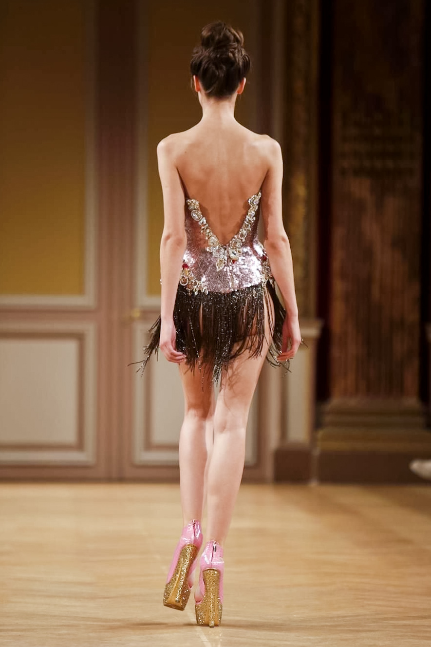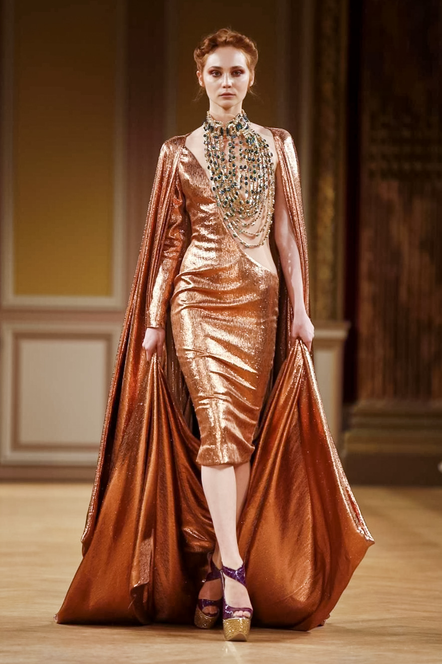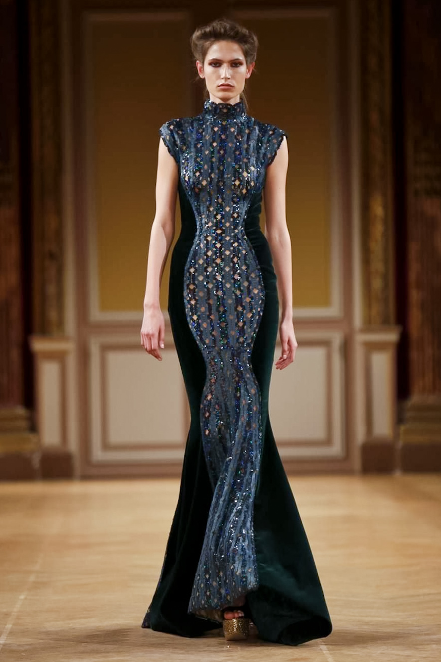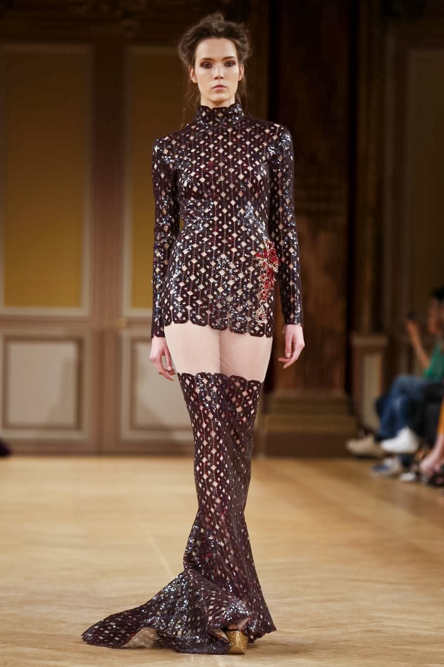Velvets, crepes, silk lamés or sequined chains reveal the sheaths of grand soirs, inventing plays of transparency, volutes and asymmetries. Silk jacquard bubbles up and shapes a skirt or train. Scalpel-cut sheets of rhodoid shimmer in the light.