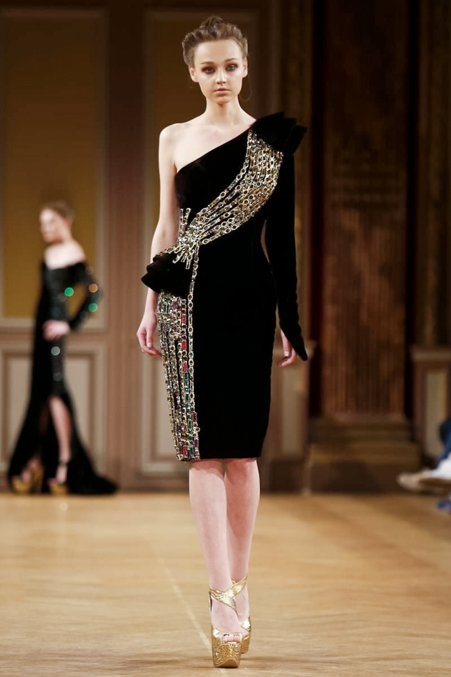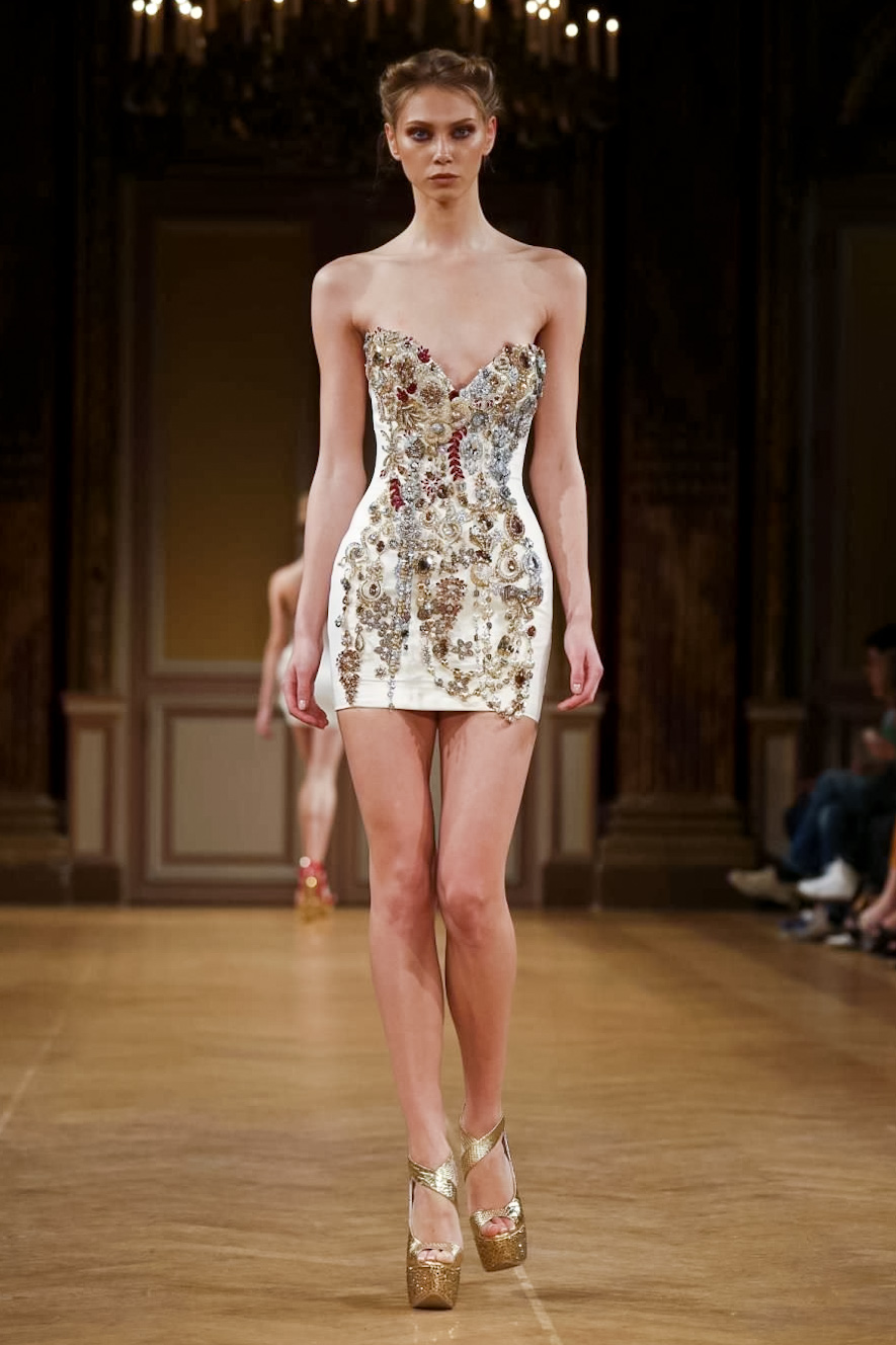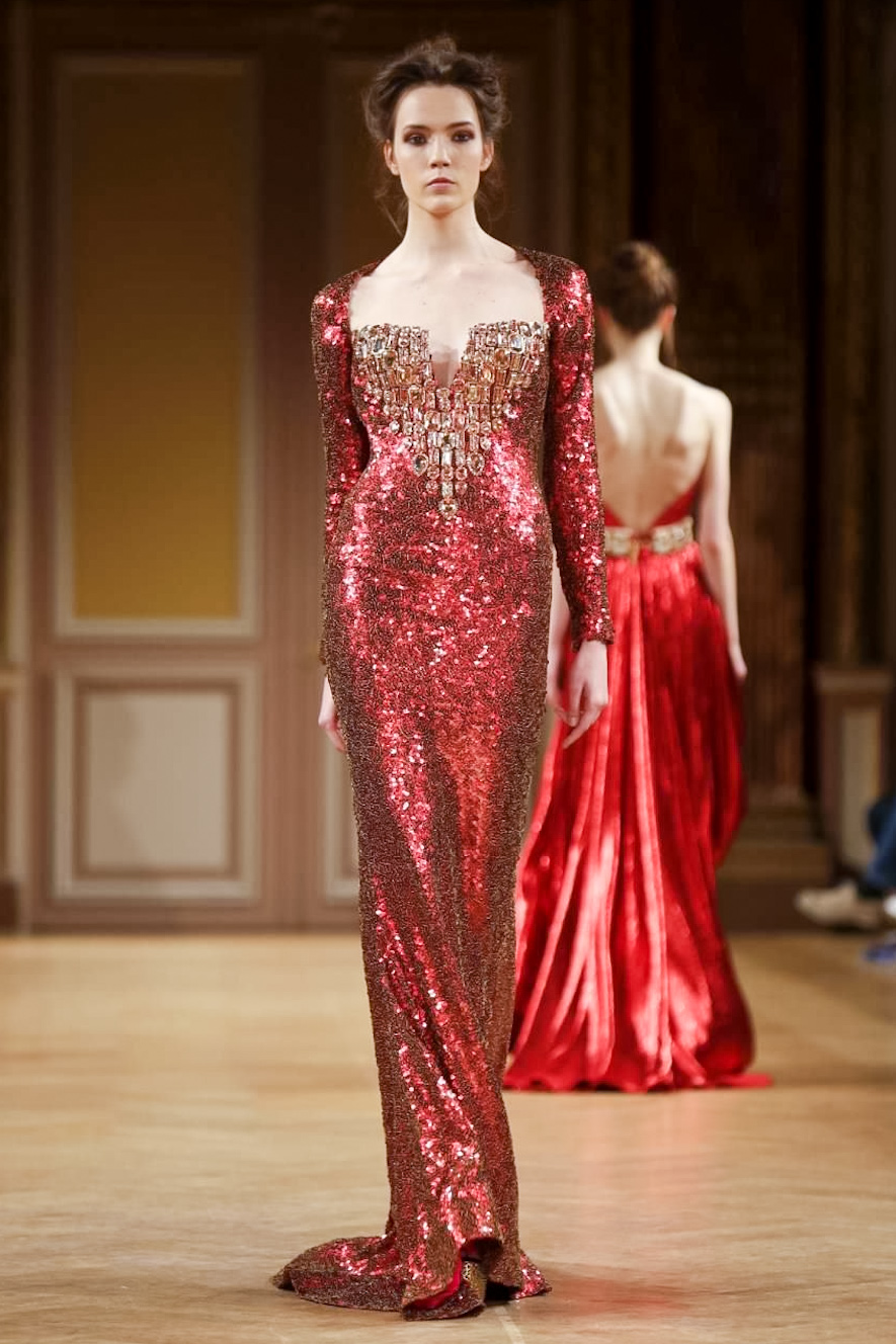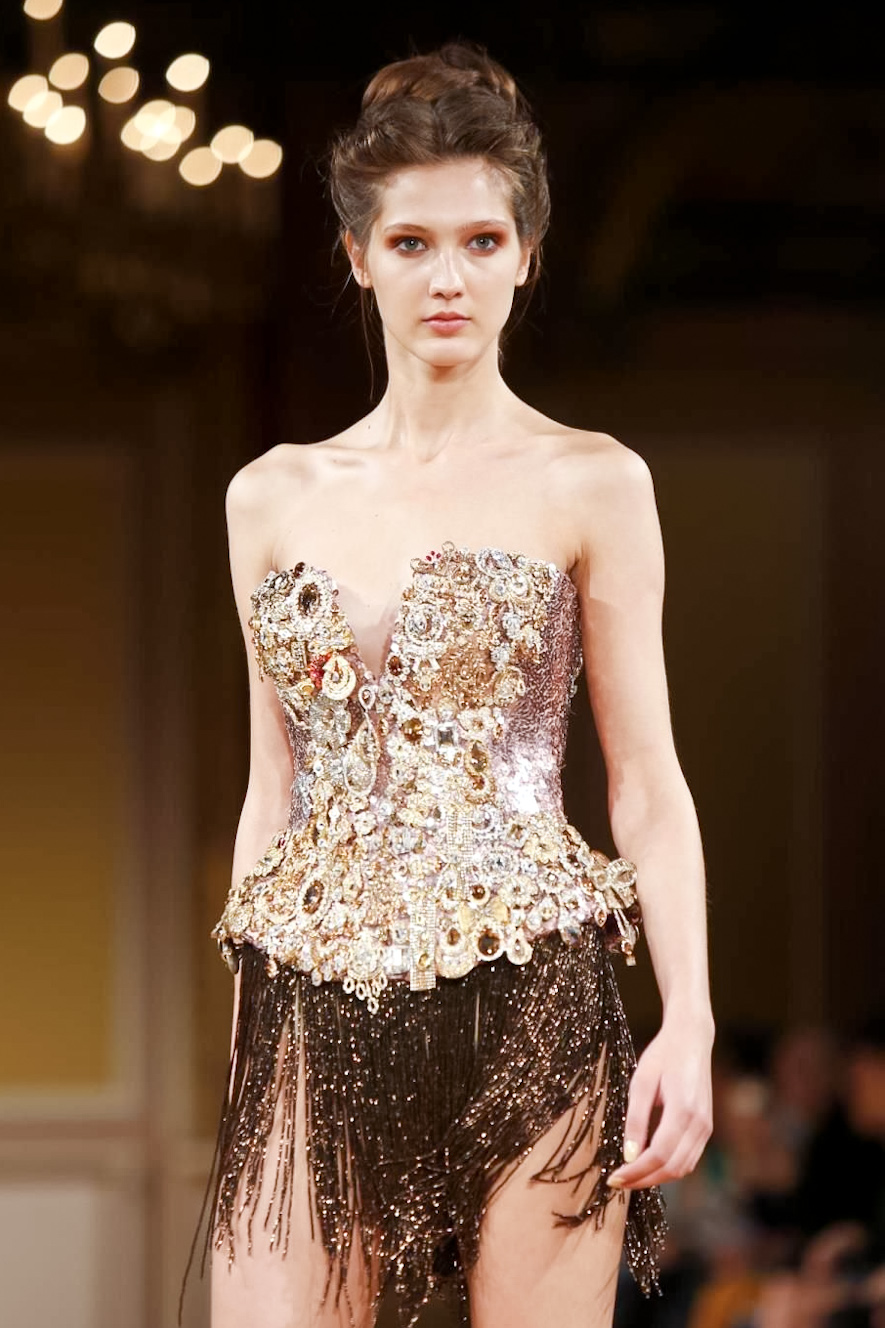 Velvets, crepes, silk lamés or sequined chains reveal the sheaths of grand soirs, inventing plays of transparency, volutes and asymmetries. Silk jacquard bubbles up and shapes a skirt or train. Scalpel-cut sheets of rhodoid shimmer in the light.