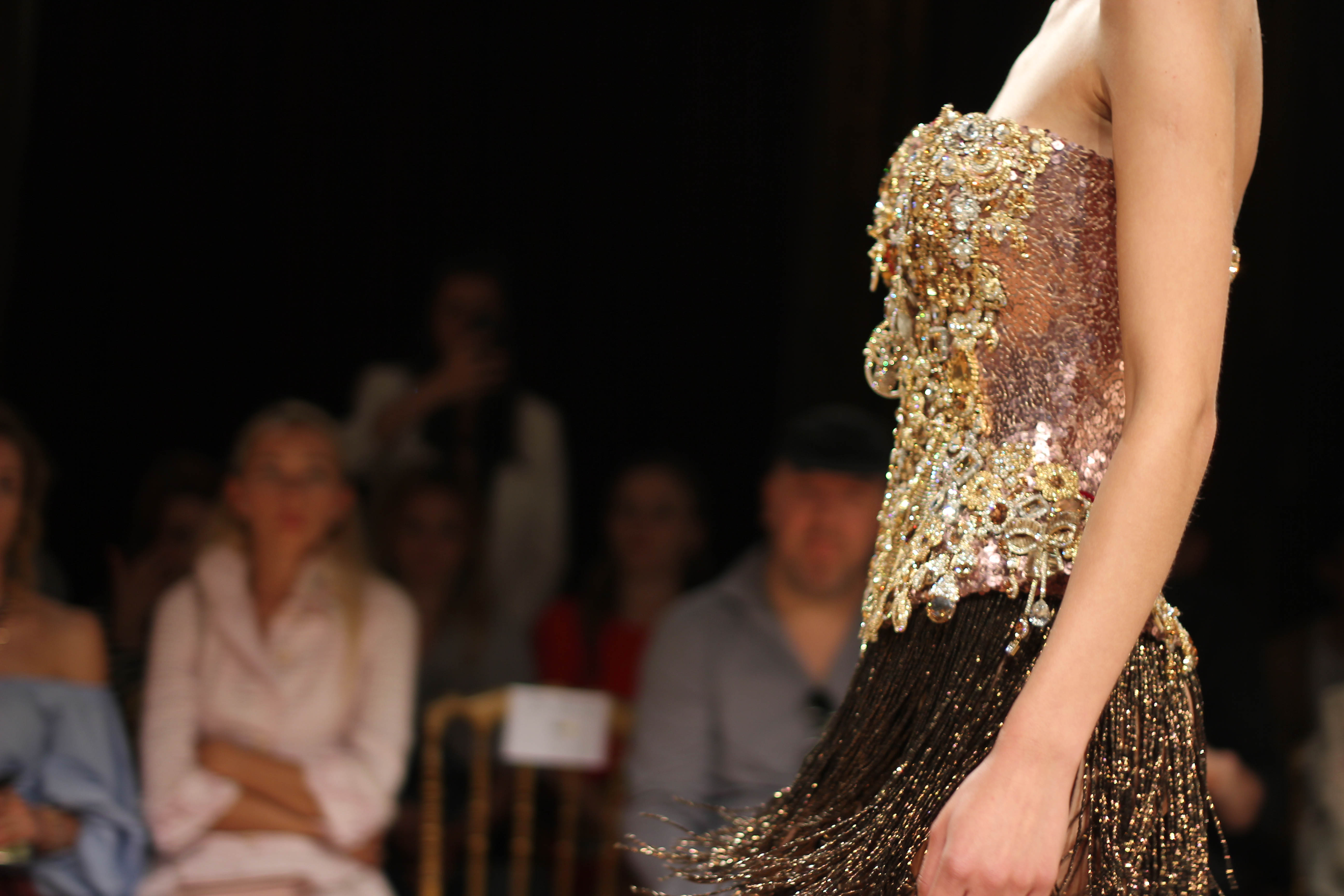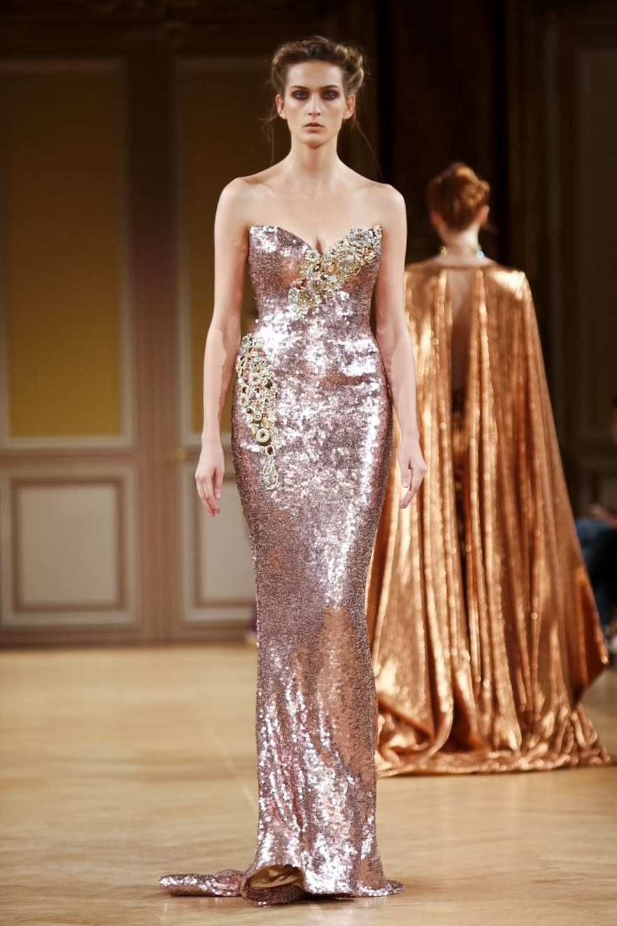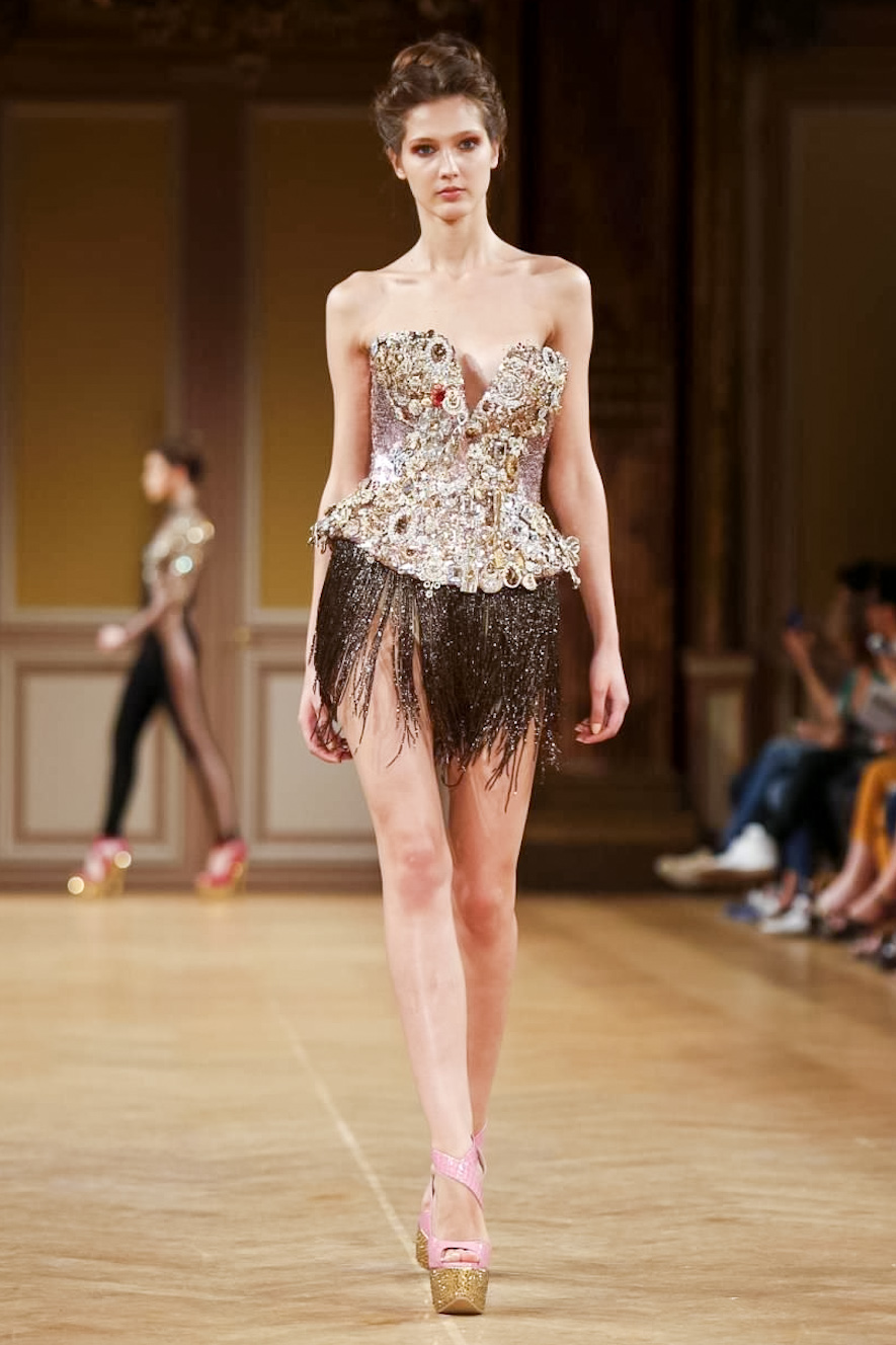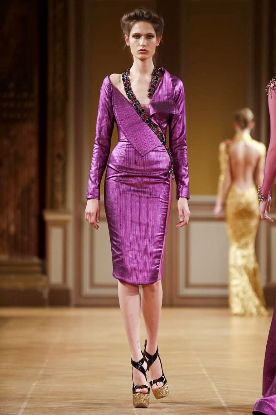 Velvets, crepes, silk lamés or sequined chains reveal the sheaths of grand soirs, inventing plays of transparency, volutes and asymmetries. Silk jacquard bubbles up and shapes a skirt or train. Scalpel-cut sheets of rhodoid shimmer in the light.
