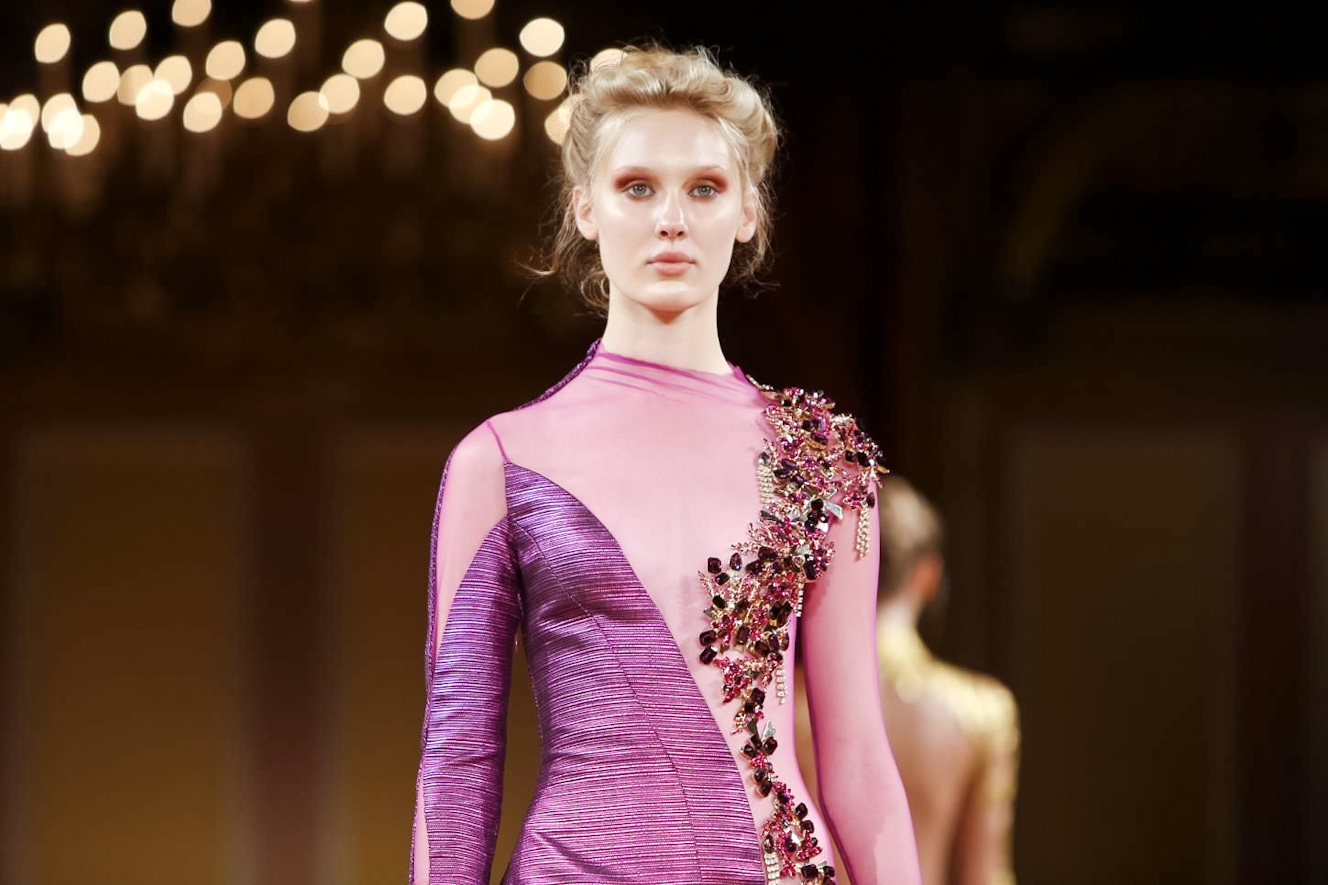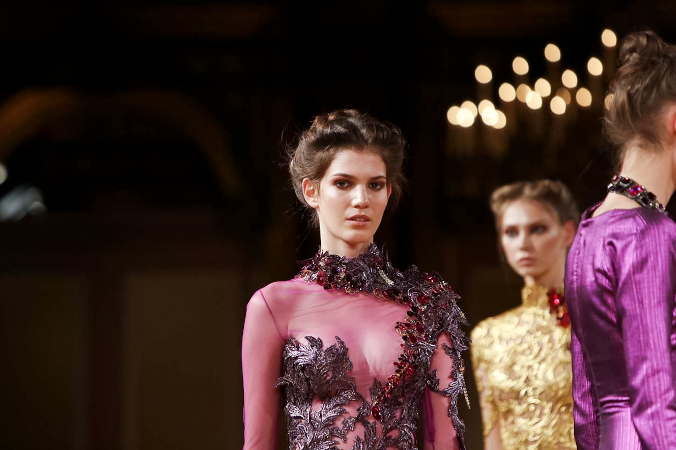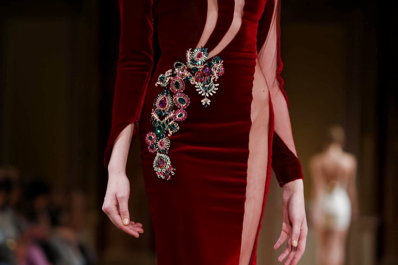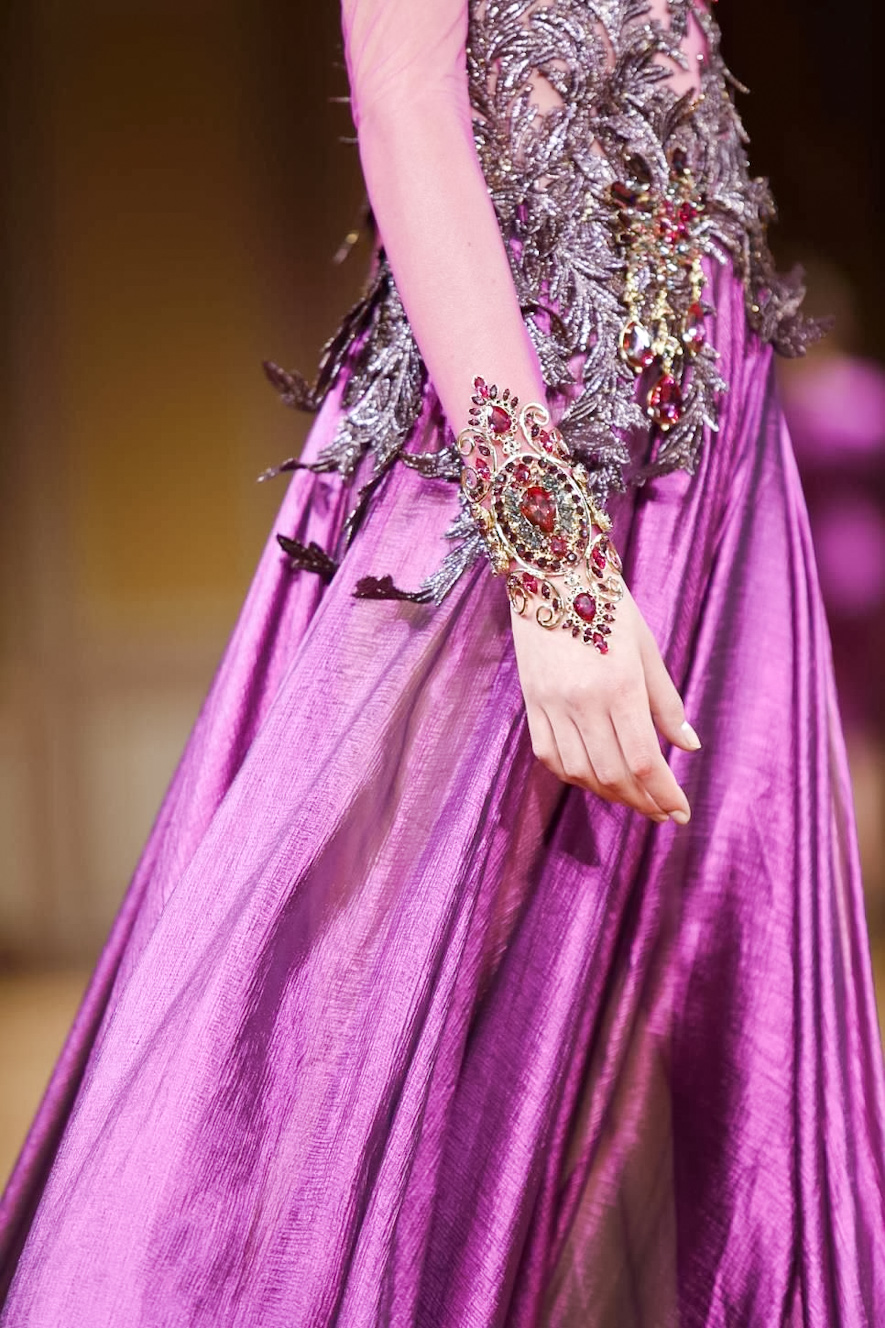 Here, jewelry takes on its full meaning in controlled opulence. Baroque pearl necklaces, crystal diamond bracelets and cabochon clips become embroidery. Like a treasure trove, in bold, precious “accumulations”, they ignite a bustier or cascade down the veil of a hip or shoulder. Colors are about emotion. They are the music of the eyes. Emerald, sapphire, ruby, garnet and amethyst play with brilliance and sparkle.