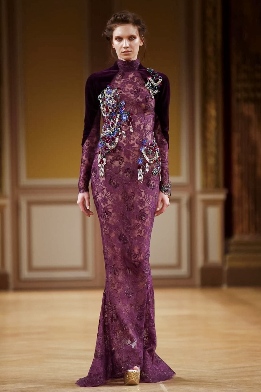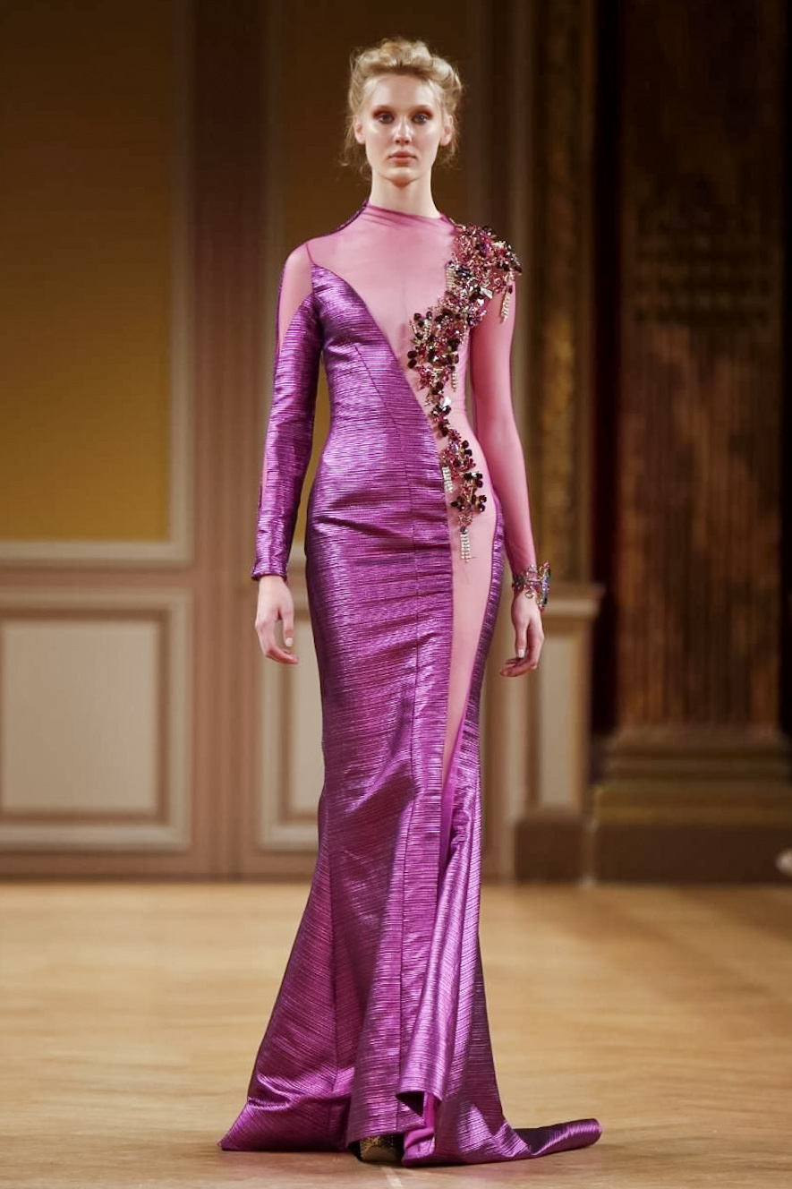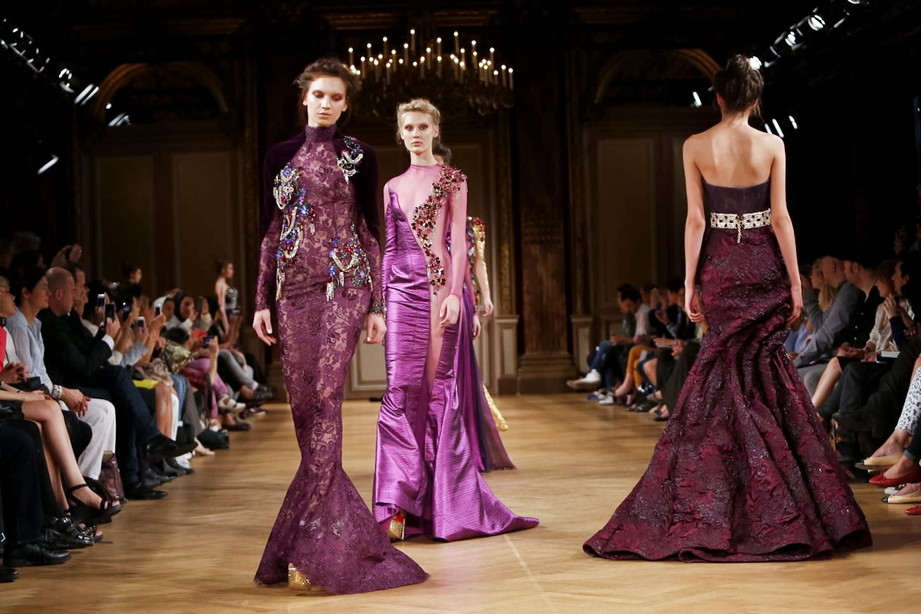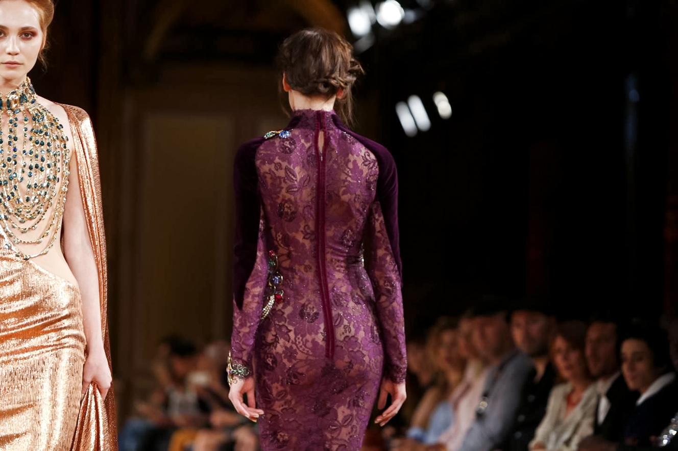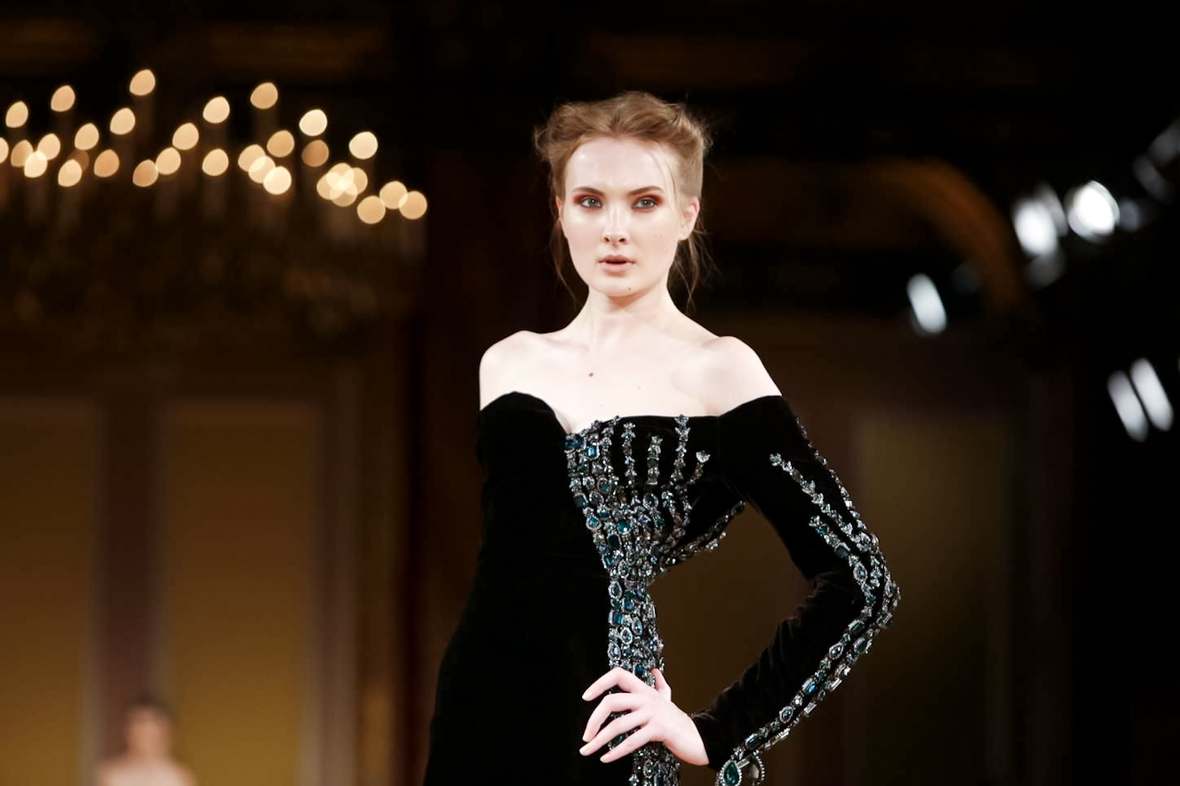 Here, jewelry takes on its full meaning in controlled opulence. Baroque pearl necklaces, crystal diamond bracelets and cabochon clips become embroidery. Like a treasure trove, in bold, precious “accumulations”, they ignite a bustier or cascade down the veil of a hip or shoulder. Colors are about emotion. They are the music of the eyes. Emerald, sapphire, ruby, garnet and amethyst play with brilliance and sparkle.