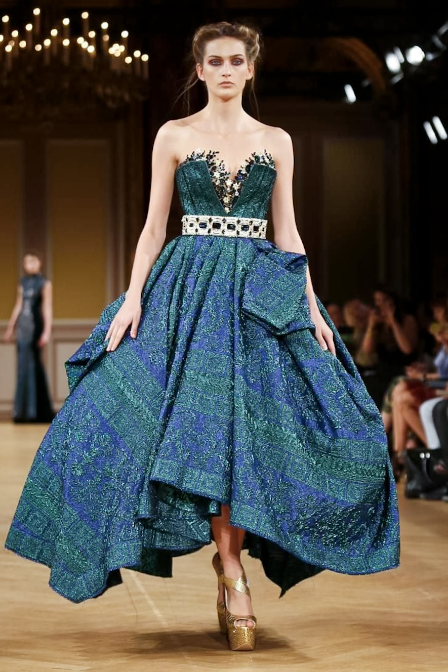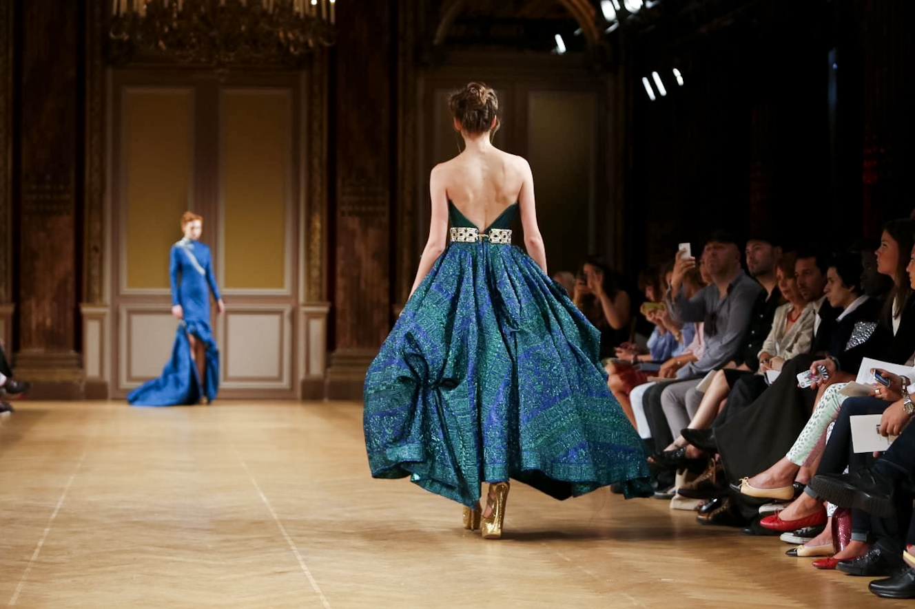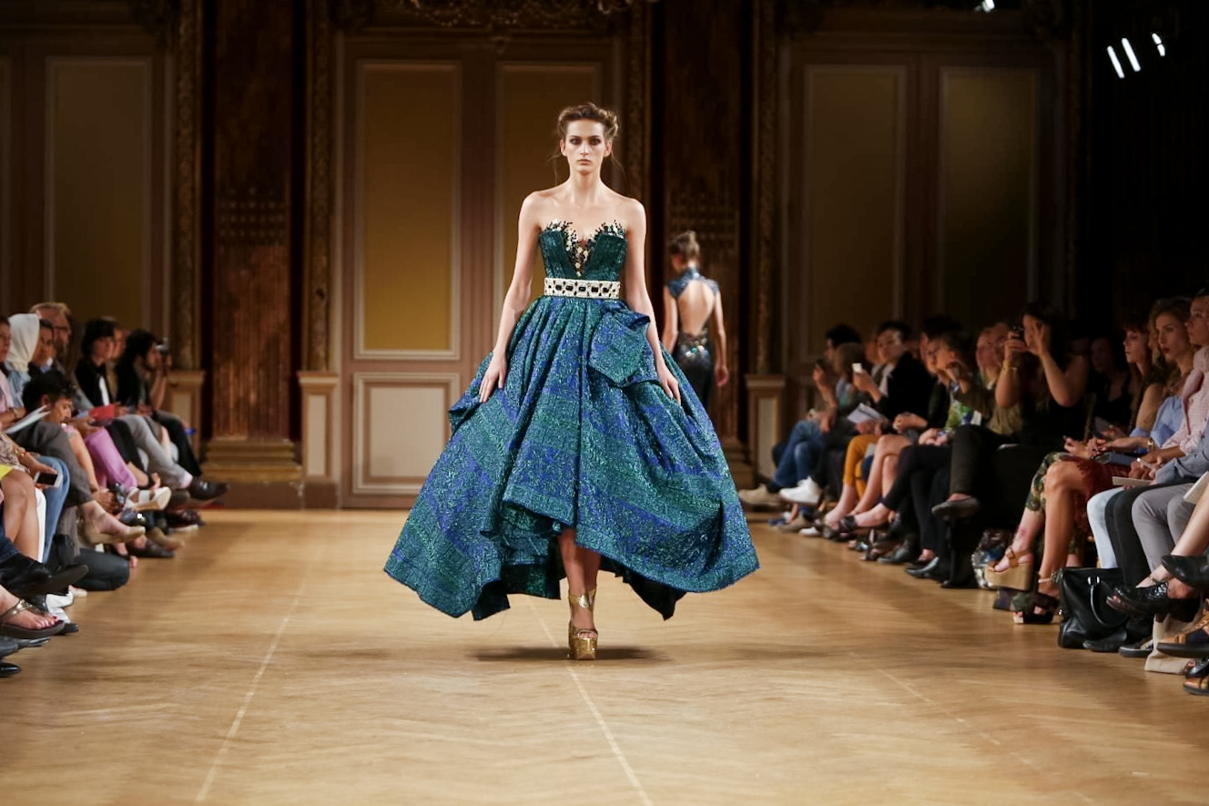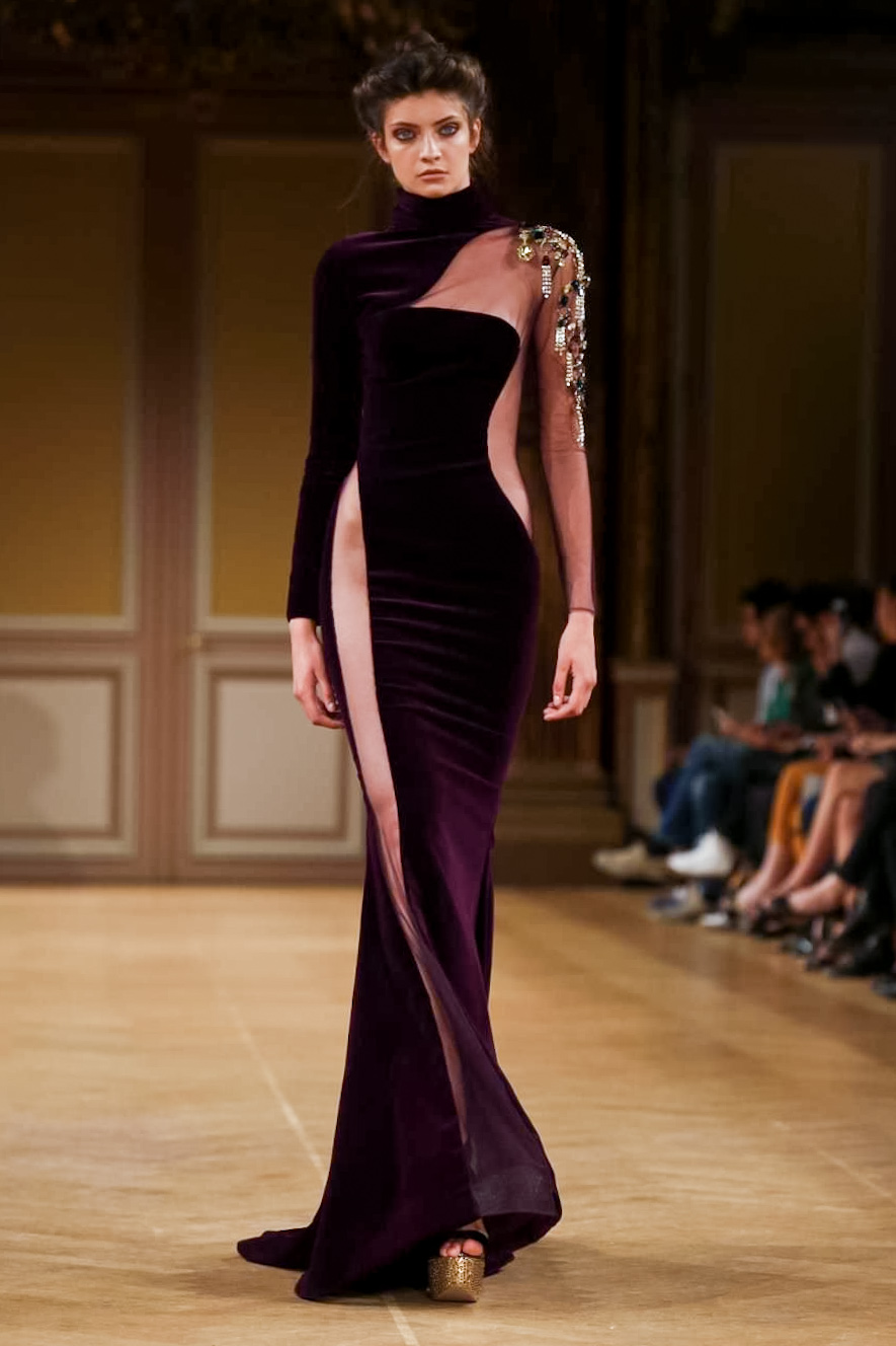 Here, jewelry takes on its full meaning in controlled opulence. Baroque pearl necklaces, crystal diamond bracelets and cabochon clips become embroidery. Like a treasure trove, in bold, precious “accumulations”, they ignite a bustier or cascade down the veil of a hip or shoulder. Colors are about emotion. They are the music of the eyes. Emerald, sapphire, ruby, garnet and amethyst play with brilliance and sparkle.