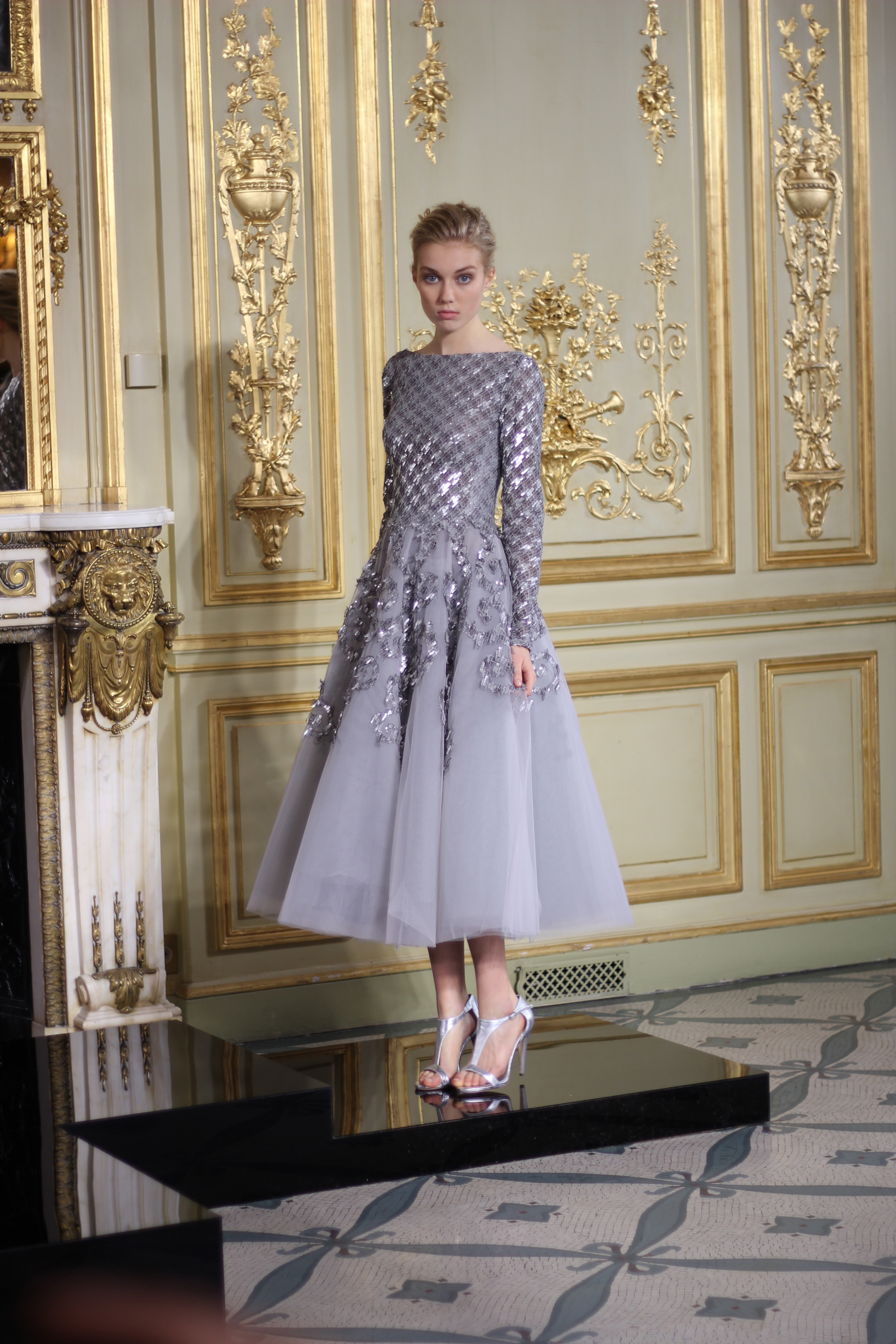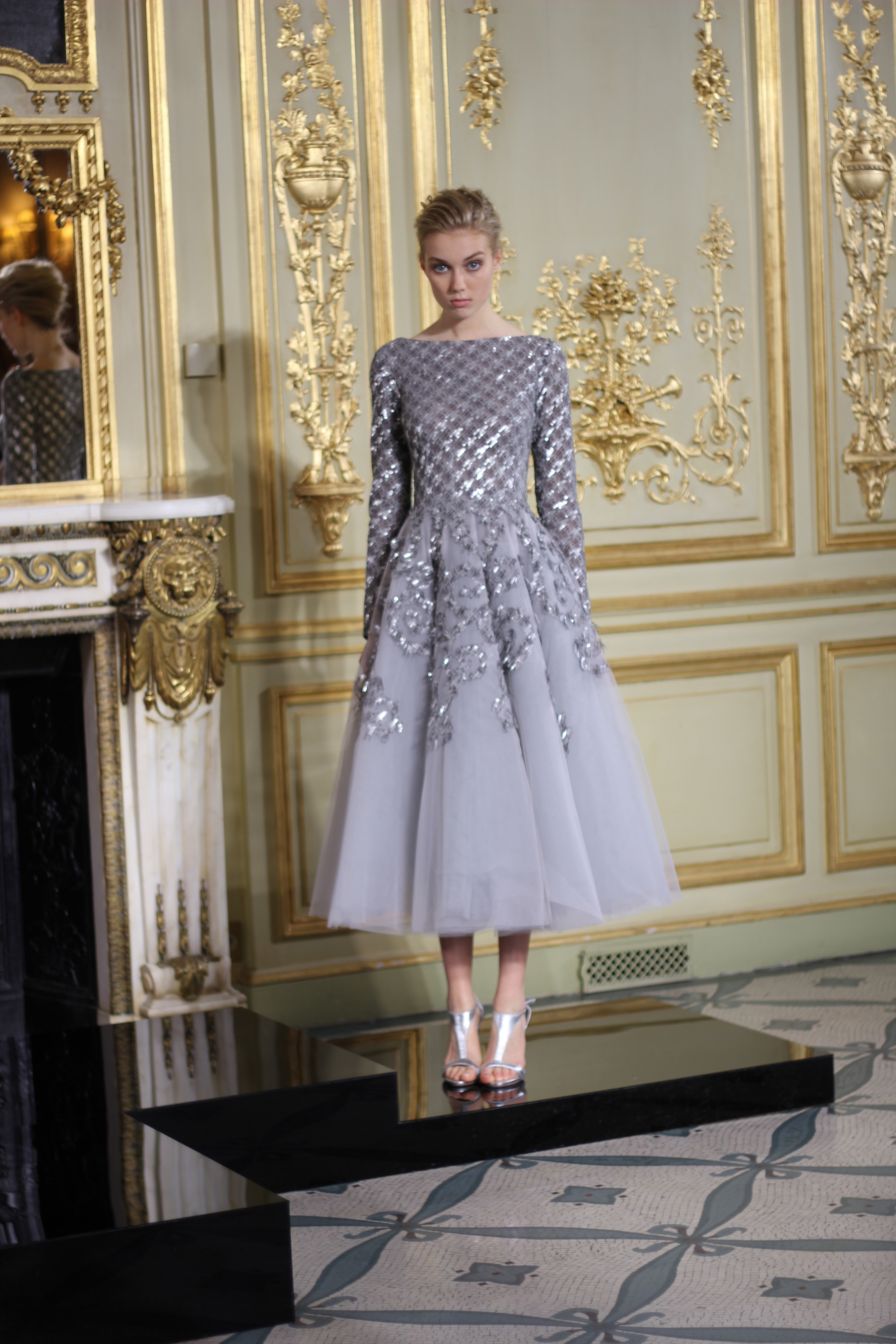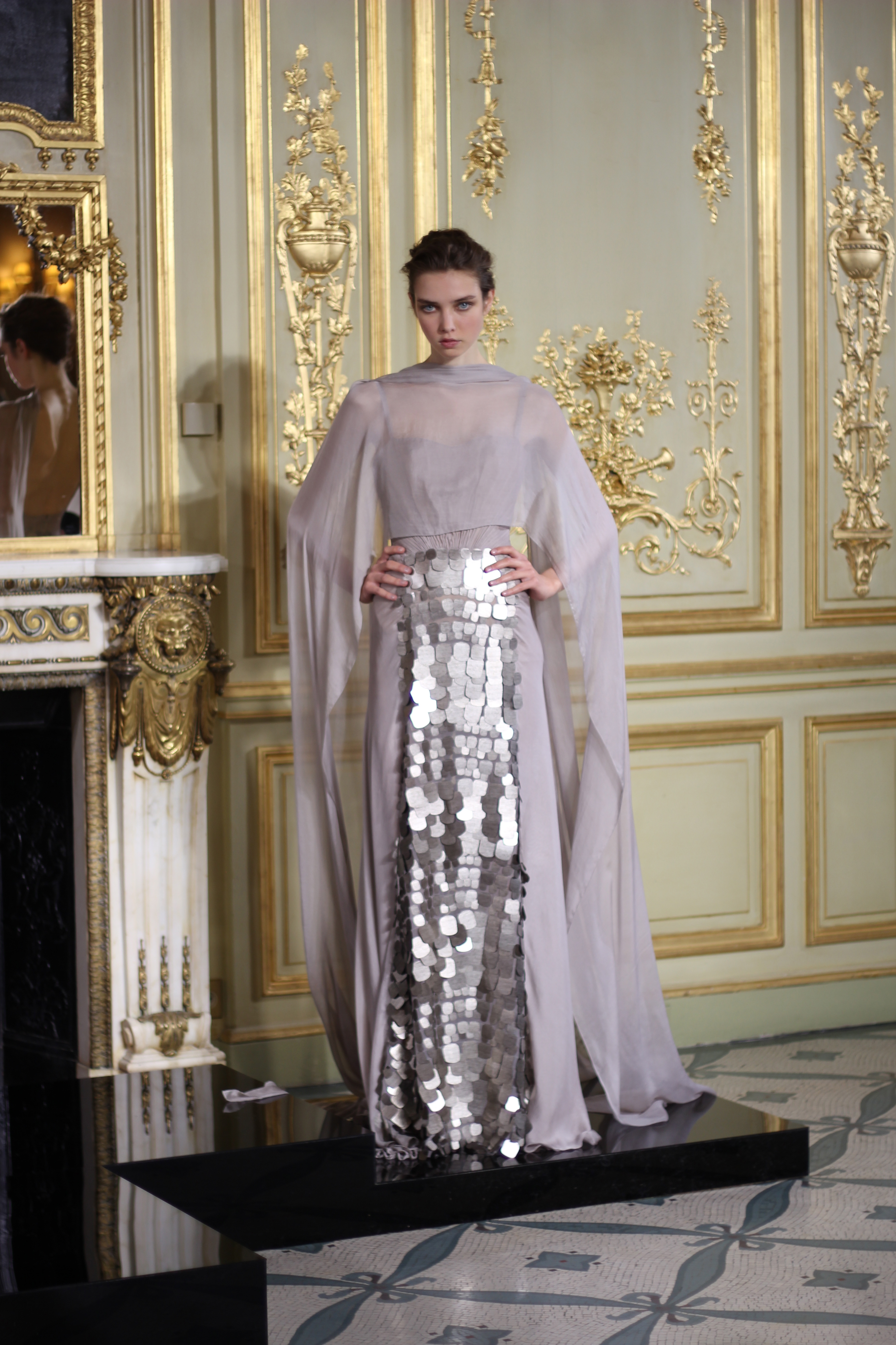 Long, flowing silhouettes are adorned with clean, elegant necklines, symbols of feminine sophistication. Three-quarter dresses with sheer fabrics and pronounced necklines boldly complement long sleeves with a touch of ’50s glamour. Al Ali plays with detail, working with embroidery and intricately patterned ornaments, reminiscent of Klimt’s emblematic, graphic, geometric shapes.