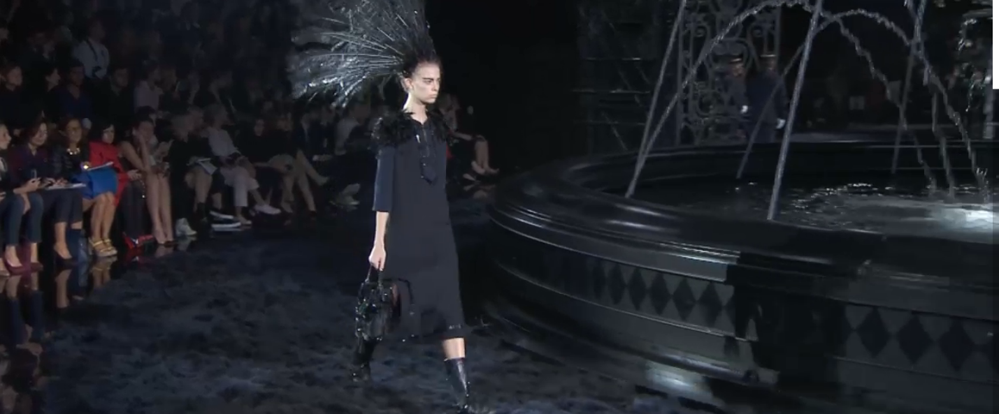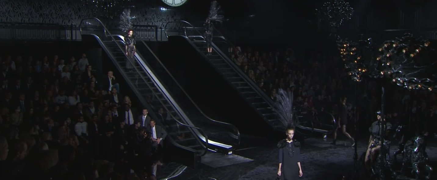 Rumors of the star artistic director’s departure had been swirling for some time in the small fashion sphere. The doubts were confirmed by the pessimism and sadness of the Spring/Summer 2014 collection presented this morning in the courtyard of the Louvre on the last day of Paris Fashion Week. A black invitation, and an extremely somber decor echoing all the old elements of previous shows (a carousel, a fountain, elevators, the famous escalators, a corridor of doors and a clock recalling the departure of the Vuitton train).