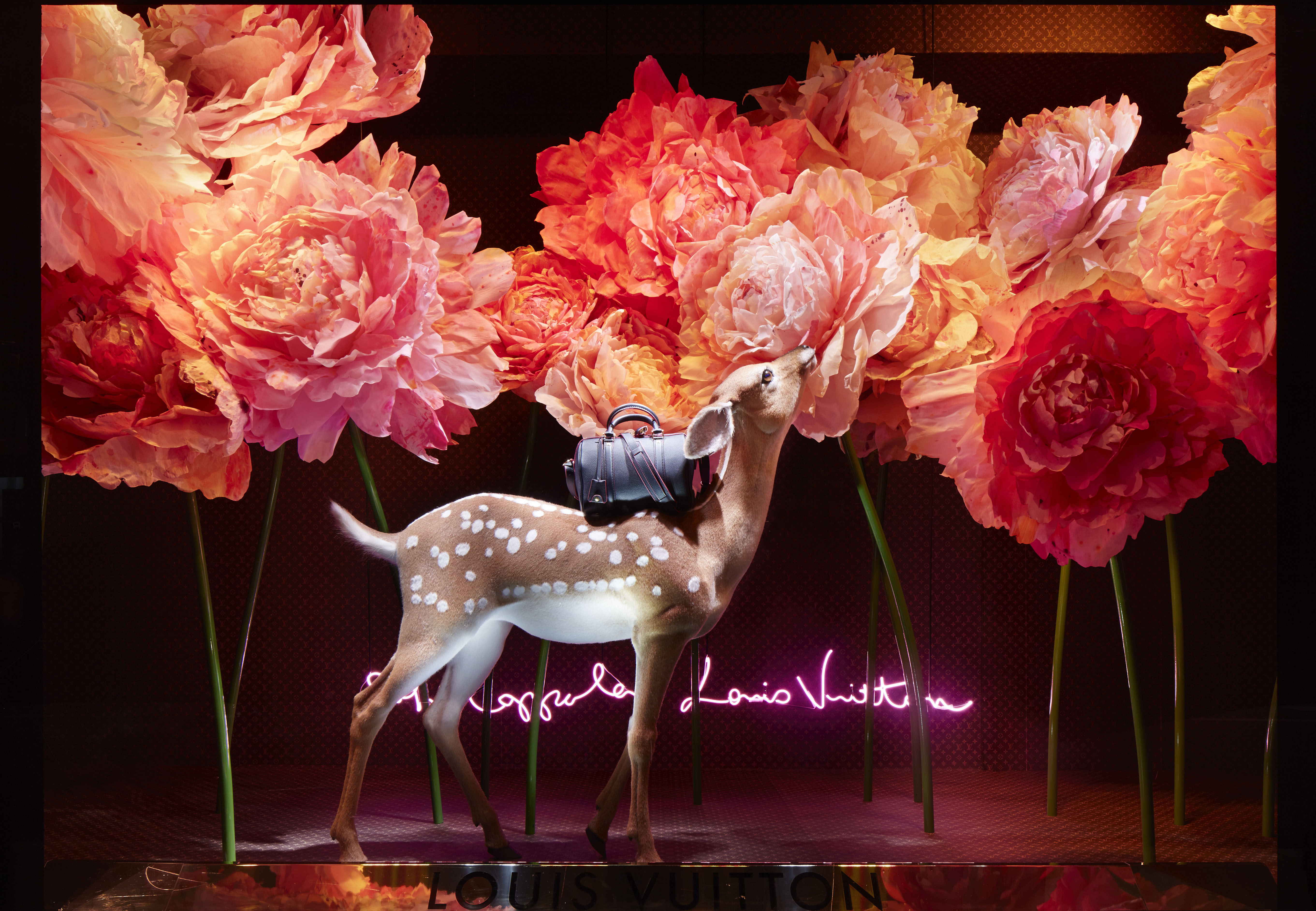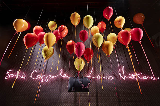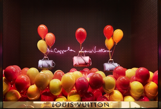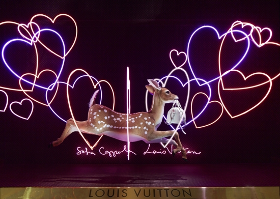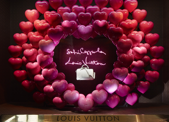 From now until October 26, all the windows at Le Bon Marché Rive Gauche will be dedicated to the House of Louis Vuiton. Sofia Coppola brought her scenographic eye to the staging and design of these exceptional window displays. Big, shiny balloon hearts, glossy cherries, heart-shaped neon lights and giant peonies, embellished with the Louis Vuitton Monogram. In the midst of this enchanting decor, young deer gambol about carrying a luminously colored SC bag.